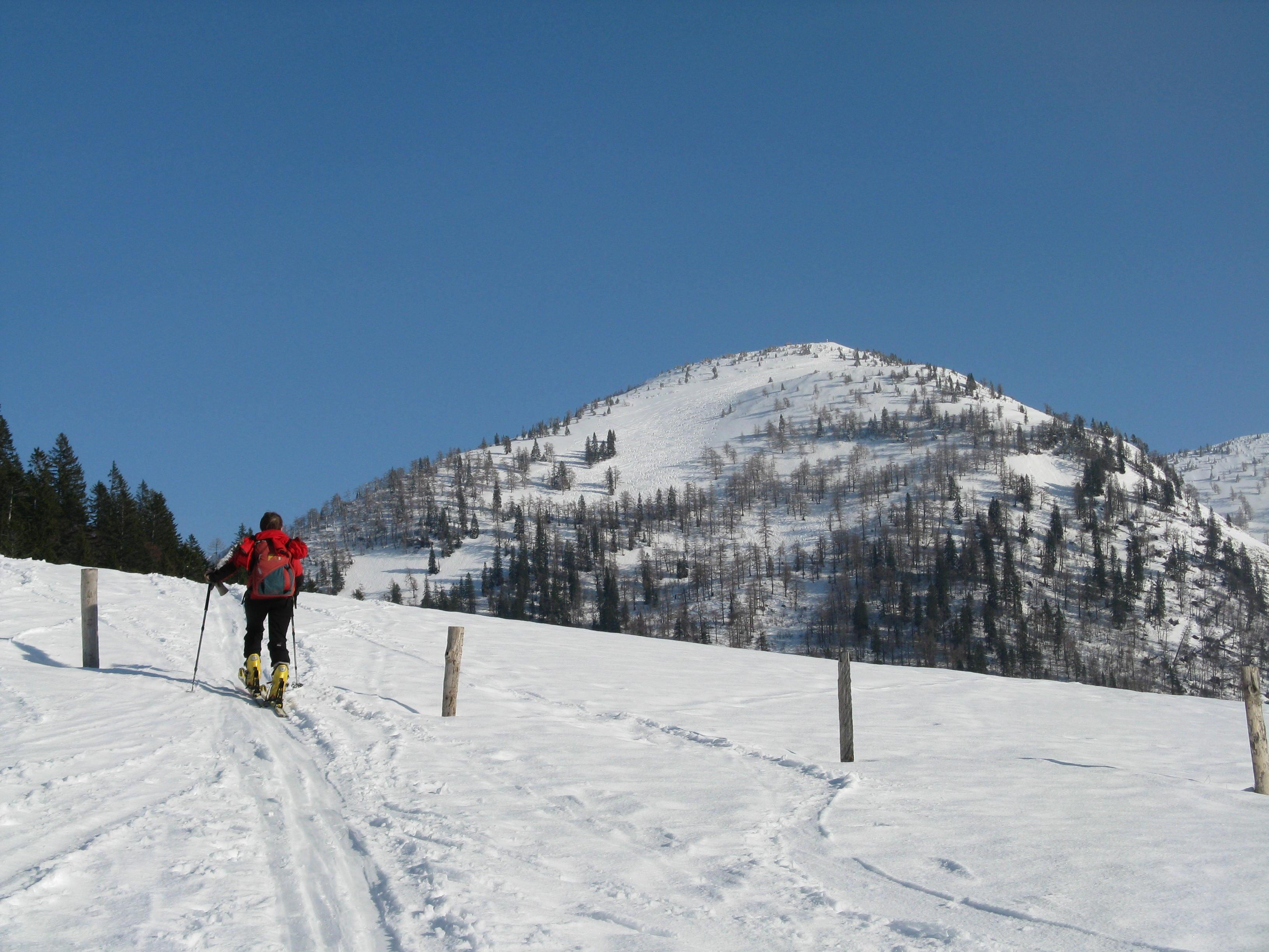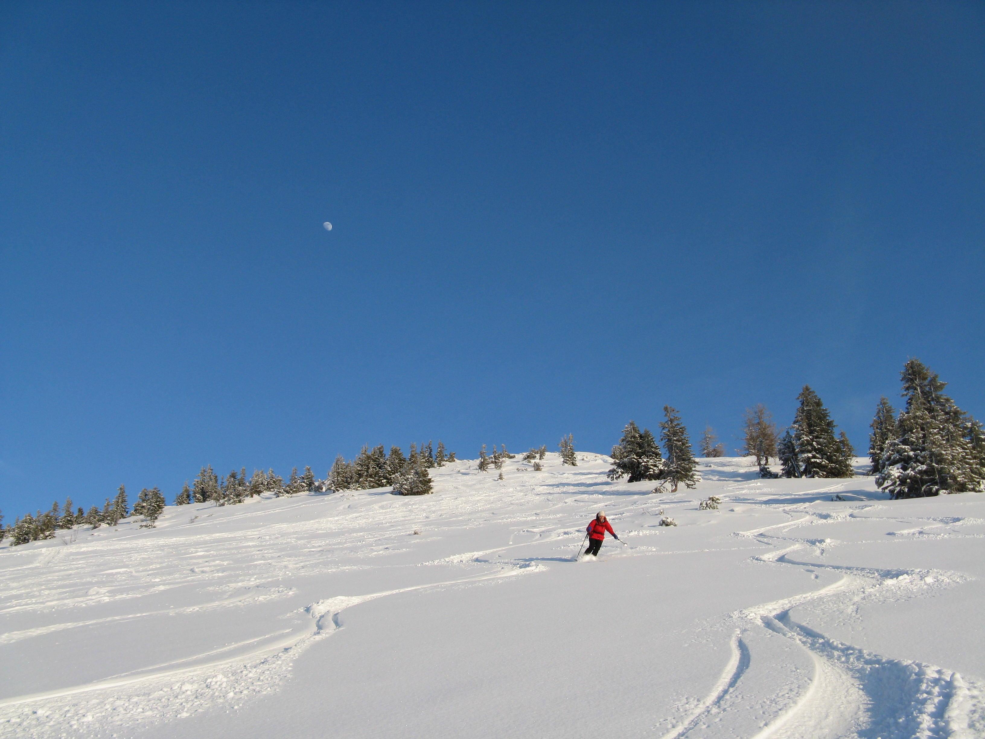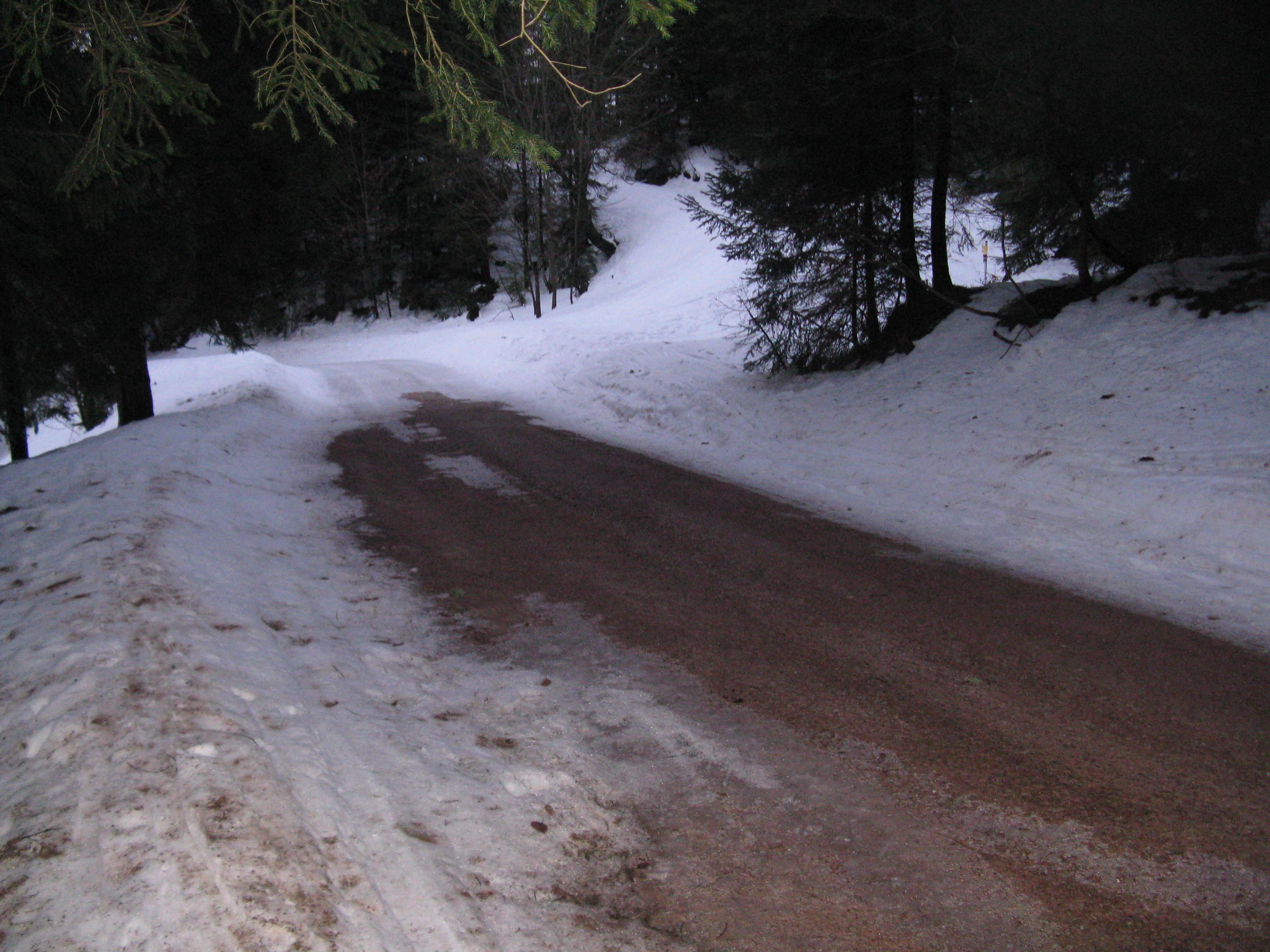 Osterhorngruppe Heute nachmittags vom nebeligen Salzburg auf den sonnigen Zinken.Straße bis Abzweigung Gruberalm teils aper ,teils Eislaufplatz,danach durchgehende Schneedecke.Im Gipfelhang. ca 10 cm gut zu fahrender Pulverschnee au f tragfähigem Harschdeckel.Die Abfahrt von der Genneralm au f der Straße nach Lämmerbach war bei untergehender Sonne und sinkender Temperatur eher eine Hämorrhoidenschaukel (alte gefrorene Fußspuren ec.)