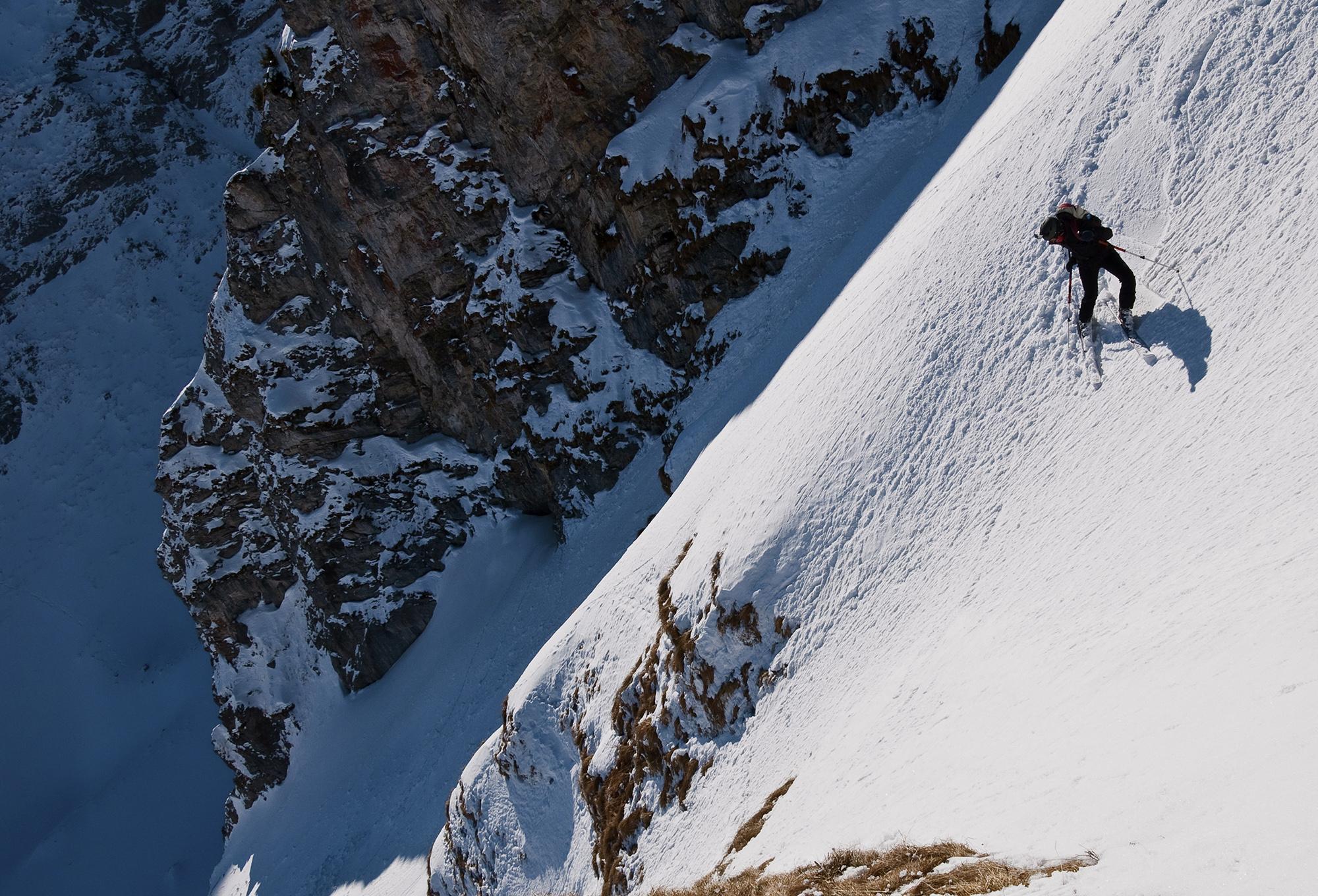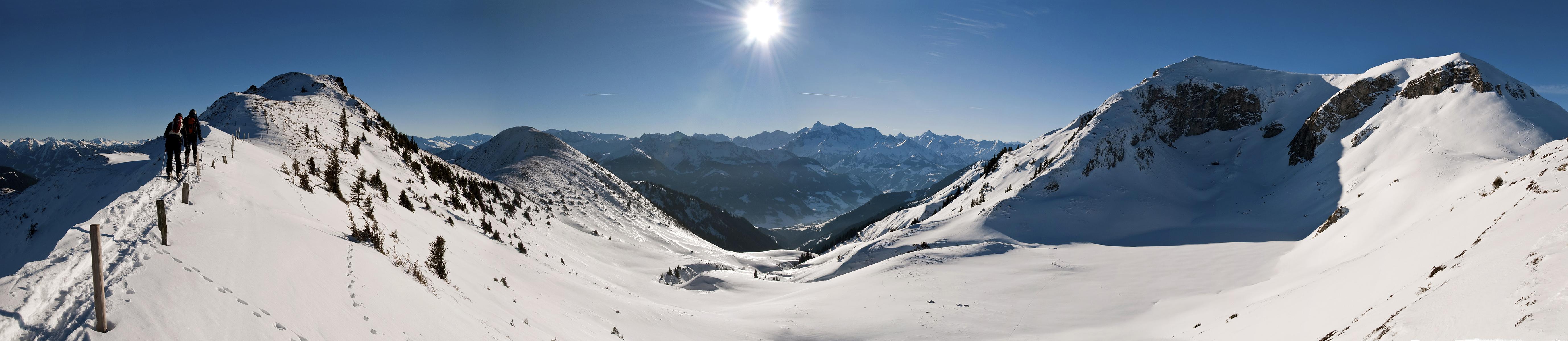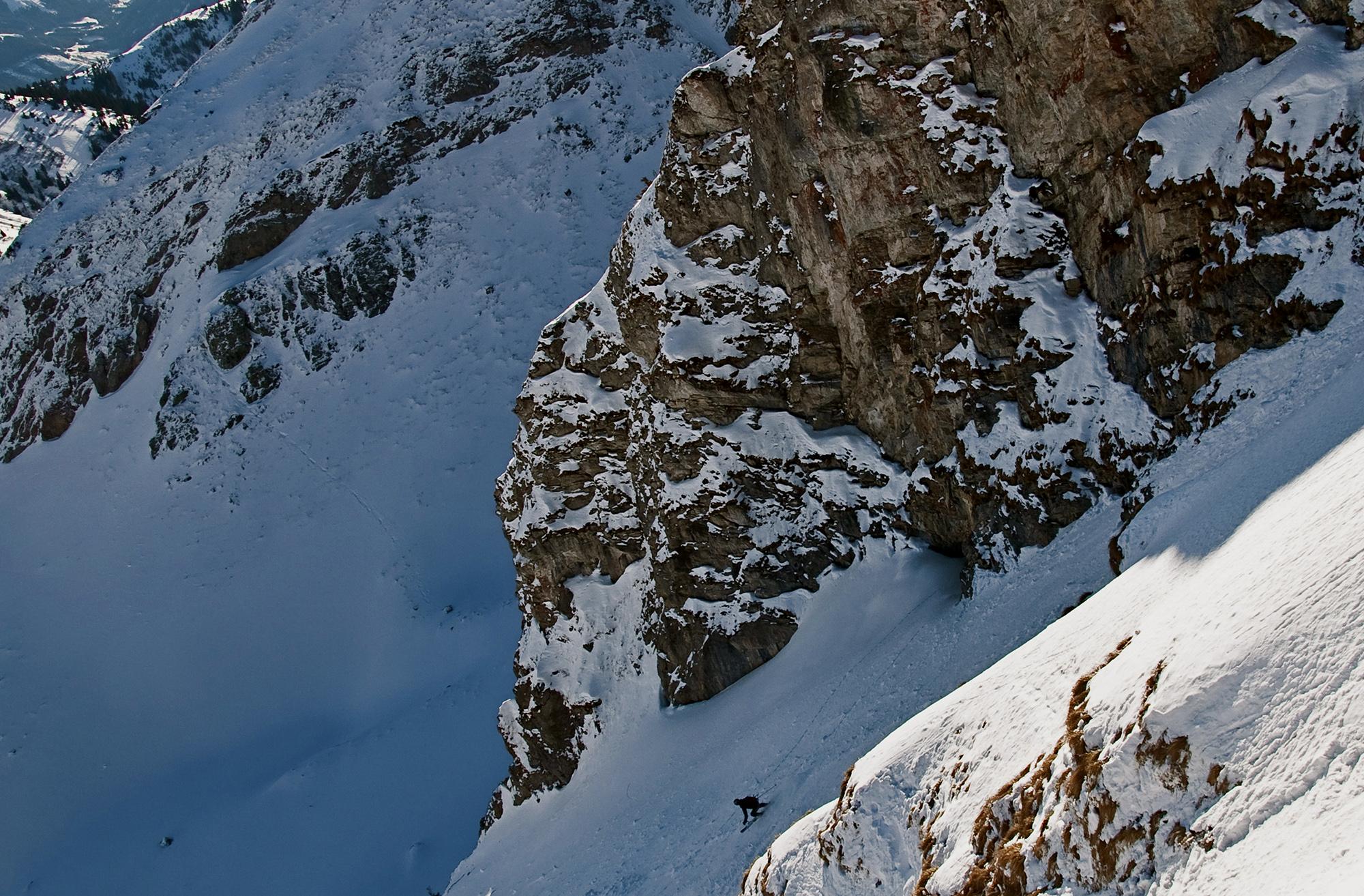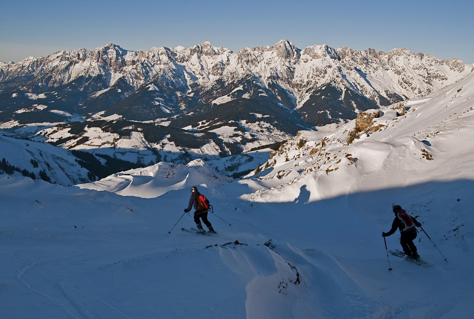 Es war heute noch kalt genug, um die steilen Ostseiten der Pinzgauer Grasberge zu befahren. Auch die kurzen Steilabfahrten vom Hundstein haben nur eine geringe Neuschneeauflage auf meist tragendem Harschdeckel. Am Hochkaser finden sich westlich der Hauptabfahrtsspuren unverspurte Pulverschneehänge.