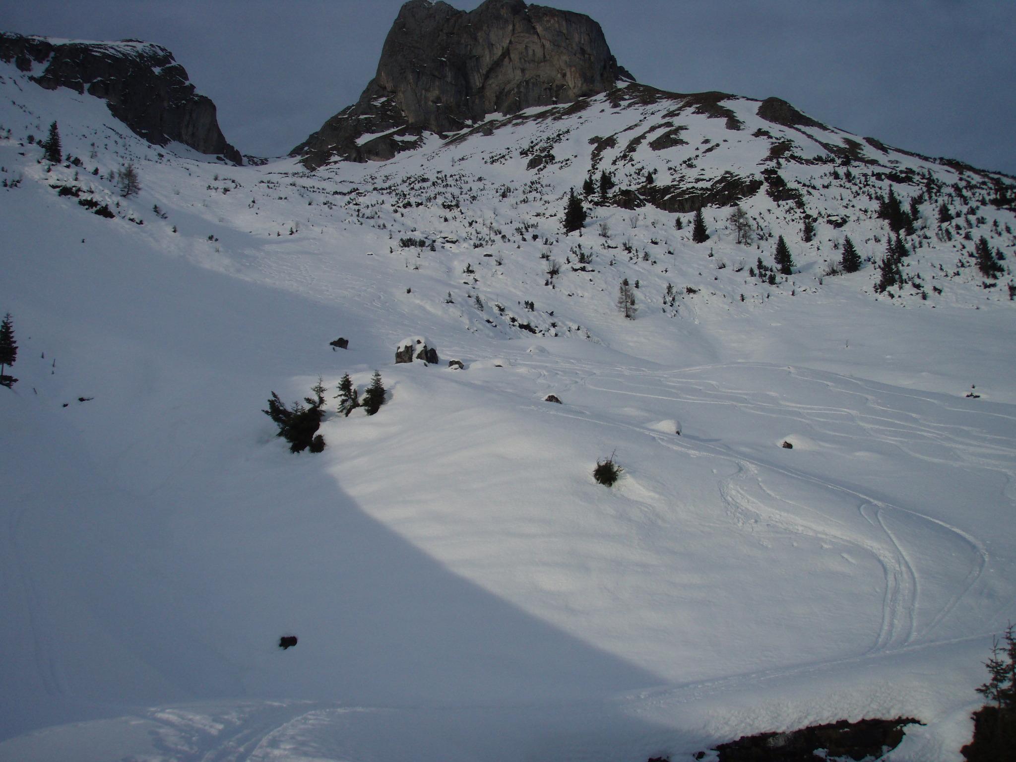 Aufstieg gegen Mittag von Wengerau über die Tauernscharte und direkt auf den Brietkogel und rüber zur Schartwand. Dort hats dann mal extrem gestürmt. Abfahrt in die Eisgrube und Aufstieg zum Eiskogel. Dort war der Wind dann erträglicher. Abfahrt überraschend in hervorragendem Schnee. Bis zur Tauernscharte meist verwehter Pulver, tw. plattig brechend. Der ganze Eiskogelhang ist extrem stark abgeblasen. Ab der Tauernscharte immer feuchter werdende Schneedecke, die im oberen Abschnitt aber perfekt zu befahren war.