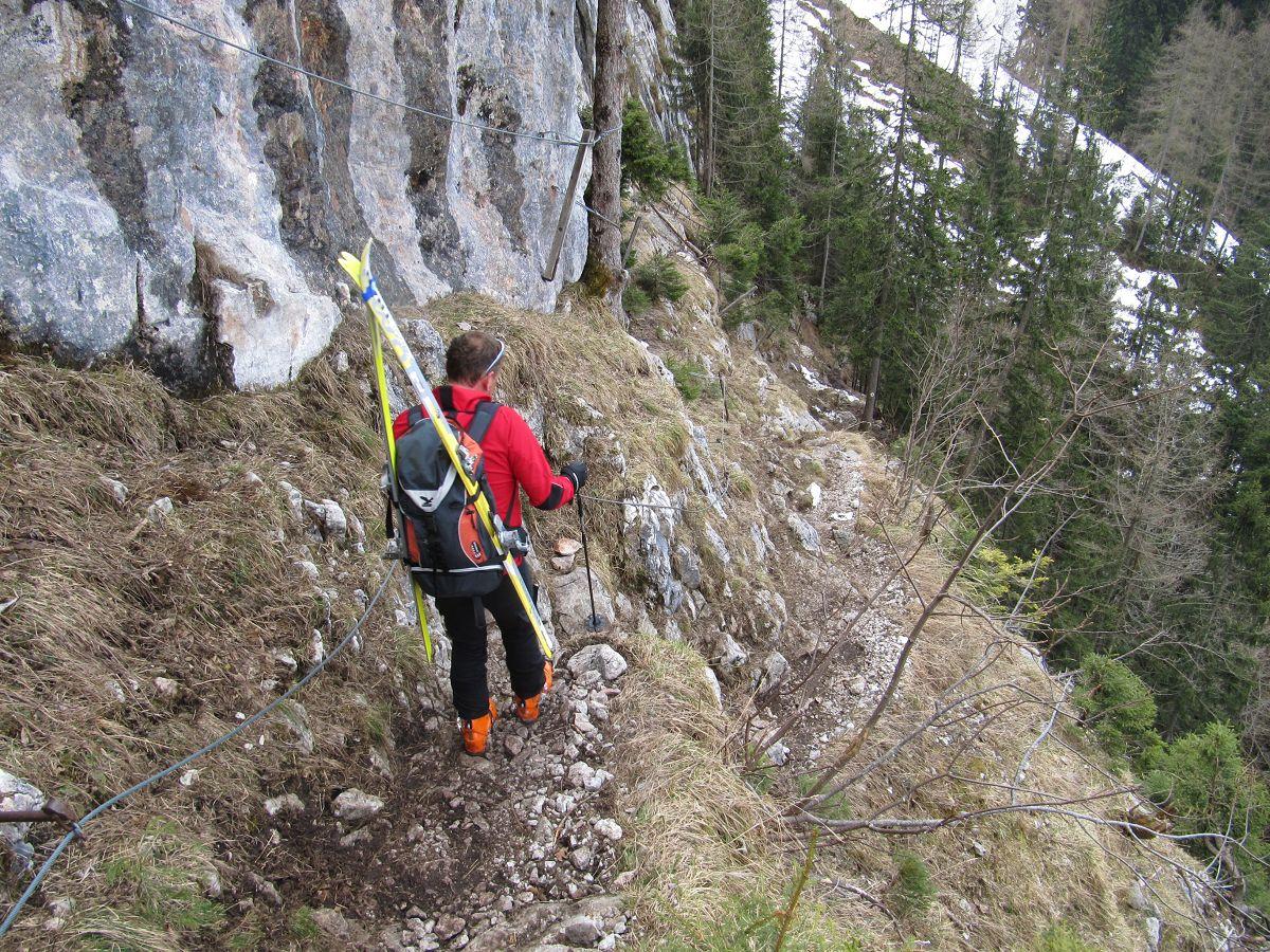 Bei der Abfahrt nach Hinterbrand gegen Mittag schöner Firn, die Einfahrt ins Alpeltal noch hart, aber schon griffig. Schnee bis kurz vors Wandl, knapp 20 min. müssen die Ski getragen werden.