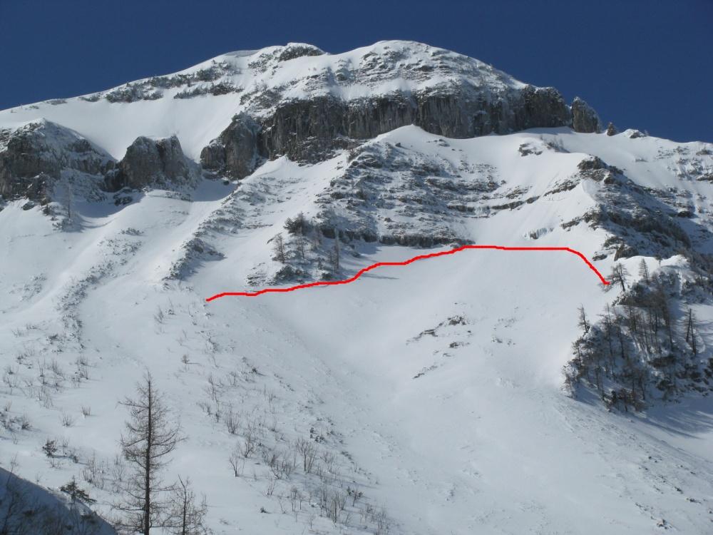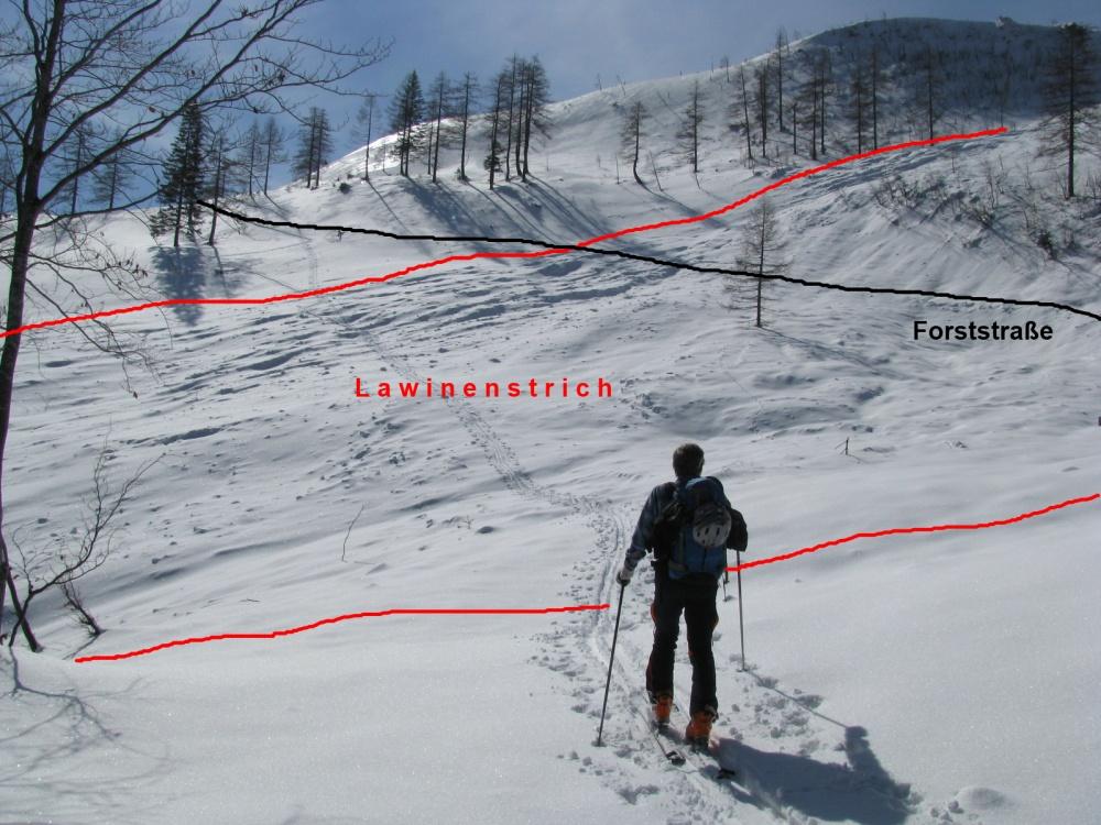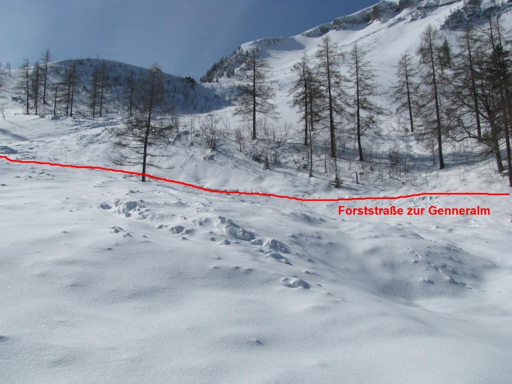 Diese oft gefährliche Stelle beim Anstieg zur Genneralm wird von vielen TourengeherInnen absolut unterschätzt. Noch dazu wird von einigen Uneinsichtigen bei dieser „eh nit gfährlichen Tour“ lt. Kontrolle der Bergwacht kein LVS Gerät mitgenommen oder nicht eingeschaltet.