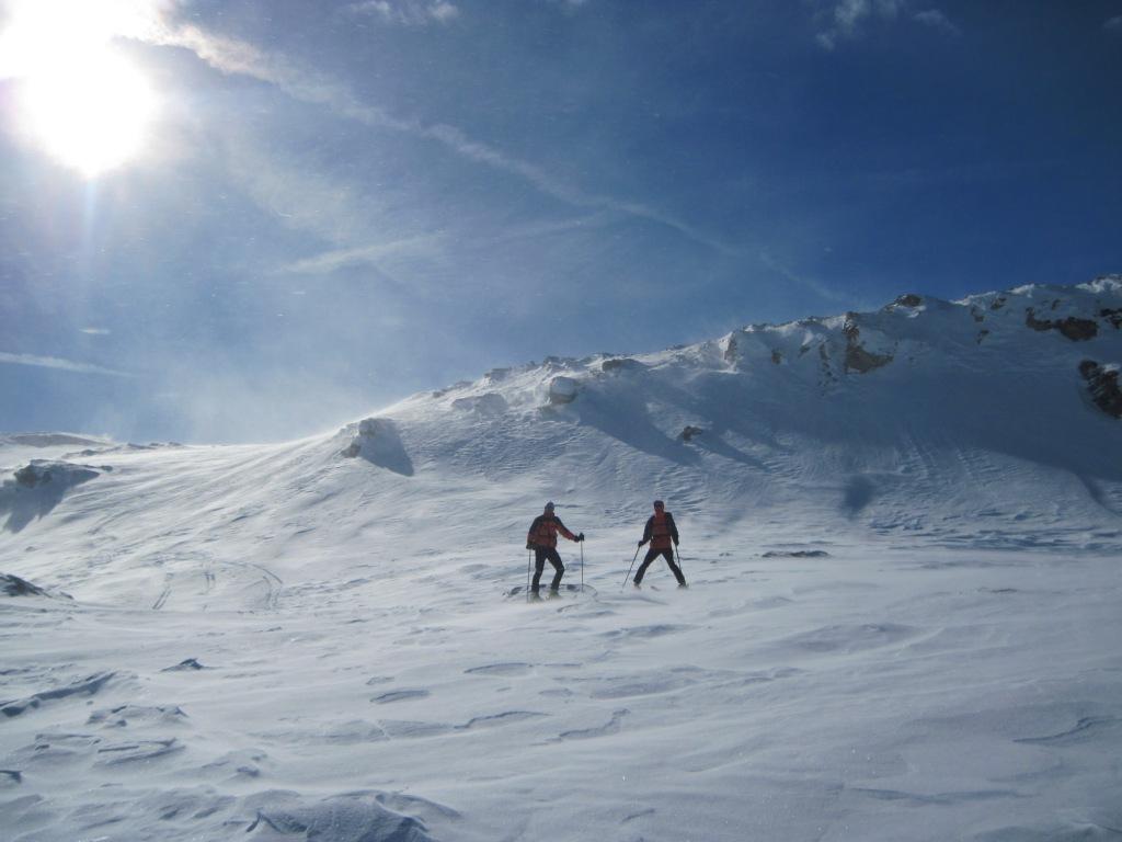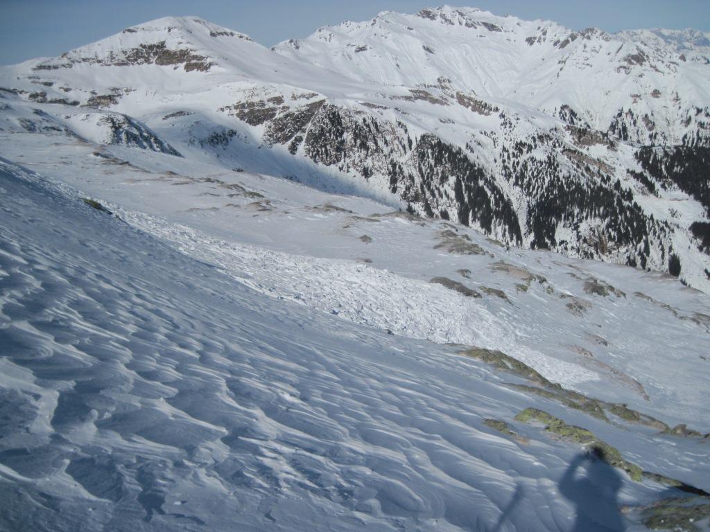 Beginn des Aufstieges über`n Wolfstadl in Richtung Gadaunerer Hochalm um 8 Uhr. Breitfeld-kogel sowie -Boden beinahe nichts vom Fön zu merken. Wir wurden jedoch am Silberpfennig beinahe verblasen. Wie laut Lawinenlagebericht viele Einwehungen in Kammlagen Nordwest bis Nordost. Sonst im Bereich Erzwies extrem abgeblasen und beinhae keine Schneedecke. Bei der Abfahrt in Richtung Einfahrt Knappensteig (ca. 2300Hm) beobachteten wir zwei Lawinenabgänge. Alle in angegebner Exposition aber Hangneigung nur zwischen 30 max 35 Grad. Zeitpunkt jeweils 12:00 Uhr. Hänge nach subjektiver trügerischer Einschätzung nicht übermäßig eingeweht. Wenn nicht das Wissen und der Instinkt über die Schneeverhältnisse (Lawinenlagebeicht und richtige Einschätzung u.a. durch den Fönsturm) wären wir fast zu Akteure geworden. Restliche Abfahrt durch bewaldetes Gebiet mit teilweise schönem, sicheren Pulverschnee. "Sweet Home - Angertal"