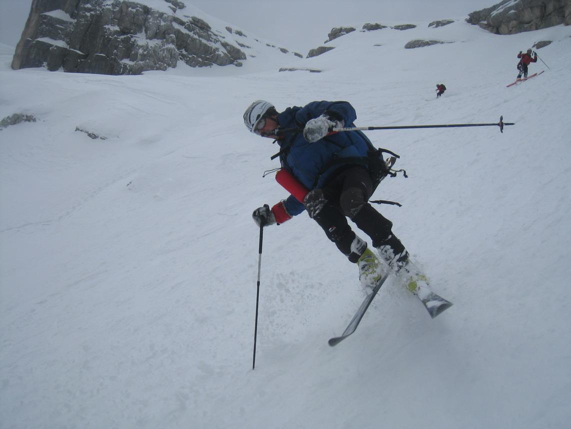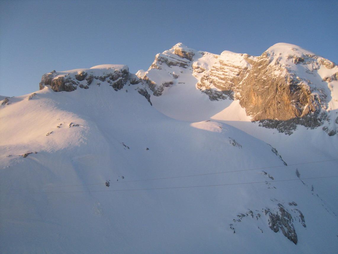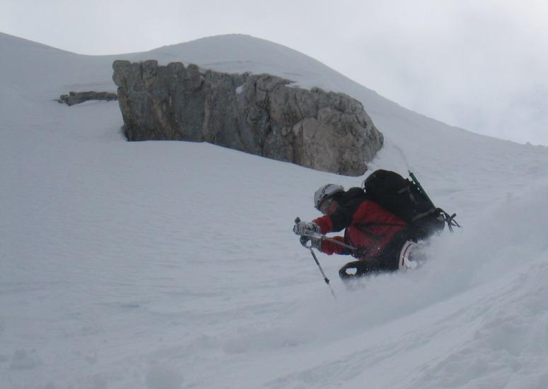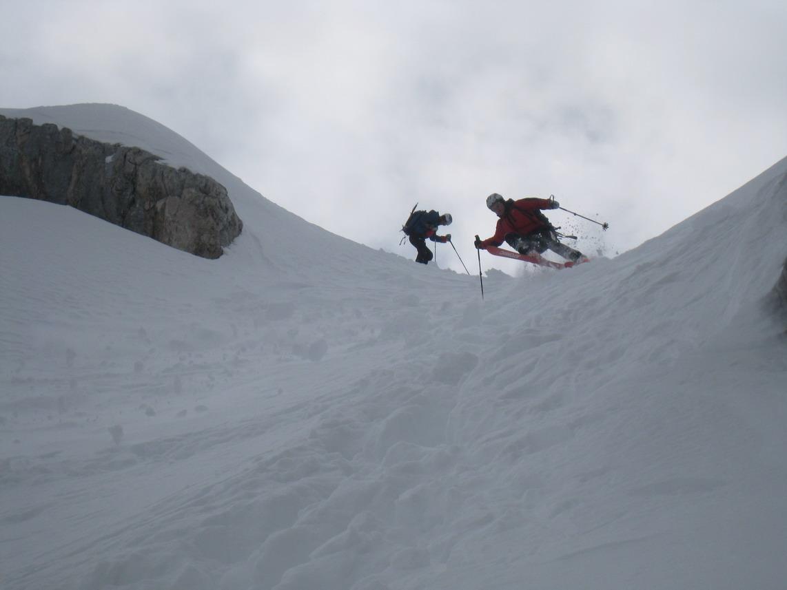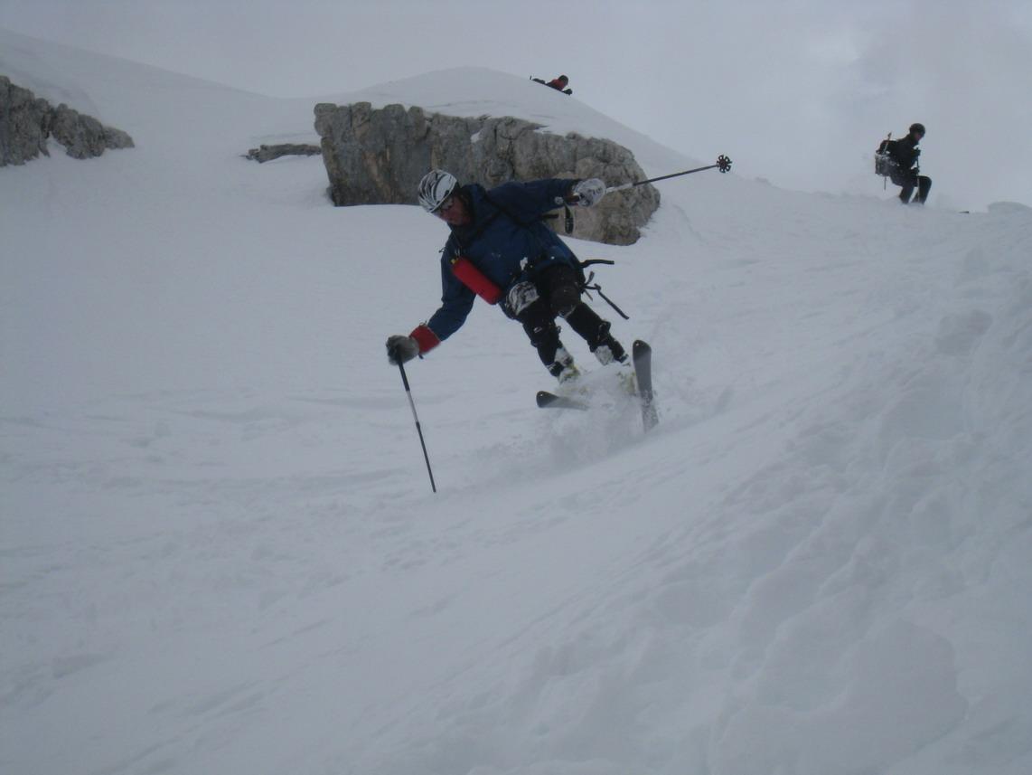 Trotzdem ein tolles Erlebnis in einer traumhaften Kulisse. Auch der Schnee war für diese Jahreszeit recht gut. Am Gipfel leider zu gut. Im oberen Teil windgepresst im Mittelteil Pulver und Bruch und ganz unten Firn.