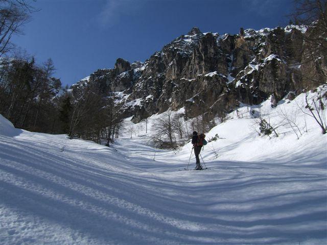 Vom Wanderparkplatz in Bayrisch-Gmain sind die Ski ca. 20 Minuten zu tragen. Dann nur mehr bei der Bachquerung 1x abschnallen. Auch im Wald noch viel Schnee und gut zu fahren. In der Rinne liegen natürlich massig Lawinenknollen, welche aber durch die milden Nächte keine Probleme bereiten da nicht hart gefroren. Aufstieg und Abfahrt sehr gut möglich. Der größte Teil des Schnees in den Flanken dürfte schon unten liegen, dennoch Gefahr duch Lawinen von der Seite. Am Kamm links und rechts der Rinne sowie am Ausstieg hängen noch überall Wechten die im Falle eines Abbruches natürlich direkt in der Rinne landen!