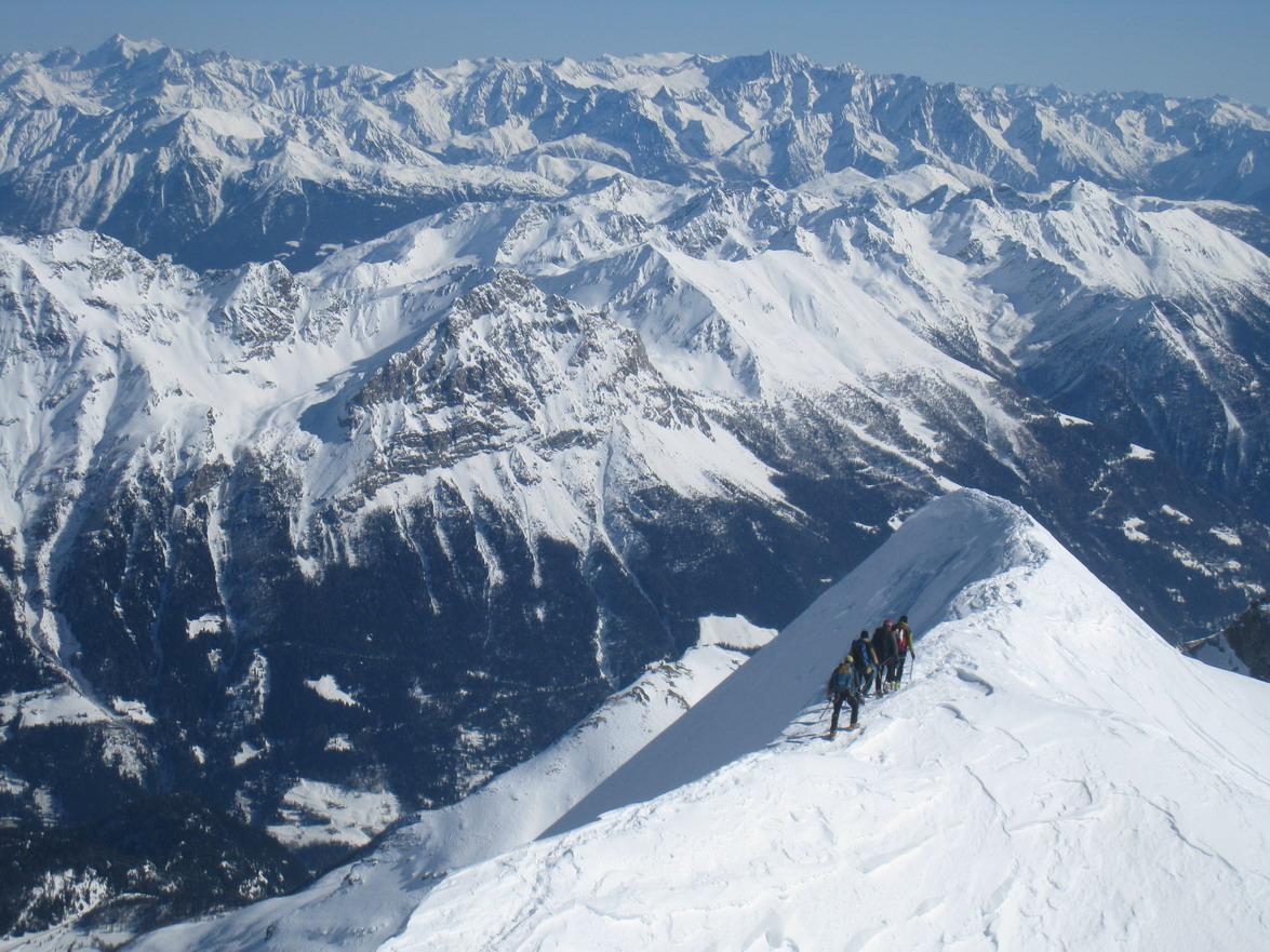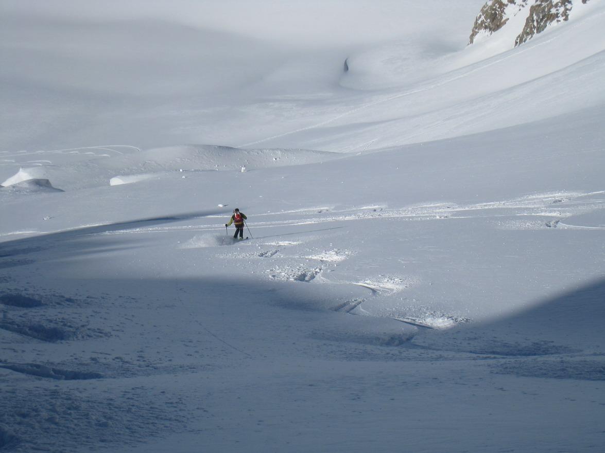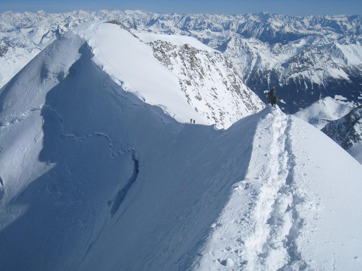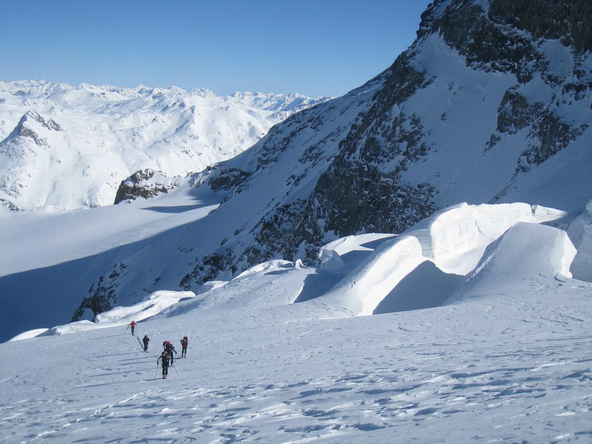 Unsere heurige firmeninterne Schitour hat uns heuer in die Schweiz verschlagen. Mit 8 Mann waren wir perfekt auf 2 Autos verteilt und konnten am Gletscher mit 2 4er Seilschaften gehen. Vom Parkplatz mit der Bahn hinauf zur Diavolezzahütte, 2973 m (Übernachtung) und in der Früh dann in Südrichtung auf markierten verspurten, steilen Skigelände hinunter zum Vadret Pers (Pers-Gletscher) auf ca. 2800 m. Von hier zuerst flach, dann immer steiler werdend zum eindrucksvollen "Cambrena Eisbruch", und weiter über den langen steilen Nordhang zum Skidepot am Beginn des Ostgrates, 3731 m. Über den steilen Ostgrat hinauf zum Piz Palü-Ostgipfel, 3882 m. Wir hatten guteVerhältnissen und liessen die Gelegnheit natürlich nicht aus auch den Piz Palü Hauptgipfel, 3905 m mitzunehmen. Im unteren Teil hatten wir Pulver und weiter oben dann, wie meistens in dieser Höhe, harte Windgangeln die leider nicht so toll zu fahren waren, was bei diesem Gipfelerlebnis aber eher im Hintergund blieb. (den oberen Teil bis nach dem Durchschlupf sind wir entlang der Aufstiegsspur abgefahren weiter unten konnten wir dann den traumhaften Pulver genisesssen).