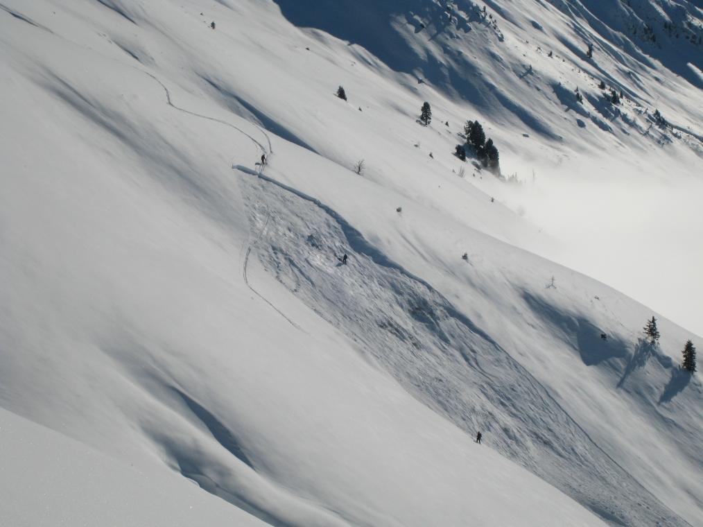Kitzbüheler-Alpen-Klassiker im Spertental, vom Parkplatz Unterer Grund (am Wochenende meistens voll, mindestens die Hälfte gehen aber gleich nach rechts aufs Brechhorn) über die Labalm auf den Tanzkogel, 2097 m. Wir sind noch westseitig abgefahren bis zur Reichaalm und wieder aufgestiegen, die Lawinenfotos entstanden etwa 100 m links oberhalb der Alm.