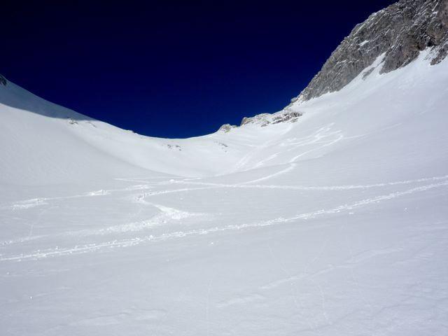 So um die Mittagszeit auf die Schnelle zur Taghaubenscharte (2136m). Wetter besser als angekündigt-typisch Föhn- zeitweise beinahe wolkenlos,leichter Südwind, auf der alten, massiven Schneedecke so zwischen 5 cm bis 15 cm Neuschnee; sonnseitig mit dünnem Harschdeckel, lässt sich aber tadellos fahren.!