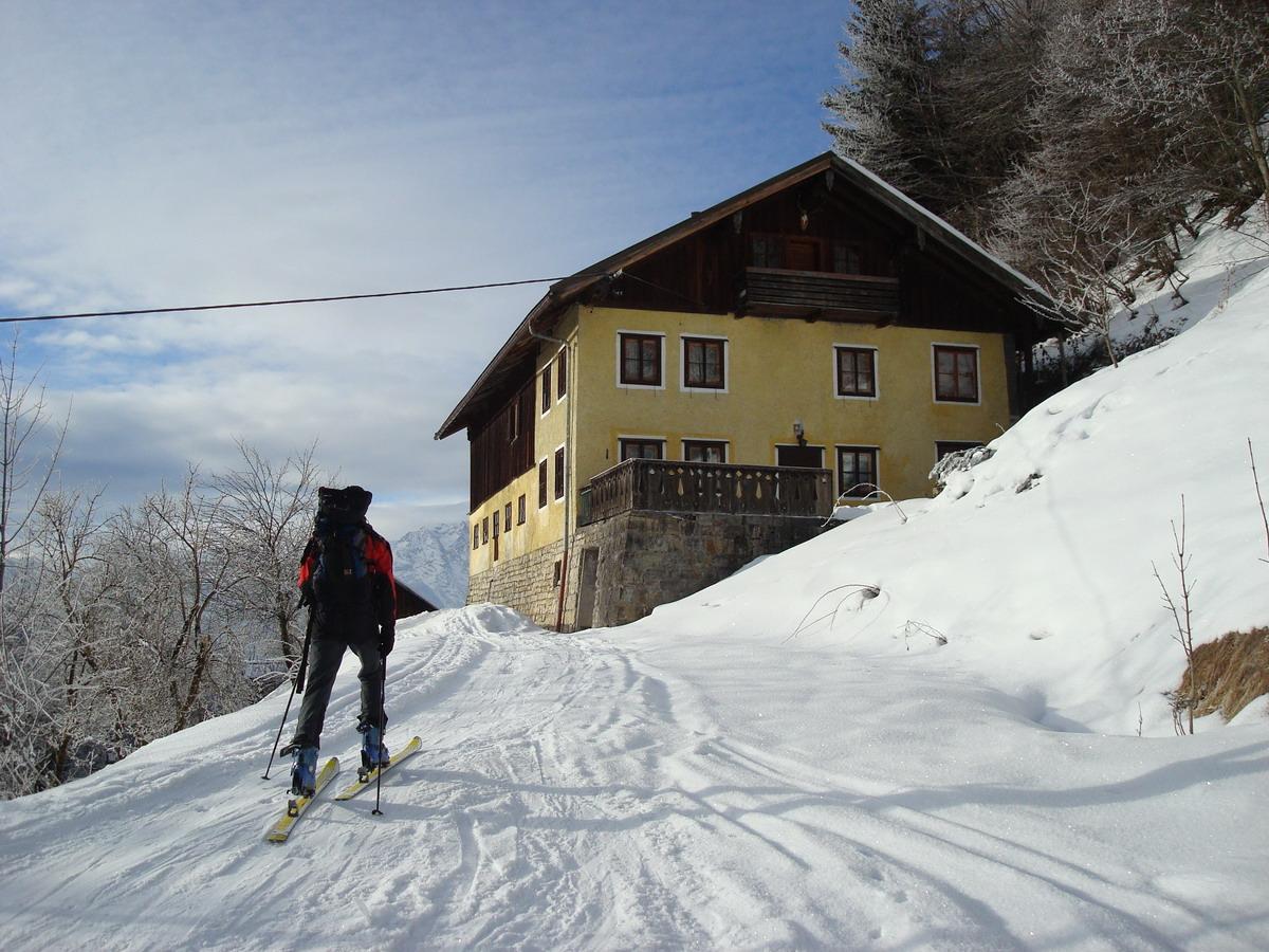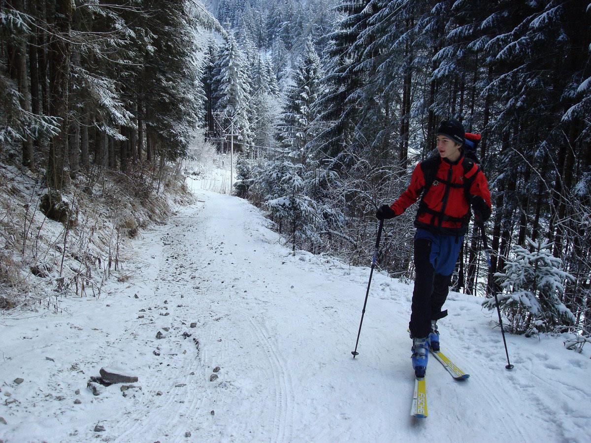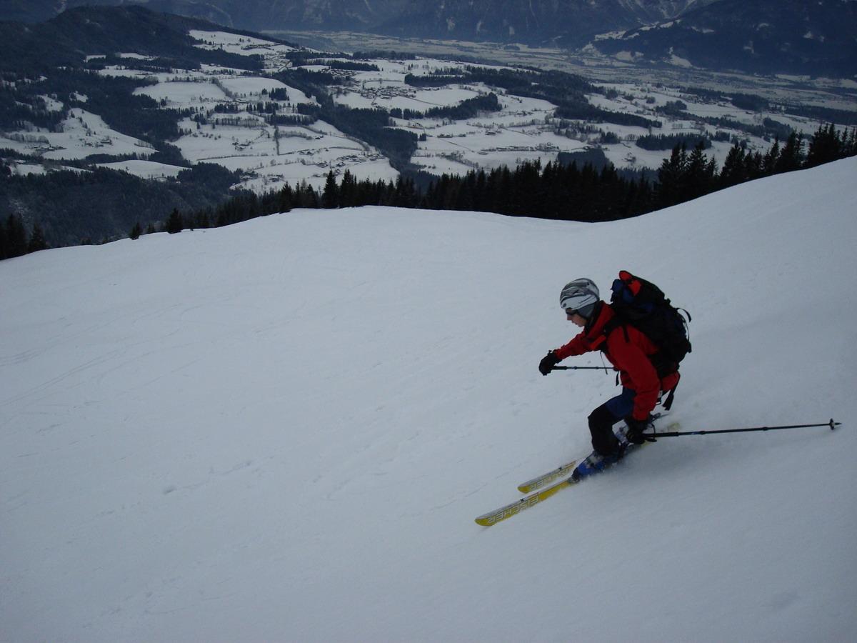 Derzeit fällt die Schitour von der alten Schule im Tauglboden auf den Schlenkstein nur unter die Kategorie "bedingt empfehlenswert": Die ersten 100 HM sollten die Schi besser hinauf und hinunter getragen werden, bis zum Haus Gseng nach ca.250 HM liegt im Wald gerade genug Schnee für eine einigermaßen akzeptable, jedoch nicht unbedingt schischonende, Abfahrt und darüber kann der Aufstieg und die Abfahrt guten Gewissens als Schitour bezeichnet werden. Auf die Besteigung des Schmittensteins haben wir aufgrund der Eisschicht verzichtet.