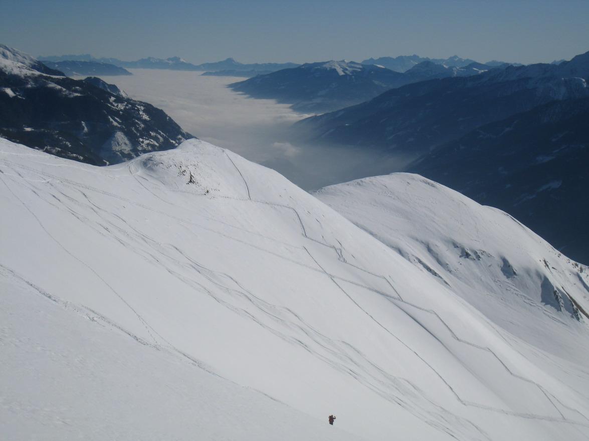 Schöne gemütliche Schitour ohne steile Flanken. Einzig der Gipfelhang sollte nicht unterschätzt werden. Im unteren Bereich pistenähnliche Verhältnisse über den Forstweg. Weiter oben dann schöne breite Hänge mit ca. 5cm Pulverschnee auf einem tragfähigen Harschdeckel.