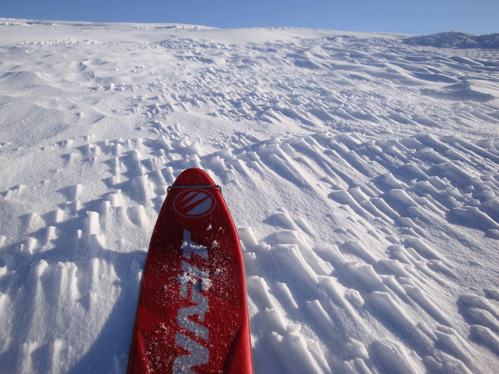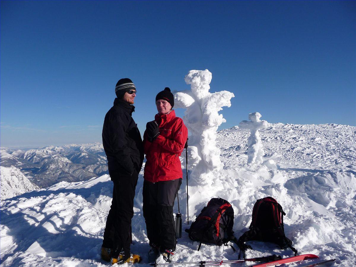 Der Aufstieg vom Hinterbrandparkplatz über die Jennerpiste zum Stahlhaus war problemlos. Bei der ersten Steilstufe zum Schneibstein hingegen ragten Steine und Latschen heraus. Oben wehte ein eisiger Wind. So blieben wir trotz grandioser Fernsicht nicht lange am Gipfel. Bei der Abfahrt gab es leider bei wechselnden Schneeverhältnissen Steinkontakt.