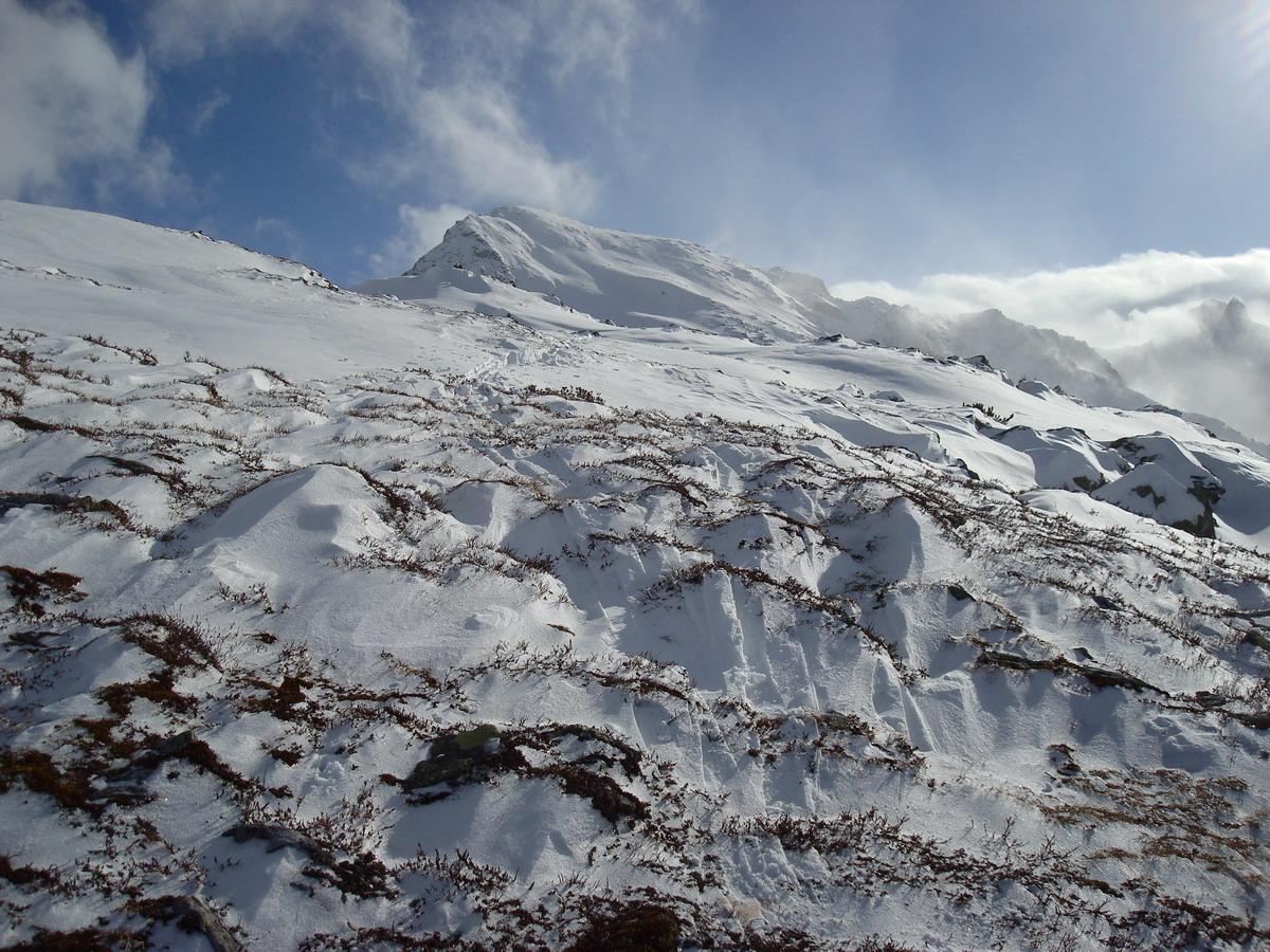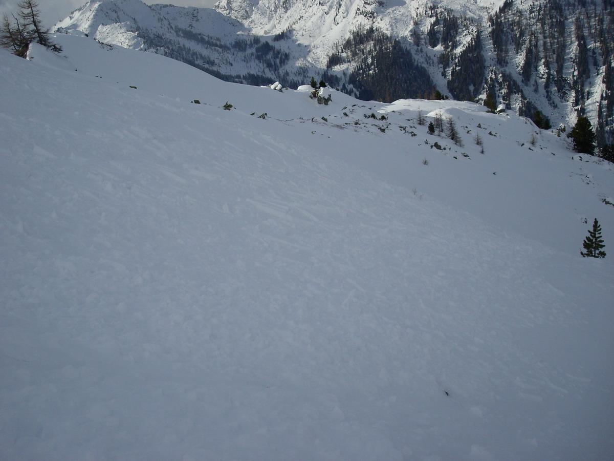Nicht ganz soviel Schnee wie erwartet fanden wir heute in den Schladminger Tauern vor. Während am Ausgangspunkt auf 1100 Meter etwa 30 Zentimeter lagen, wuchs die Schneedecke bis in den Gipfelbereich in ca.2200 m auf ca.60 cm an. Ab ca.1800 m wurde die Schneedecke vom Wind (vorwiegend aus Süd und West) stark bearbeitet.