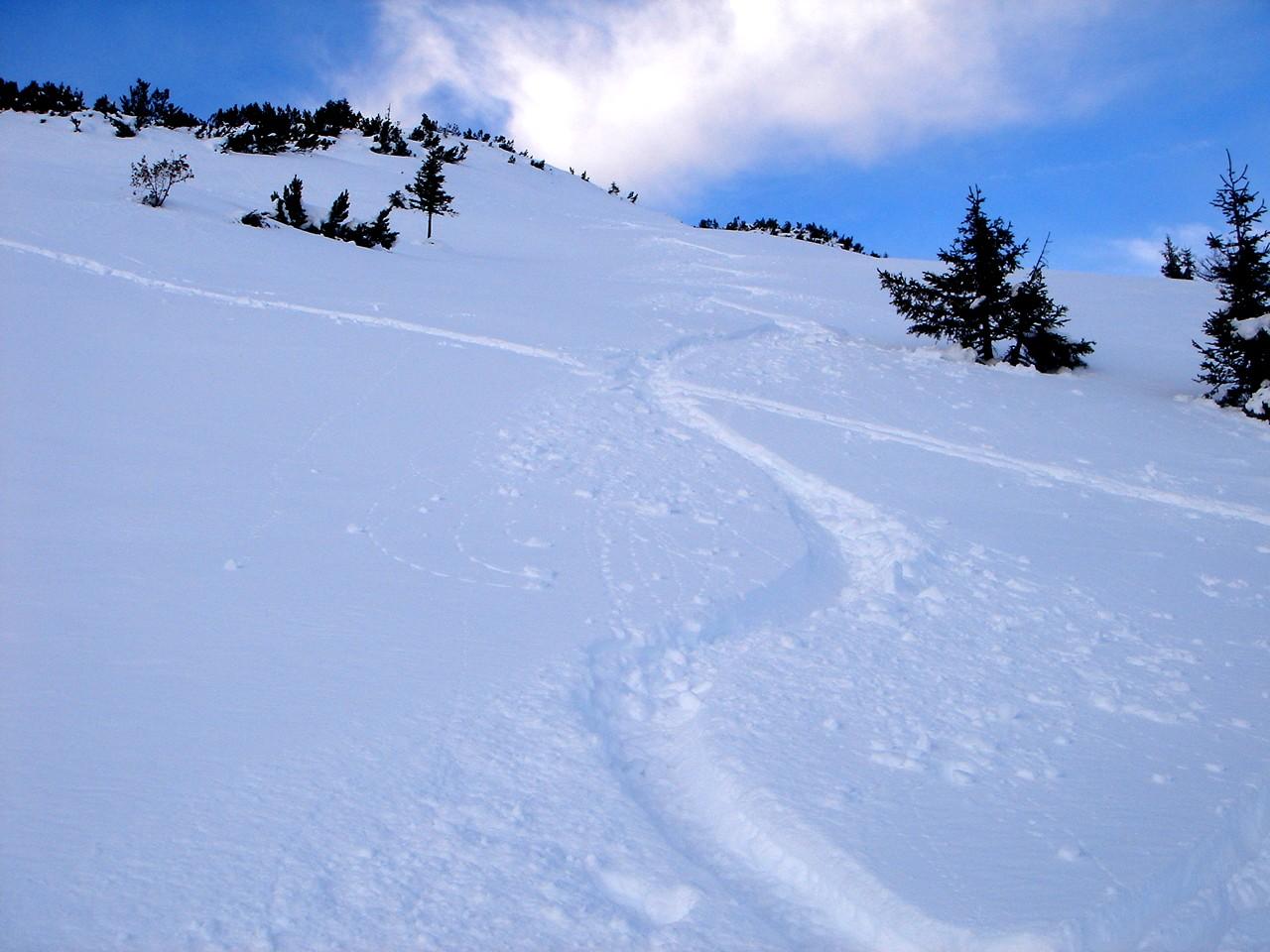 Nachmittagstour, halb Piste, halb Tour. Kunstschnee unten, ab 1700 m ca. 70 bis 90 cm Schnee. Sonnseitig patzig mit beginnender Kruste.