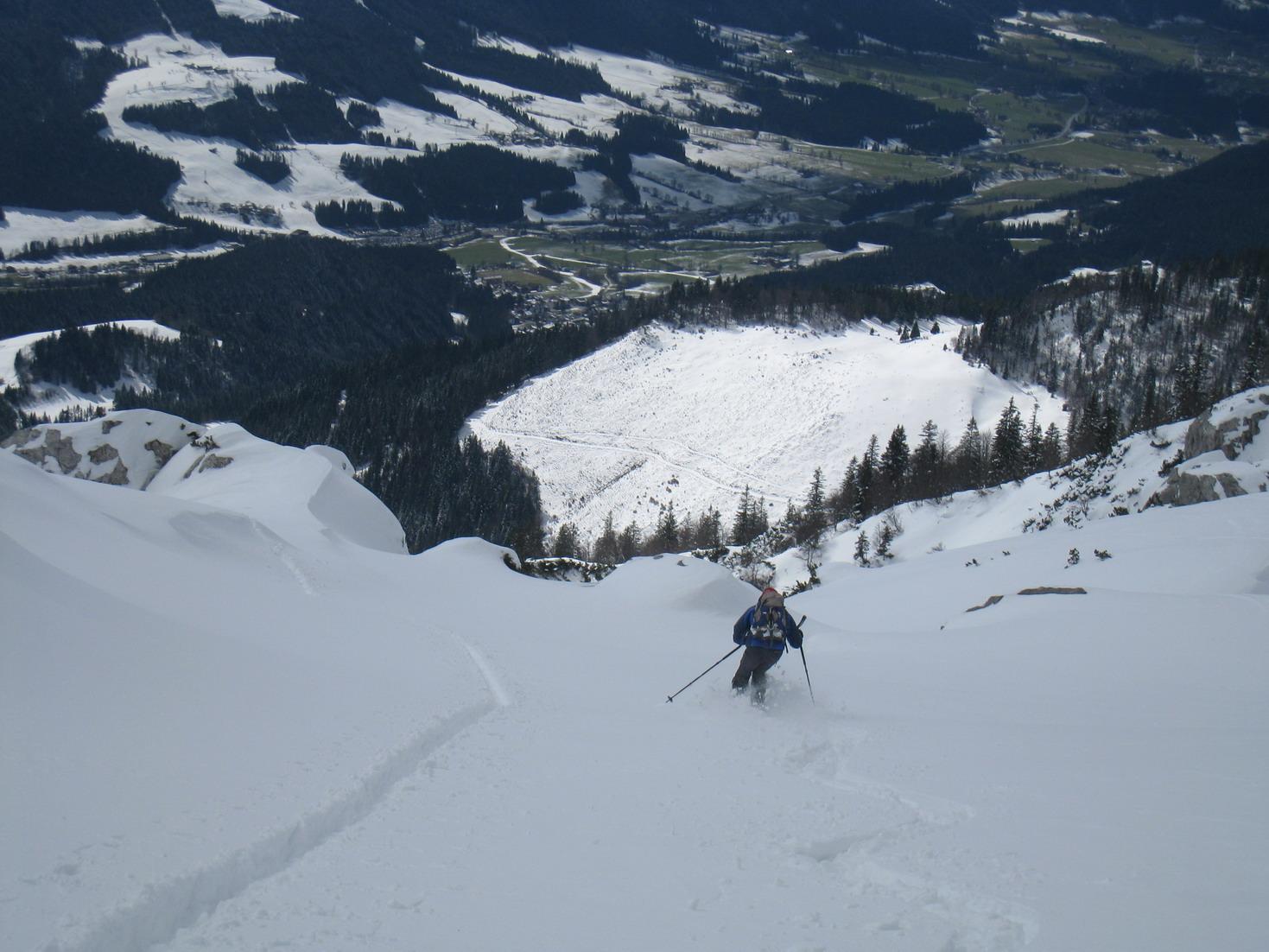 Wir haben ca 50-100hm unter der Scharte aufgrund der aktuellen Lawinensituation umgedreht. Zur Zeit traumhafte Bedingungen bis zur Wegscheid Hochalm. Von dort sind wir den Weg entlang abgefahren, was aber falls es nicht bald schneit sicher nicht mehr lange gehen wird.