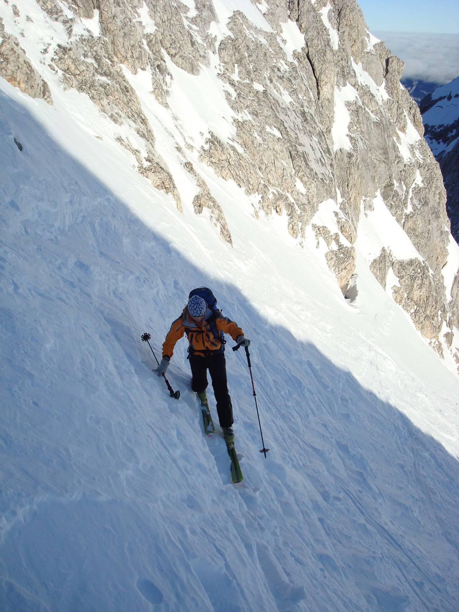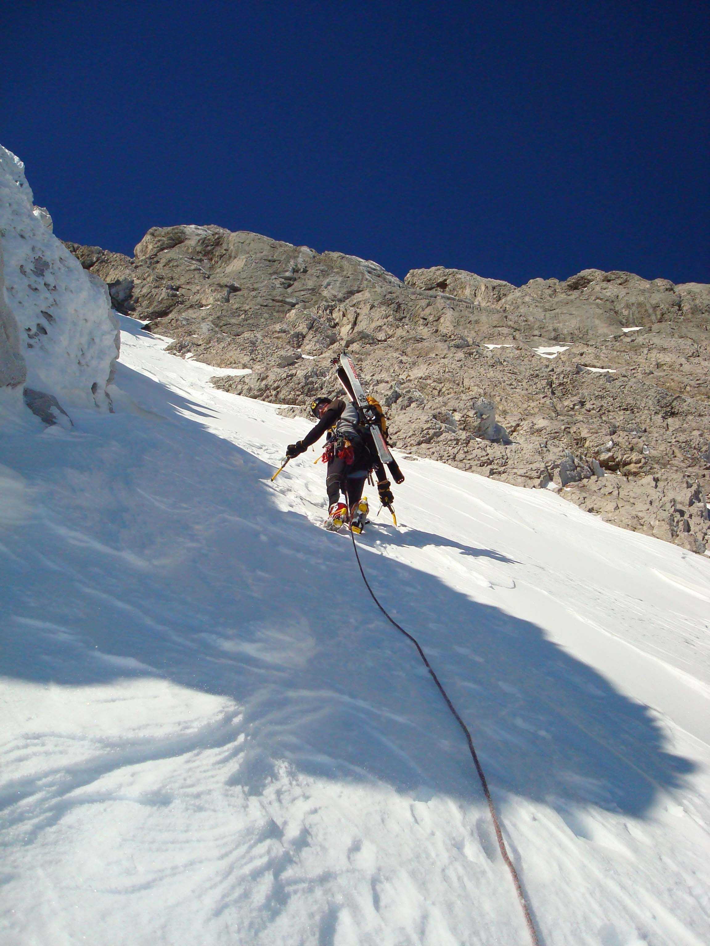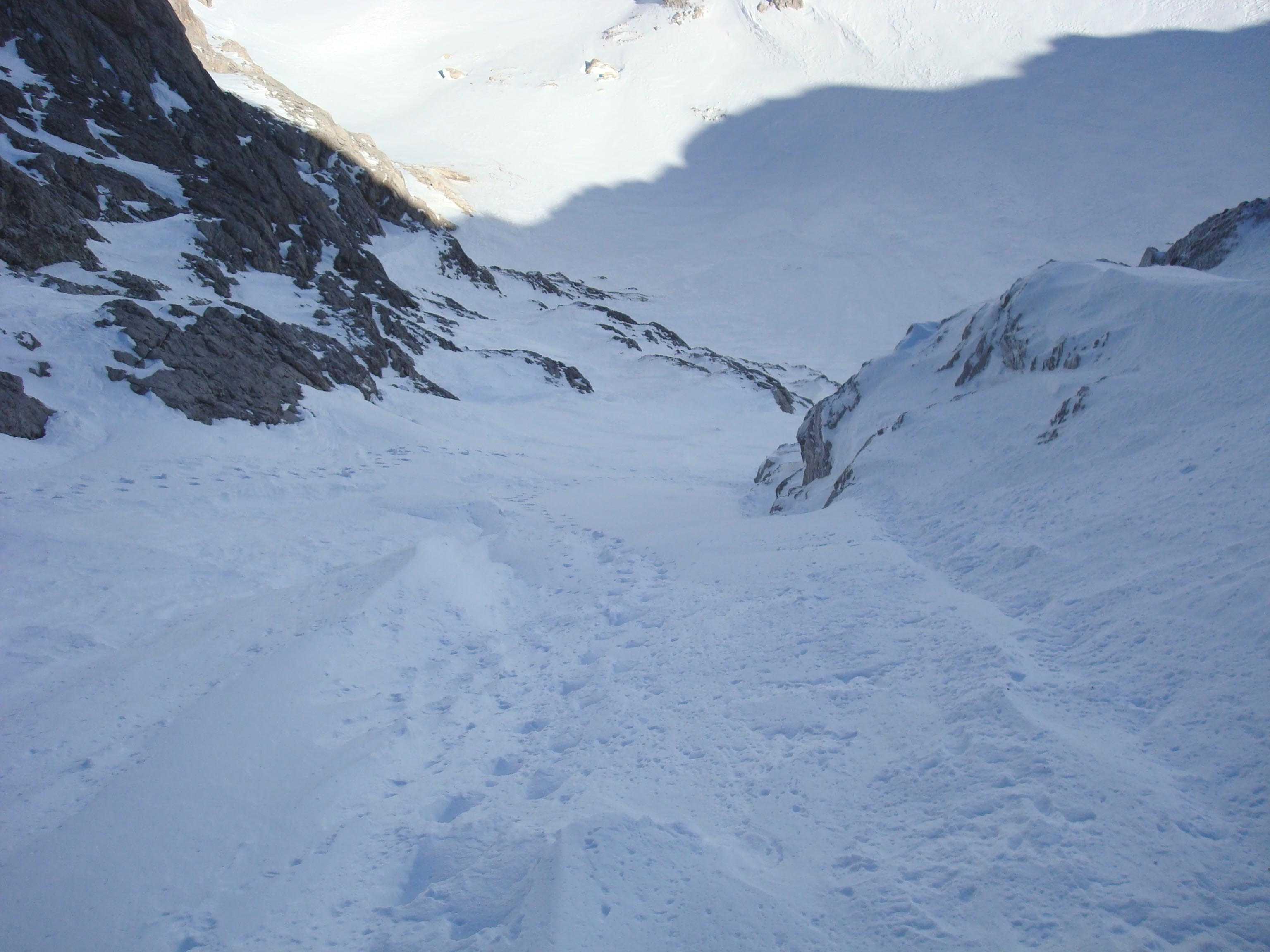 Rinne ist eingeweht und der "zuckerartige/griesartige" Schnee bietet kaum halt für Steigeisen und Pickel. Derzeit ist eine Abfahrt eher bedenklich - man bricht ein, windgepresster Schnee ist rutschig wie Kunstschnee. Für "idealere" Verhältnisse wird es noch ein paar Wochen dauern.
