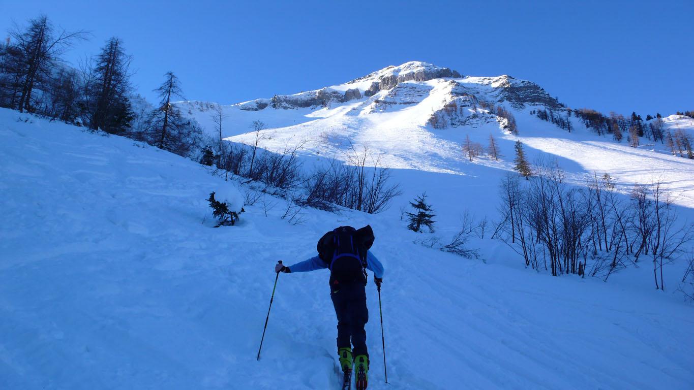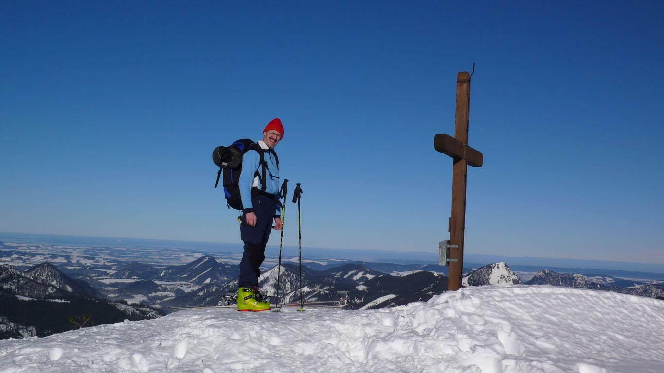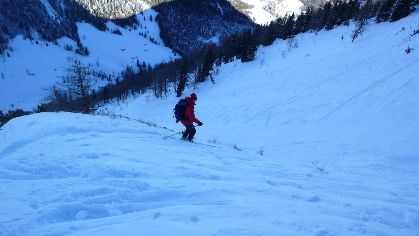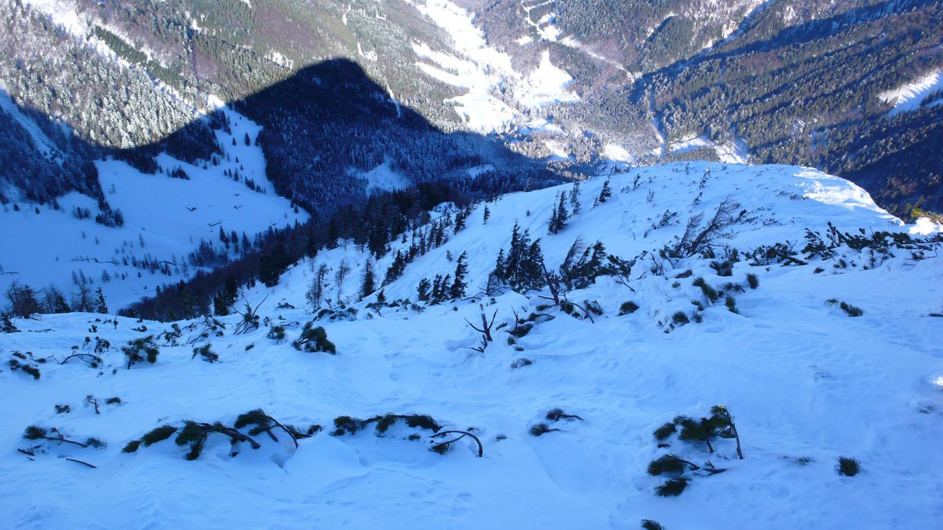 Schneeverhältnisse: Wie erwartet nordseitig Pulver, die Ostflanke teilweise mit einem ?Winddeckel? und südseitig haben die Sonne und die warmen Temperaturen in der Höhe dem Schnee schon sehr zugesetzt.