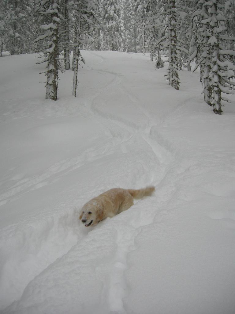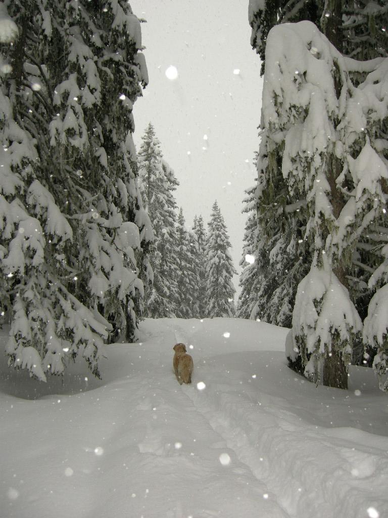 Auf der Almfläche ist der Schnee zu tief zum Abfahren, im lichten Hochwald rundum liegt immer noch 30cm Neuschnee auf genügend verfestigter Altschneedecke. Wunderbar zum Baumslalom!