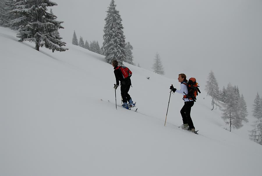 Die Wetter- u. Sichtverhältnisse erlaubten keine Gefahrenbeurteilung, daher stiegen wir in Werfenweng auf der gesicherten Piste zur Bischlinghöhe auf.