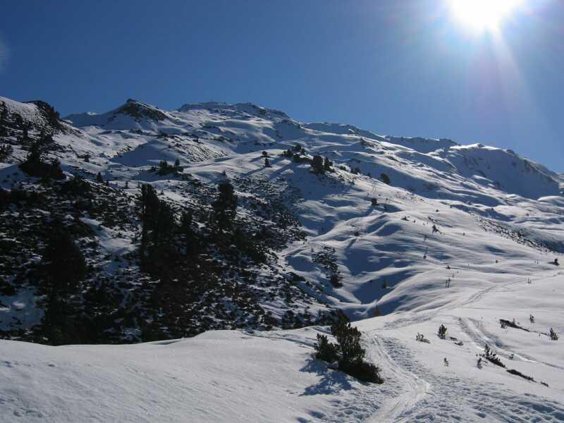 Aufstieg: Ca. 10 Min Ski auf teils aperer Piste getragen, dann durchwegs mit Ski; Schnee noch gefroren;