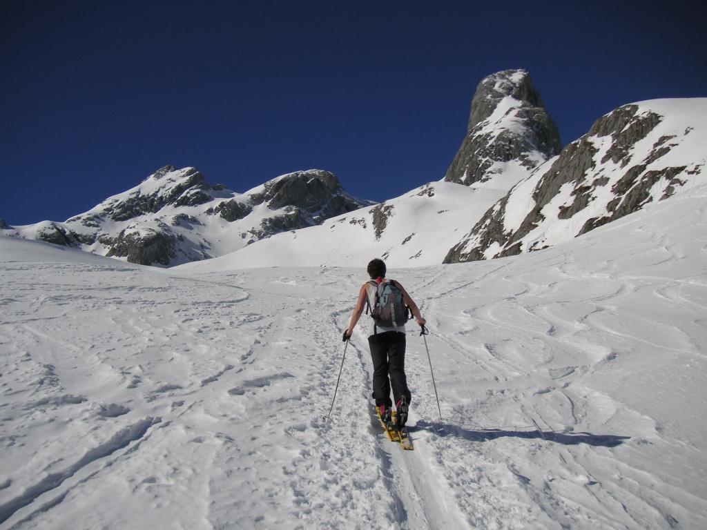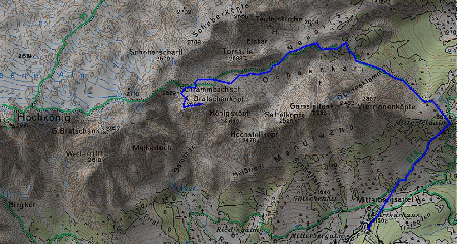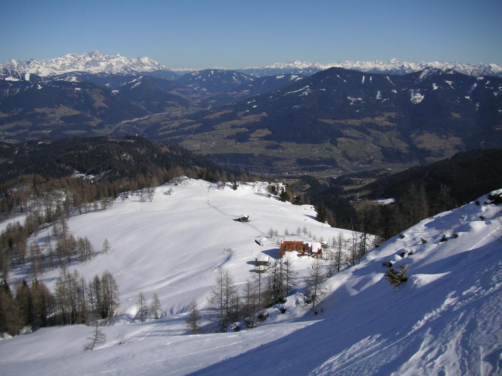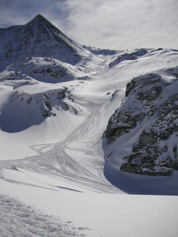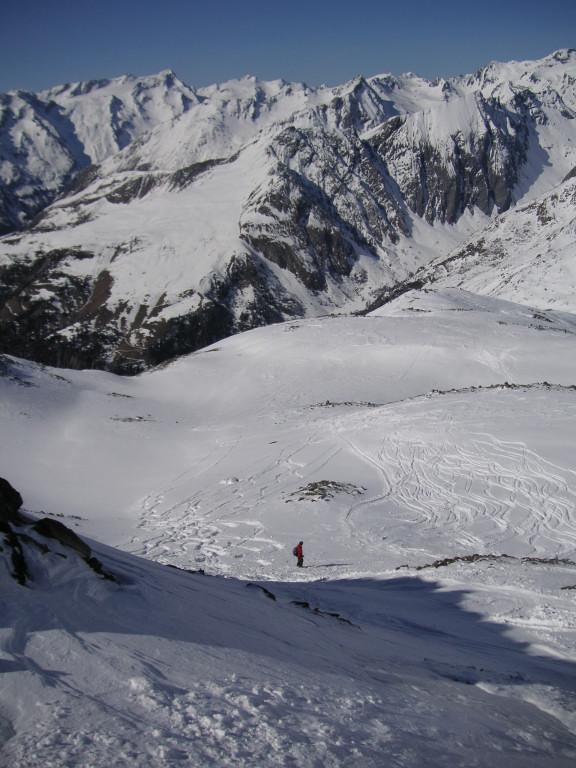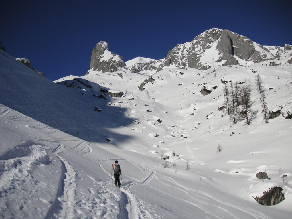 Arthurhaus->Mitterfeldalm->Ochsenkar->Kleiner Bratschenkopf. Sehr gute Schneelage, verschiedene Pulverqualitäten im Südteil des Ochsenkars, im Nordteil aufgeweichter Neuschnee (noch kein Firn), der Schnee an den Lawinenstrichen oberhalb der Mitterfeldalm ist gut gesetzt.