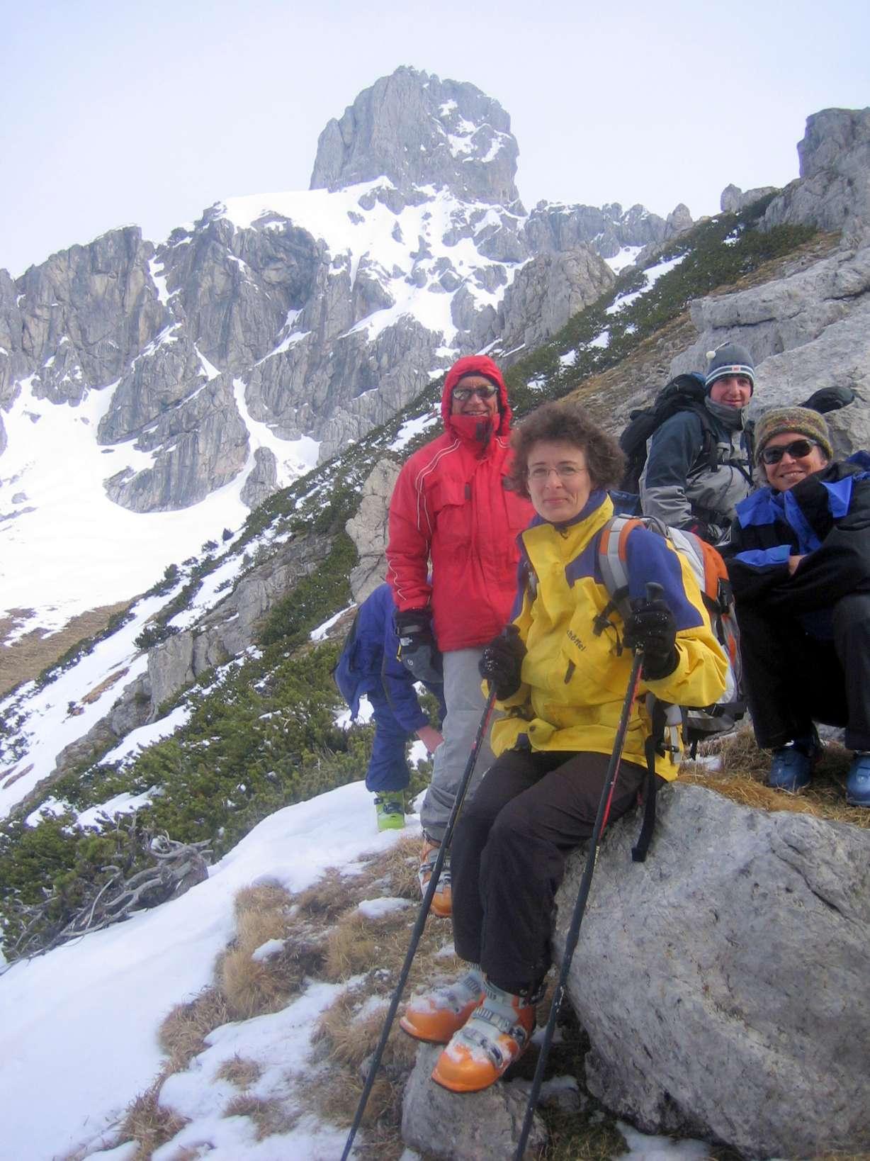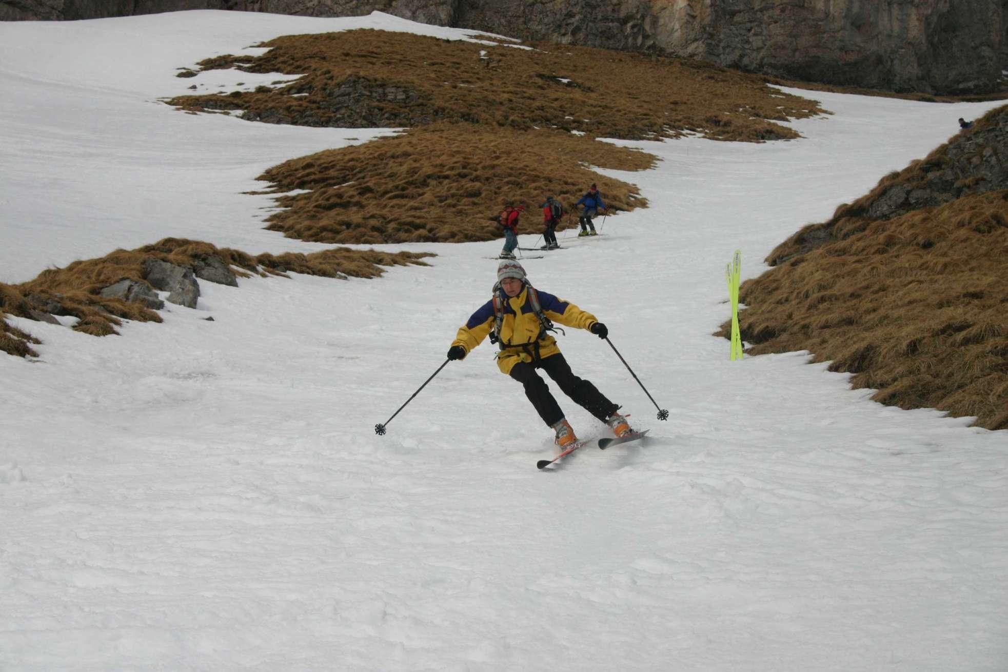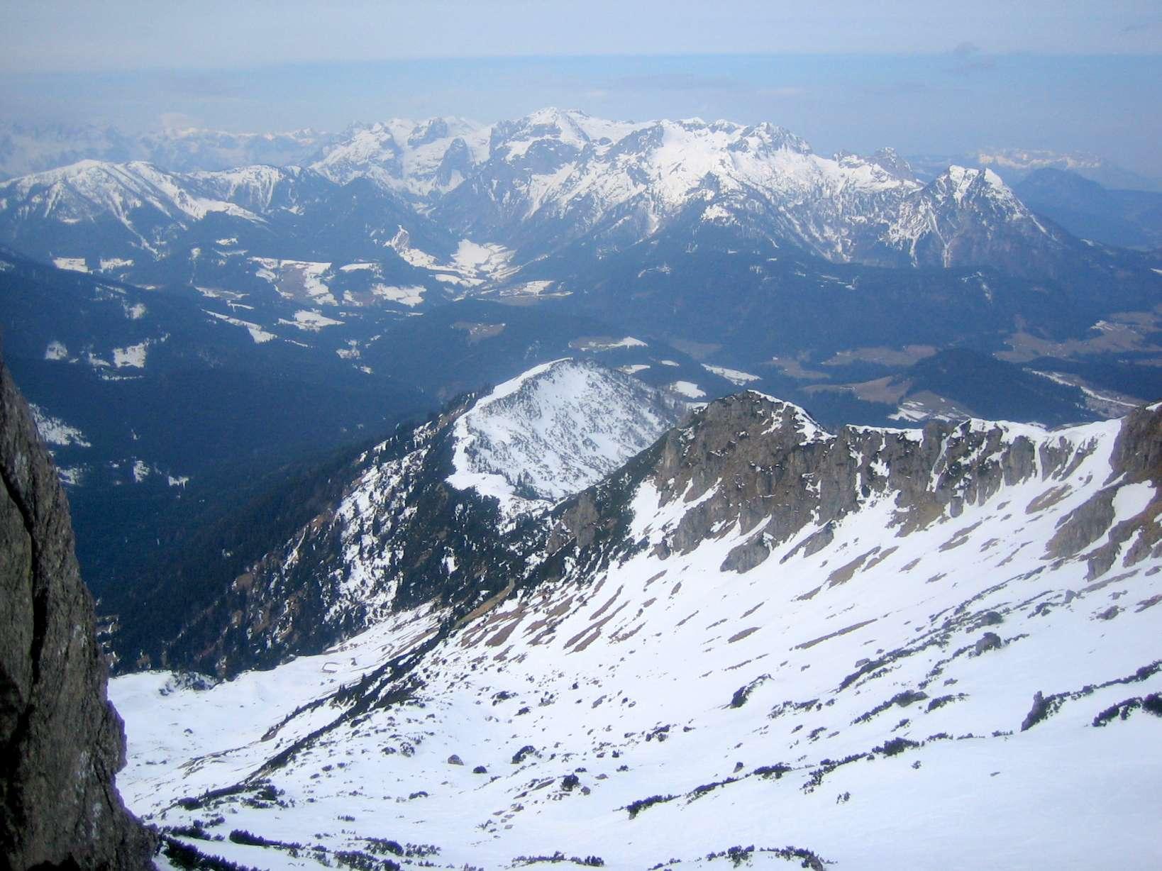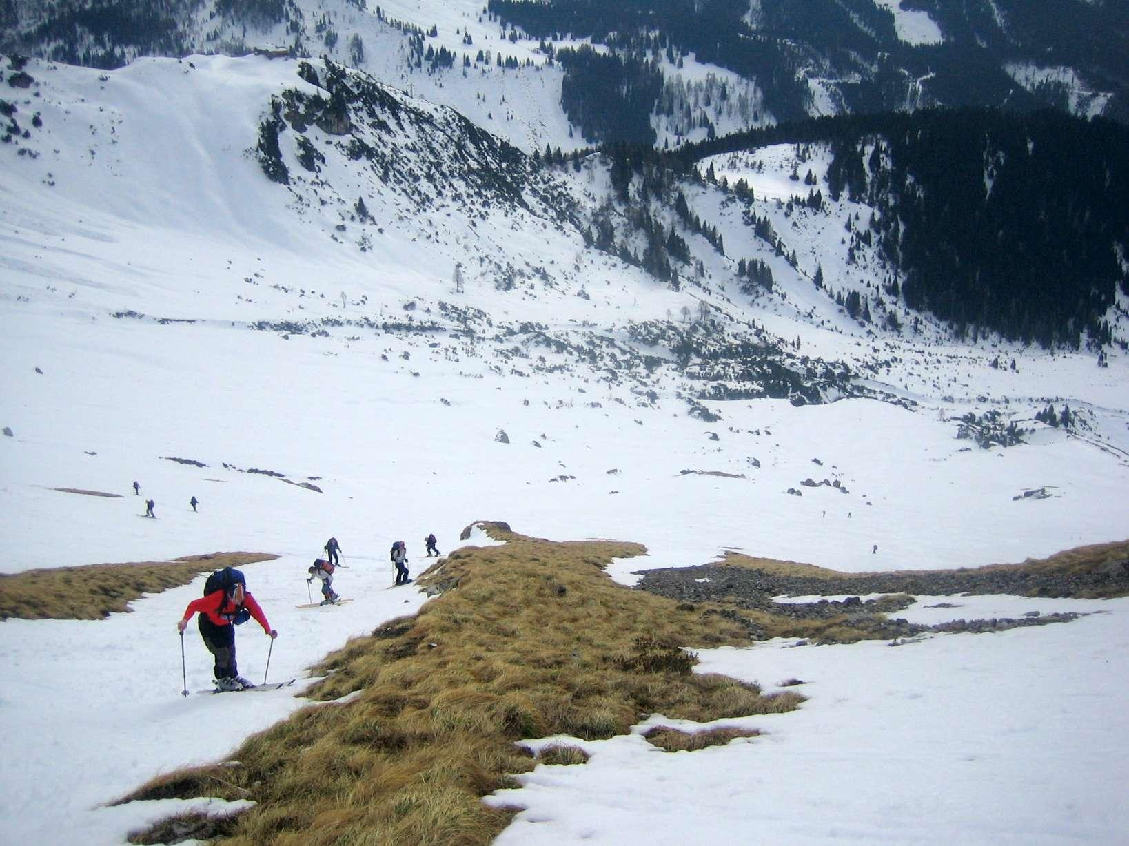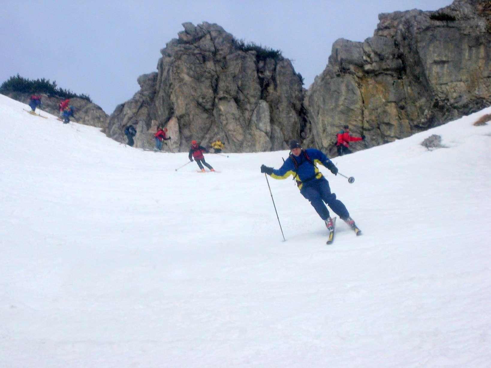 .. weist die AV-Karte Gosaukamm eine unbenannte Scharte mit der Höhenangabe 1997 m aus. Durch ein informatives Foto von Stefan BAUER (am 18.2. von der Eiskarlschneid in Richtung Bischofsmütze aufgenommen) angeregt, wählten wir die SE-Hänge, die zum Leckkogel und zum Kampel hinauf führen, als unser heutiges Ziel. Nach geringer Abstrahlung in der Nacht nur ein eher dünner Harschdeckel; die hohe Bewölkung und der kräftige Föhn verzögerten jedoch das Auffirnen, sodass der Schnee bei unserer Abfahrt um ca. 11:00 Uhr erst langsam "zu schmieren" anfing. Bei der geringen Schneelage in dieser Höhe und Exposition sind auf diesen SE-Hängen bei anhaltend warmer Witterung die Tage mit einer durchgehenden Abfahrt gezählt.
