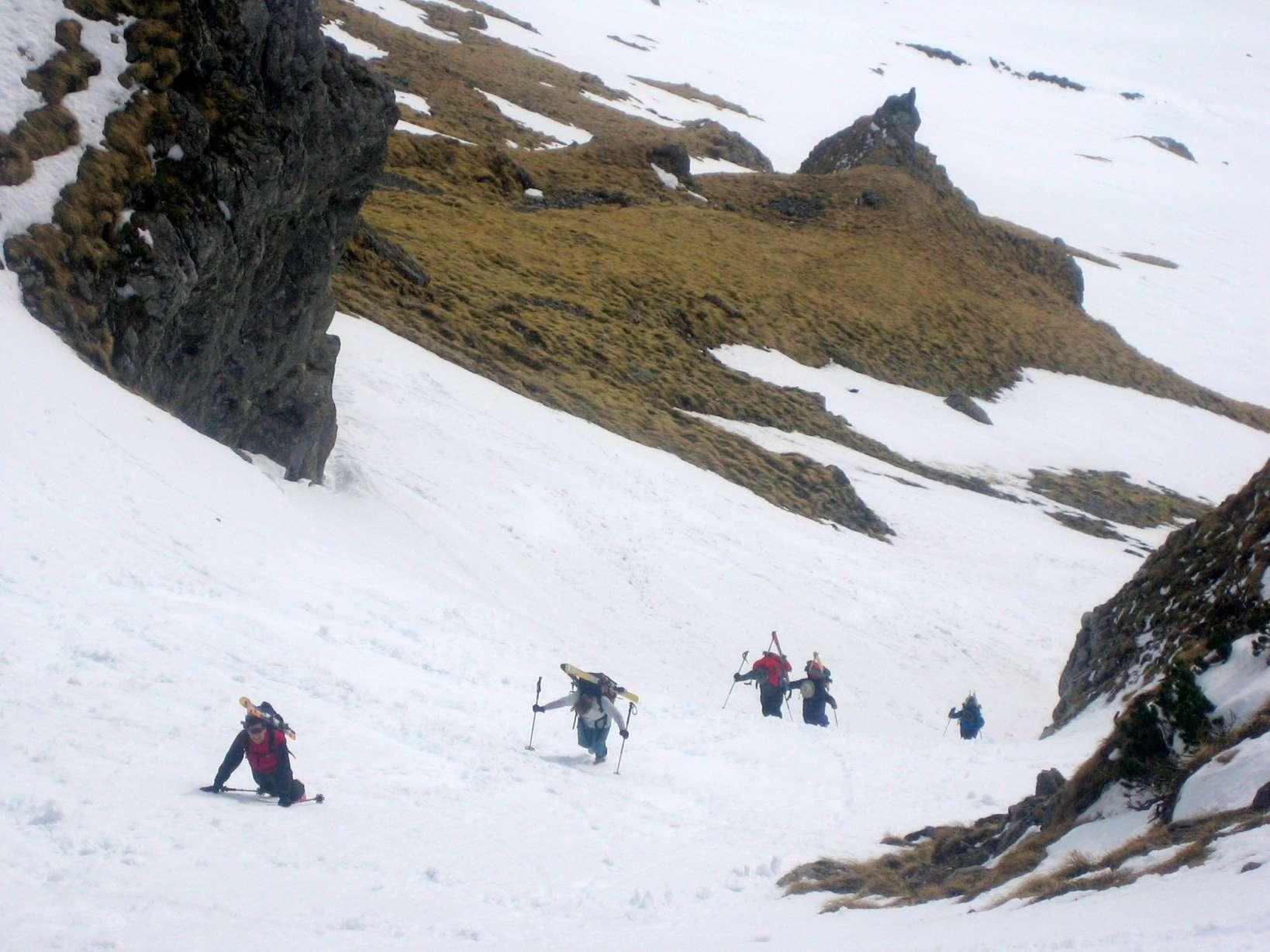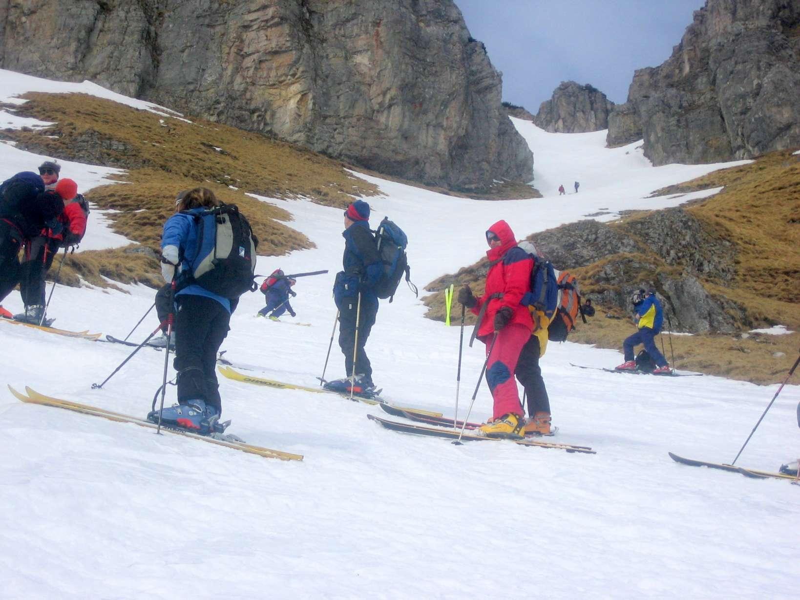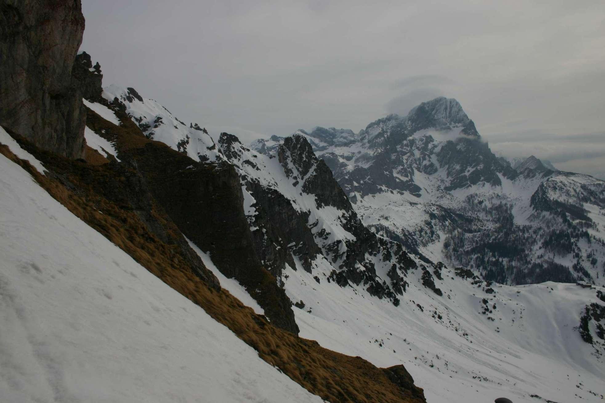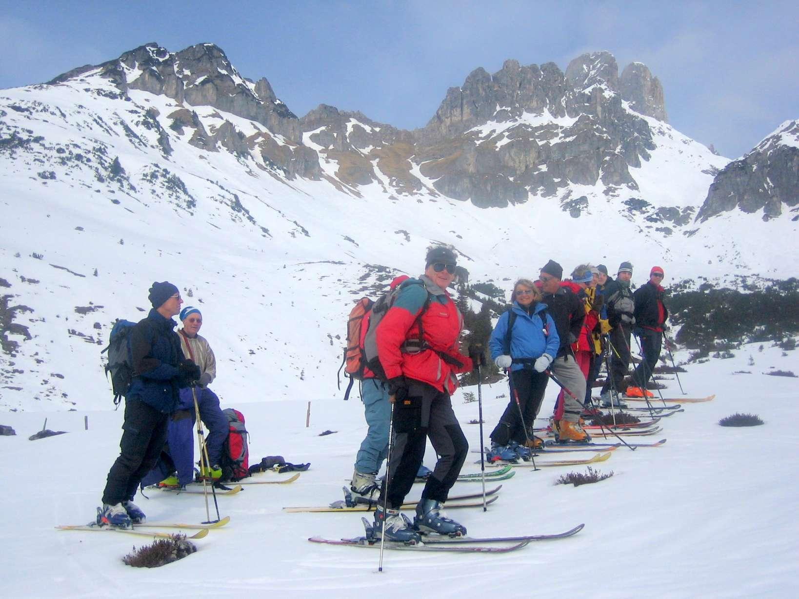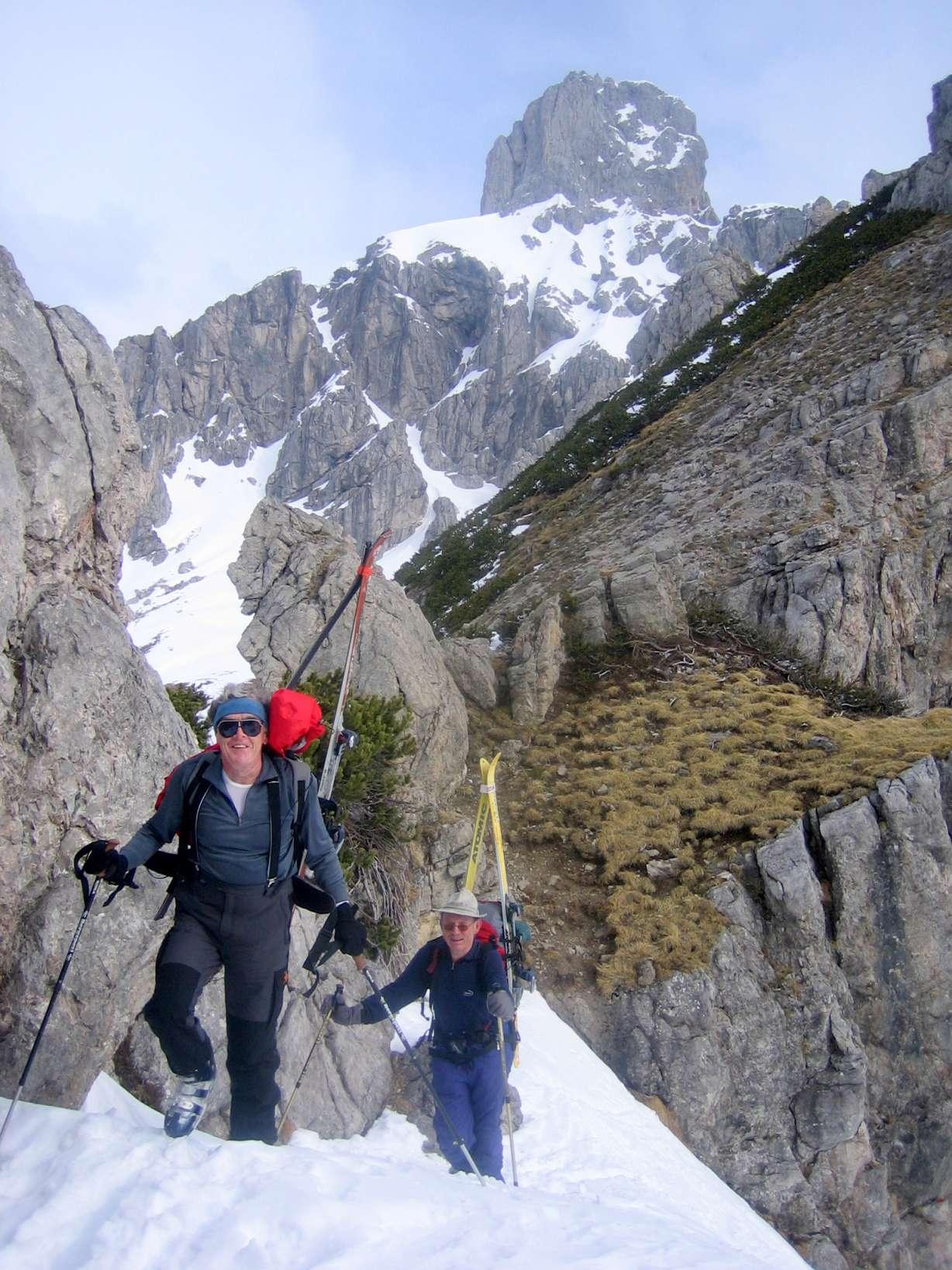 .. weist die AV-Karte Gosaukamm eine unbenannte Scharte mit der Höhenangabe 1997 m aus. Durch ein informatives Foto von Stefan BAUER (am 18.2. von der Eiskarlschneid in Richtung Bischofsmütze aufgenommen) angeregt, wählten wir die SE-Hänge, die zum Leckkogel und zum Kampel hinauf führen, als unser heutiges Ziel. Nach geringer Abstrahlung in der Nacht nur ein eher dünner Harschdeckel; die hohe Bewölkung und der kräftige Föhn verzögerten jedoch das Auffirnen, sodass der Schnee bei unserer Abfahrt um ca. 11:00 Uhr erst langsam "zu schmieren" anfing. Bei der geringen Schneelage in dieser Höhe und Exposition sind auf diesen SE-Hängen bei anhaltend warmer Witterung die Tage mit einer durchgehenden Abfahrt gezählt.