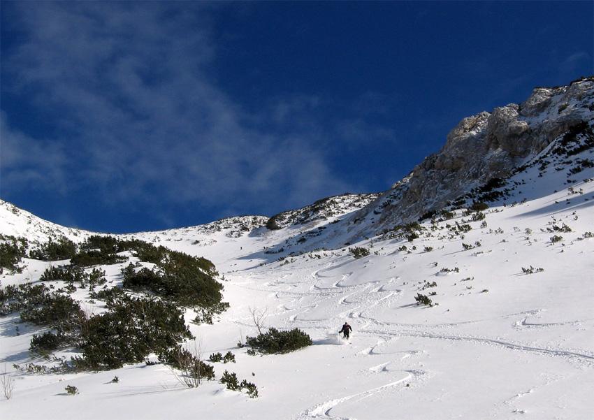 Für diesen schneearmen Winter zur Zeit recht passable Verhältnisse am Gamsfeld: durchgehende Schneedecke (ca. 20 cm) vom Parkplatz weg mit leicht verblasener Pulverschneeschicht ab Angerkaralm.