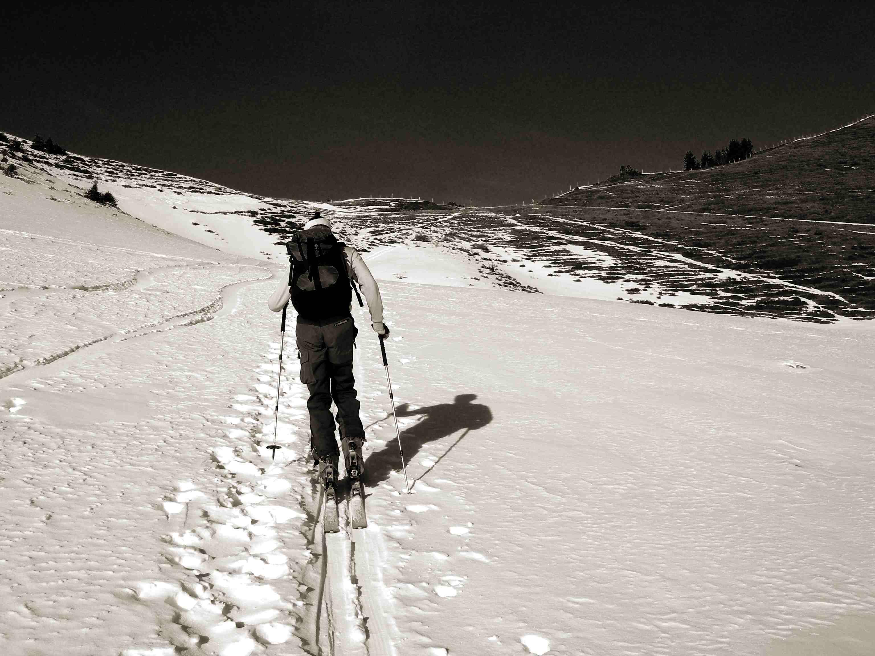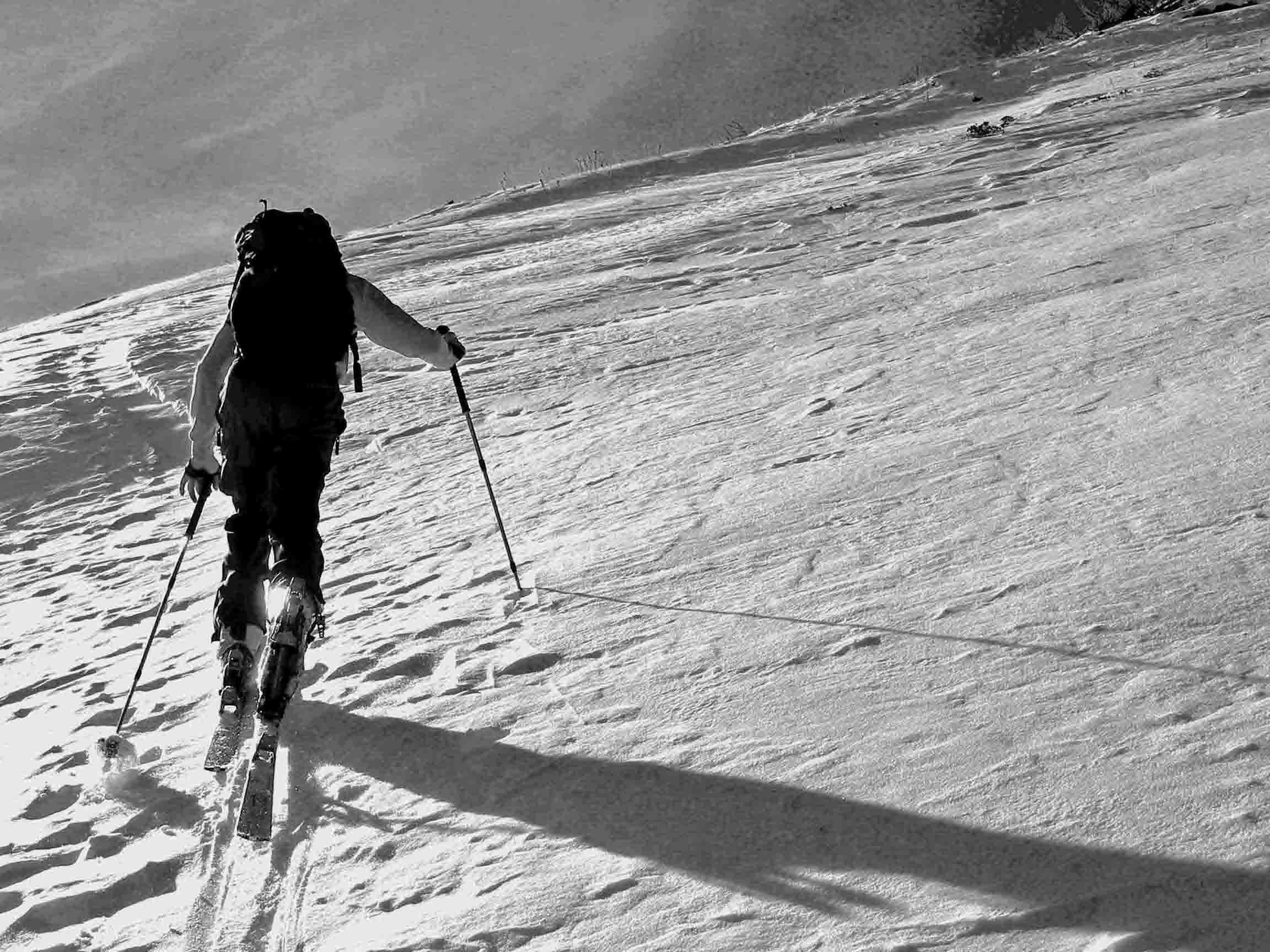 Der Schneemangel zwang uns zu einer Pistenabfahrt vom Langeck. Aufstieg von Hintermoos über die Neuhausalm im Schatten auf Schnee möglich.