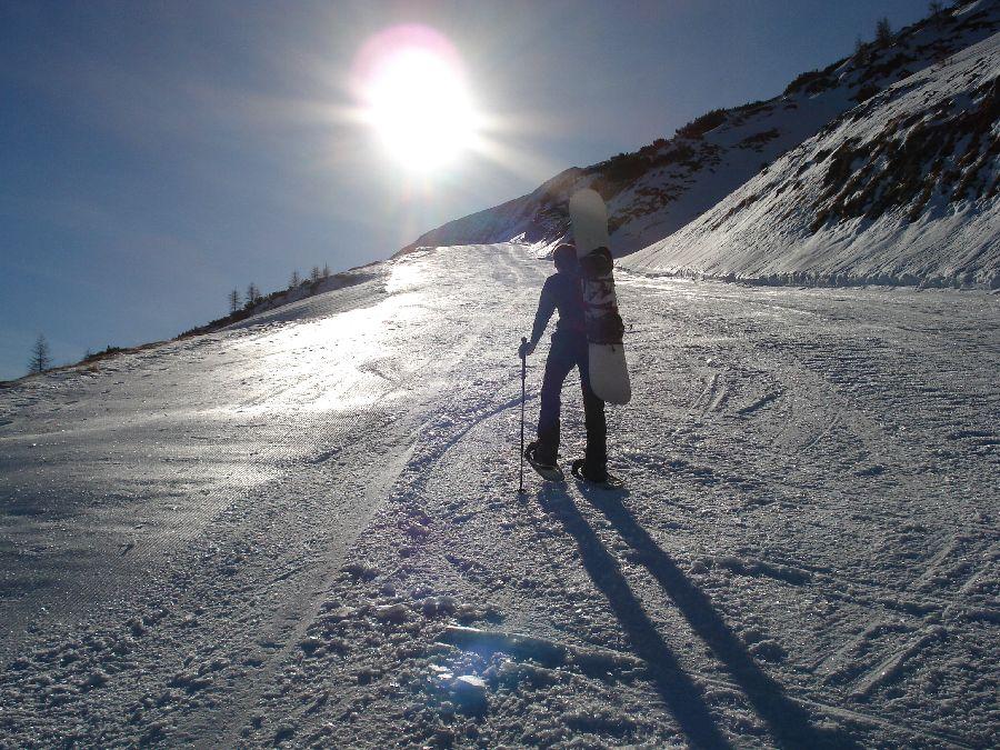Verhältnisse: noch ausreichende Schneeverhältnisse; in der Sonne weich, sonst sehr hart.