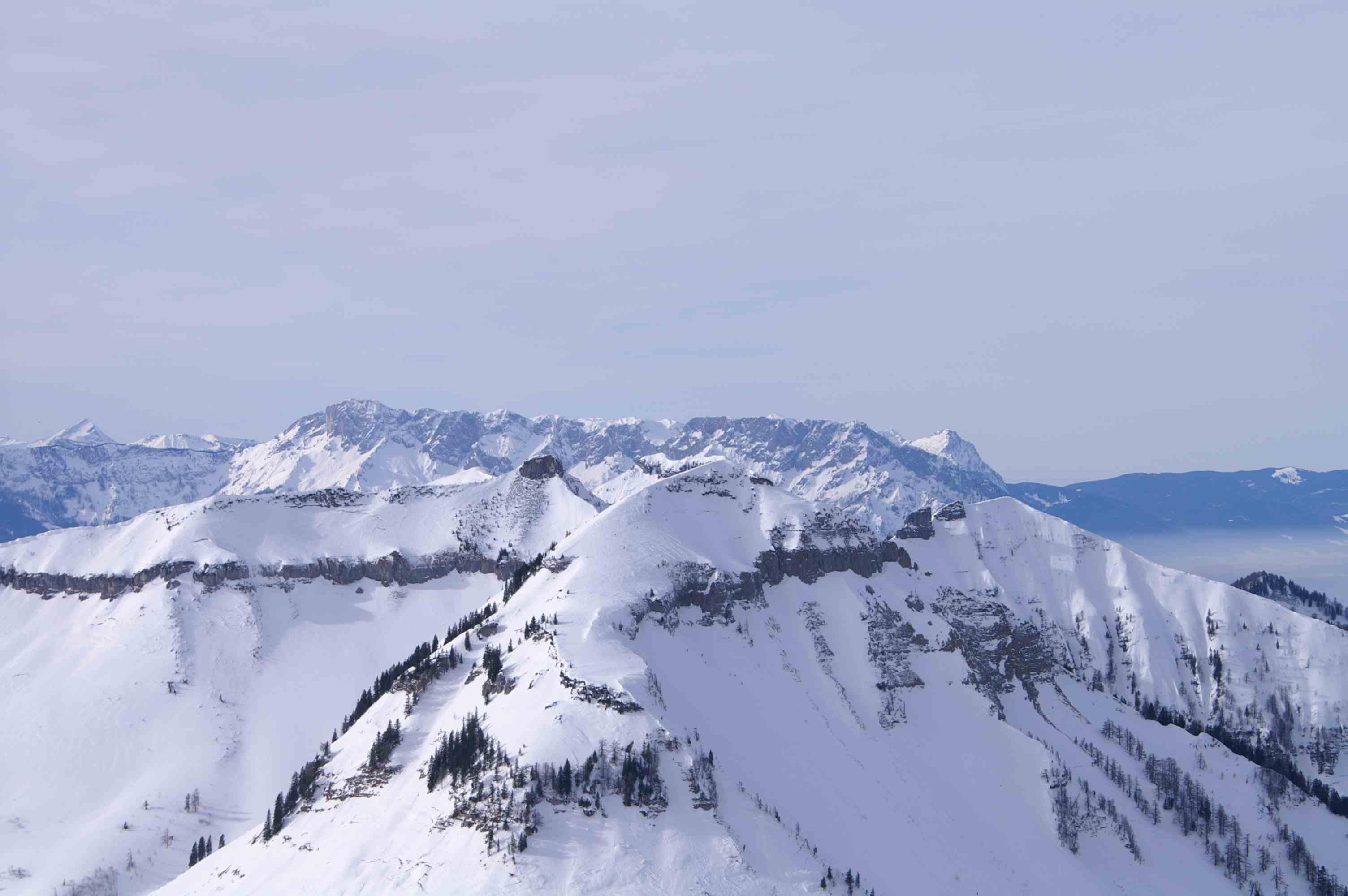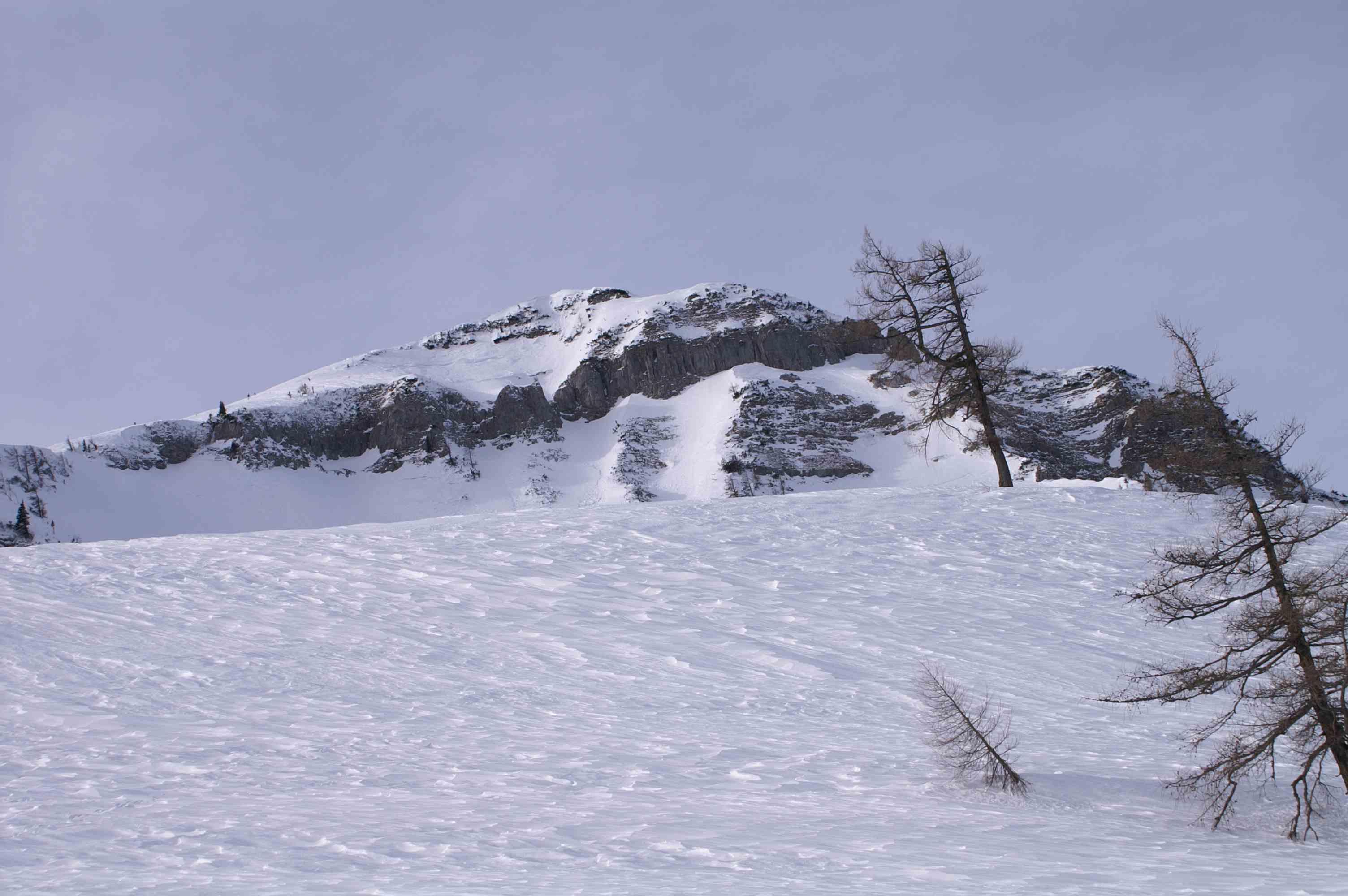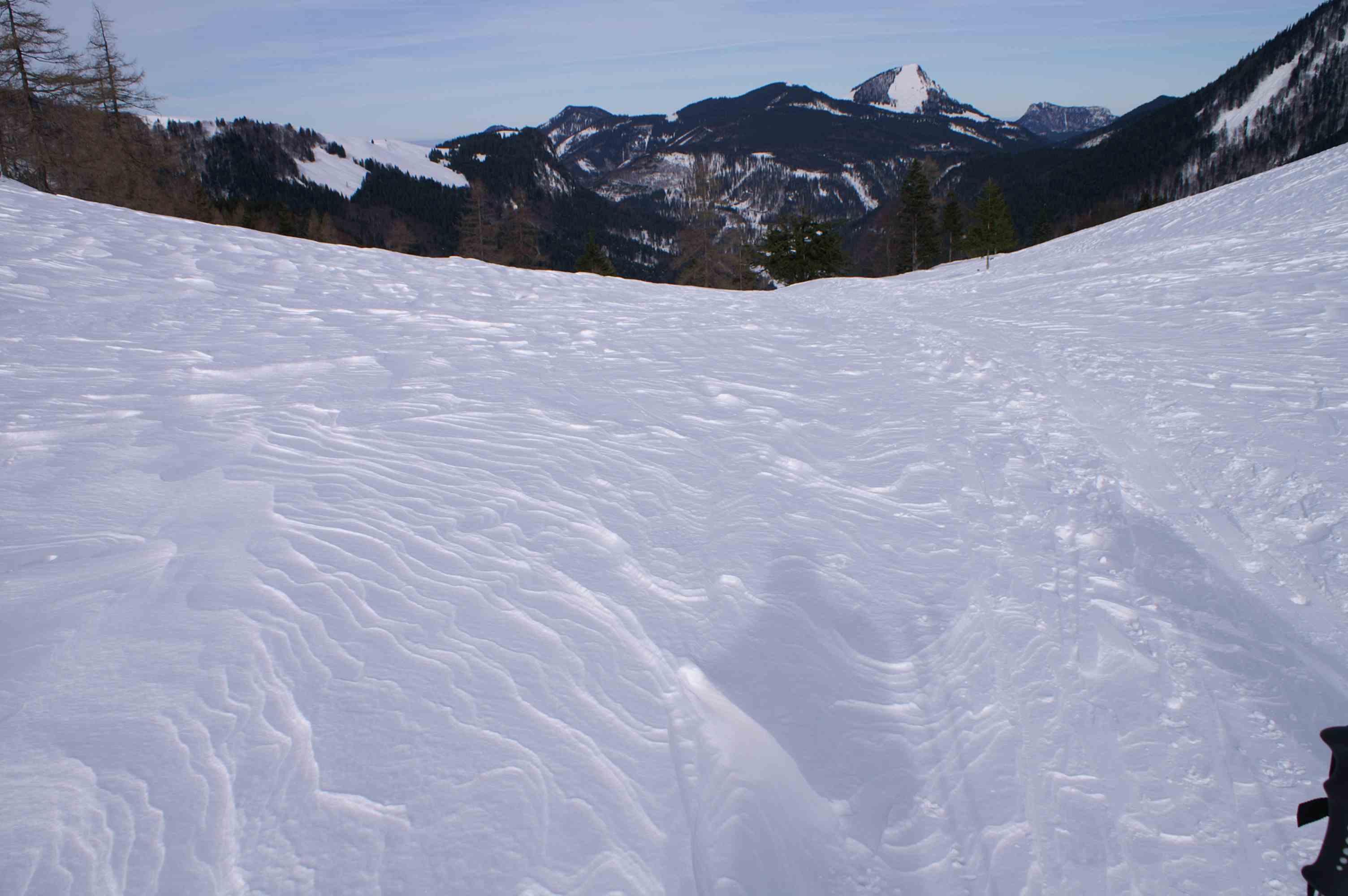 Eigentlich wollten wir ja auf das Gennerhorn. Von den Genneralmen war jedoch keine Aufstiegsspur zu sehen und nachdem ich noch Anfänger bin, war mir das Risiko zu groß und wir haben kurzfristig umdisponiert und den Hohen Zinken als Ziel unserer Tour ausgewählt. Es hat sich gelohnt. Am Gipfelhang windgepresster Schnee und im Wald Pulver. Also gute Verhältnisse für mich.