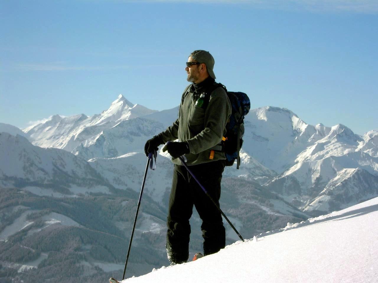 Sonnige Südhang-Tour, relativ Lawinensicher, fantastischer Ausblick auf die Hohen Tauern auf der einen Seite und Dientner Grasberge, Hochkönig und Steinernes Meer auf der anderen Seite.