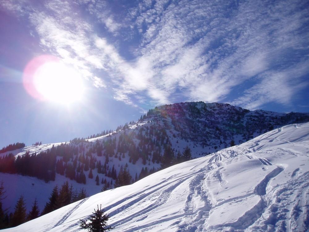Der Aufstieg versprach anfangs viel Gutes: im unteren Bereich Schneekristalle und darunter Pulver, und herrliche Sonne! Dann kam die Waldpassage: eisig, eisig, eisig! Und oben dann Bruchharsch! Da ich allein unterwegs war, entstied ich , die Aufstiegsspur wieder herunter zu fahren. War zu spät unterwegs (nachmittag)! Die Hänge lagen schon im Schatten und ich kam nur selten aus dem Harsch heraus. Egal, Hauptsache Sonne und sich in der Natur bewegen!