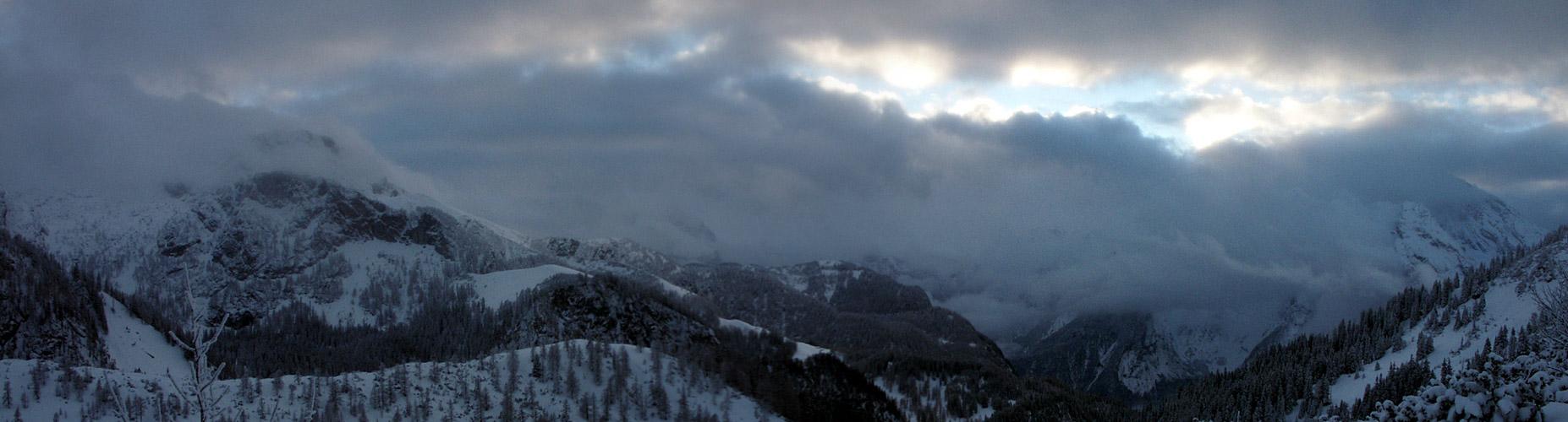 Spät-nachmittagliche Tour von Hinterbrand bei Berchtesgaden zum Stahlhaus an den Südausläufern des Göll-Massivs zwischen Bayern und dem Land Salzburg. Die abendliche Stimmung endete in einem kleinen Schneesturm und Abfahrt bei Dunkelheit. Andere Arten von Dunkelheiten beschäftigen in diesen Tagen viele Zeitgenossen. Darum spendet bitte bei ?Nachbar in Not?!