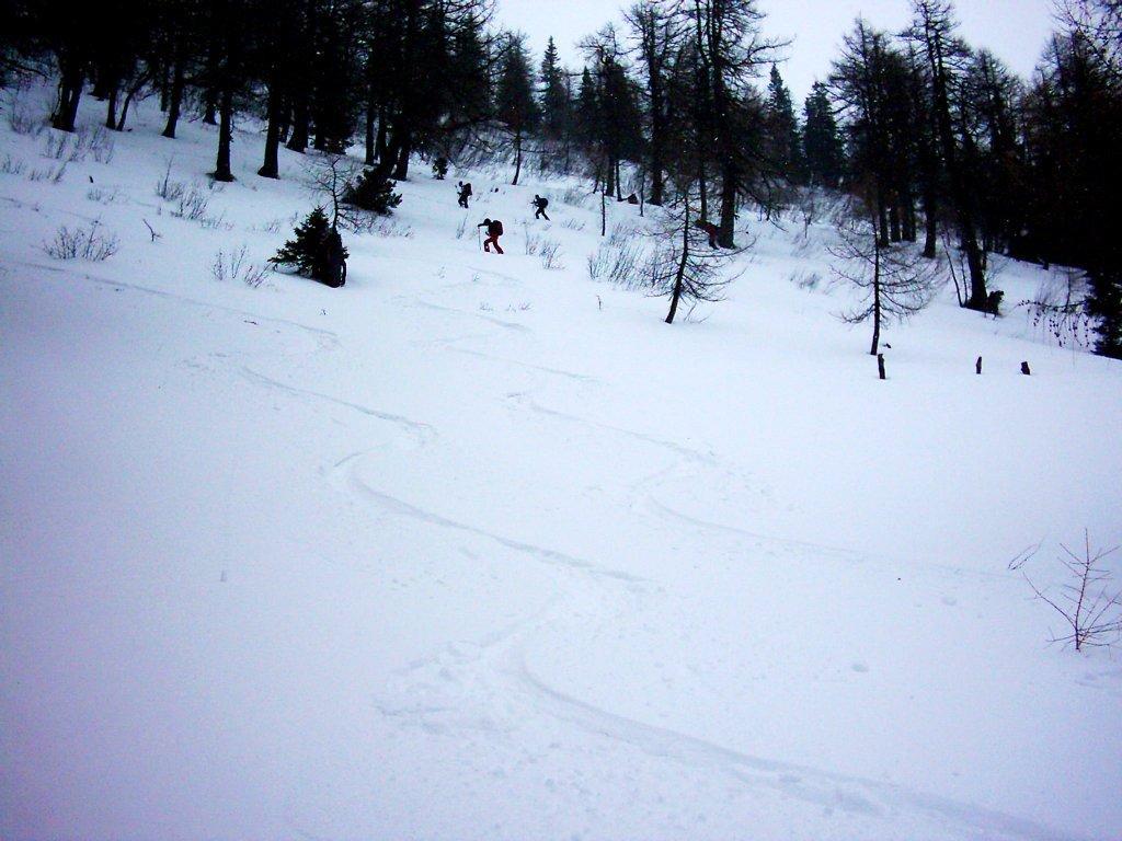 Bei bedecktem Himmel, später bei Schneefall und 10 cm Neuschnee im Tal bis ca. 20 cm am Berg waren wir nicht die Einzigen mit dem Ziel Zinken bzw. Osterhorn. Hoffentlich kommt noch etwas mehr Neuschnee dazu.