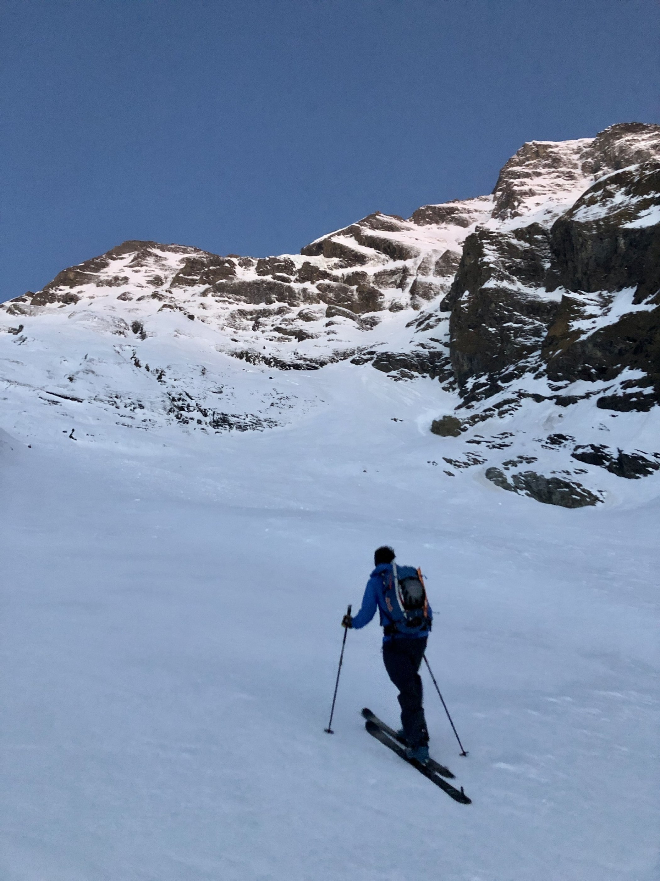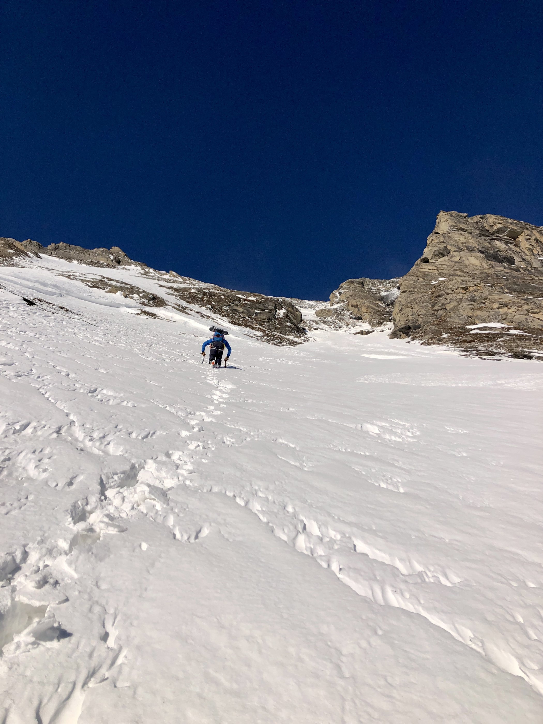 Aufgrund der geringen Schneelage eine heiklere Querung im Schnee auf abschüssigen Platten. Diese war mit Ski für uns in der Abfahrt leichter zu bewältigen.