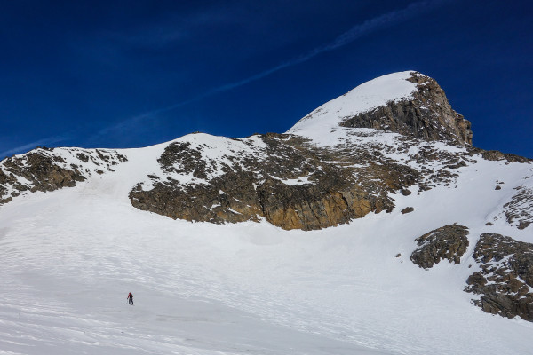 Abfahrt um 13h bei angefirnten Bedingungen im Gipfelbereich