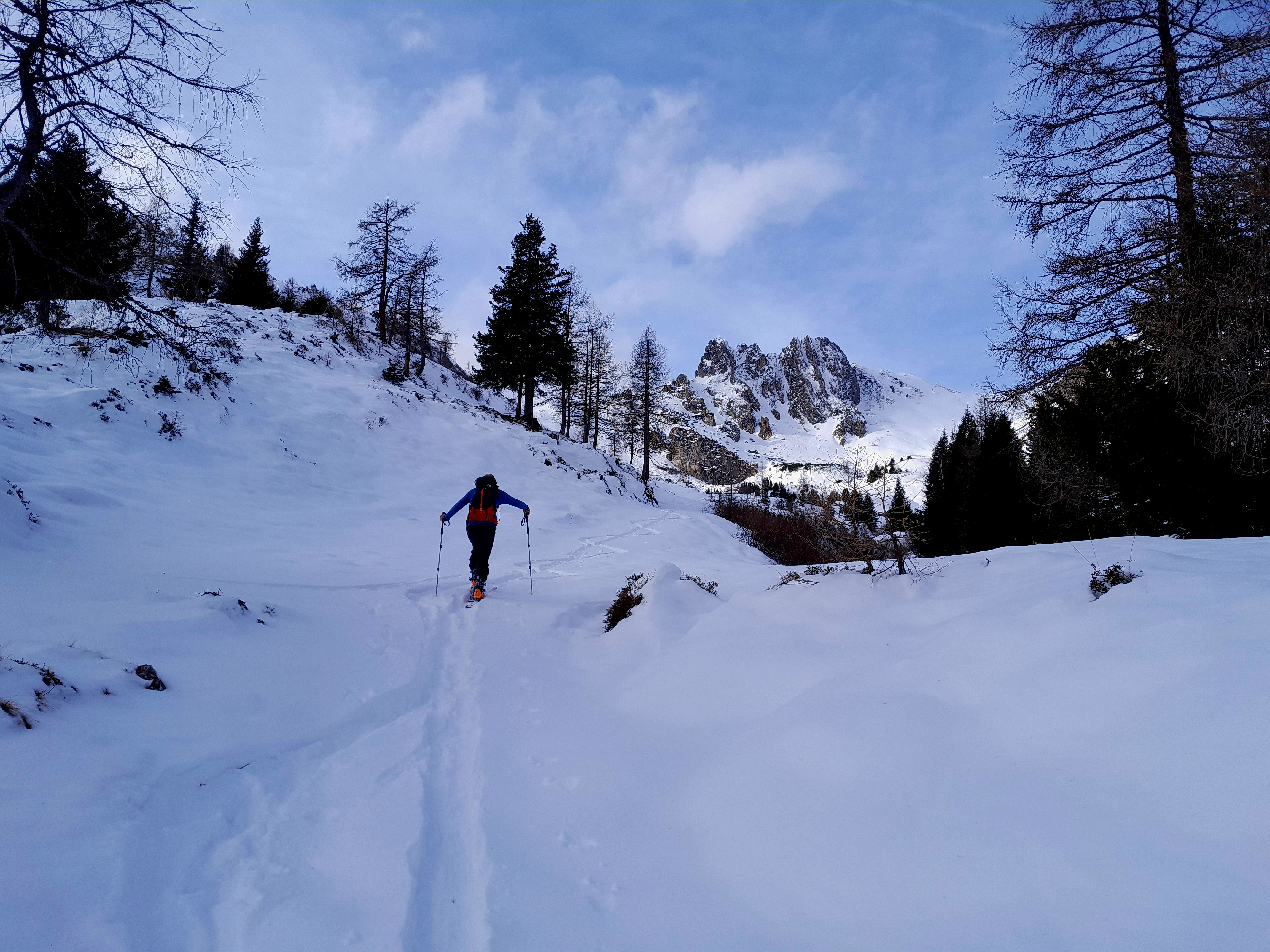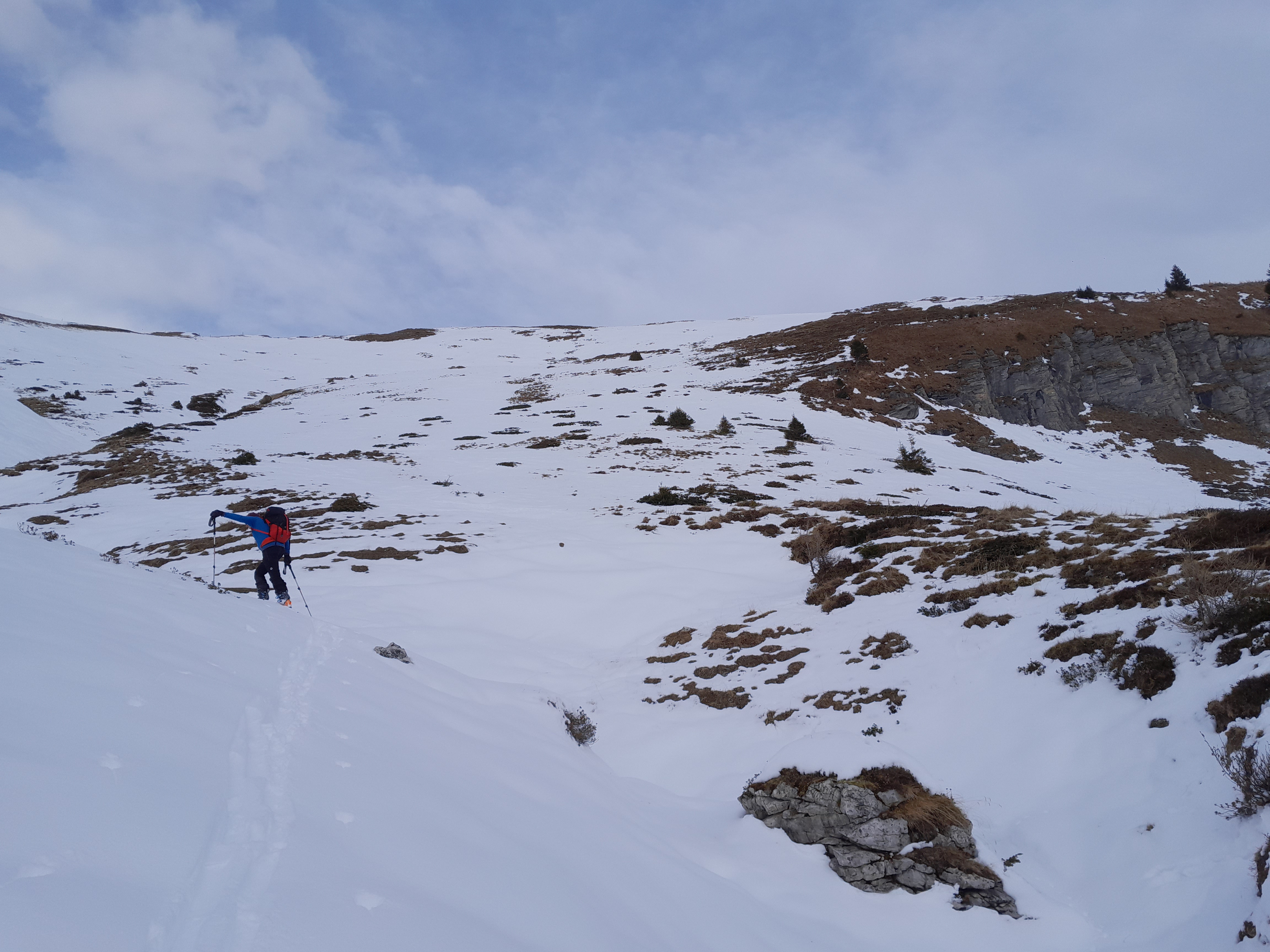 Bei 1350 hm schnallen wir die Ski, bei noch recht mageren Schneemengen an. Wird aber rasch mehr und ermöglicht ein problemloses Ansteigen bis zum Gipfl.