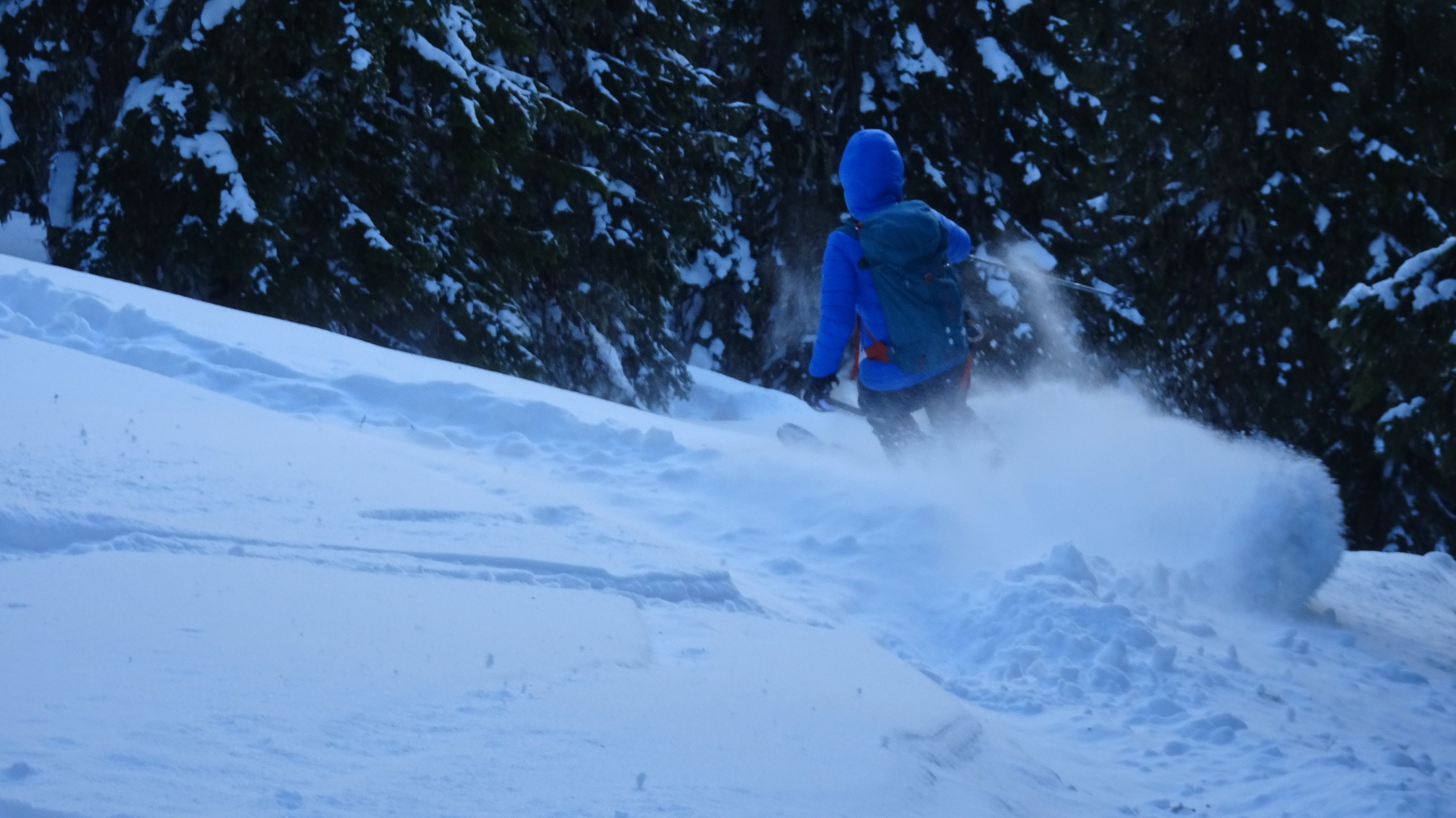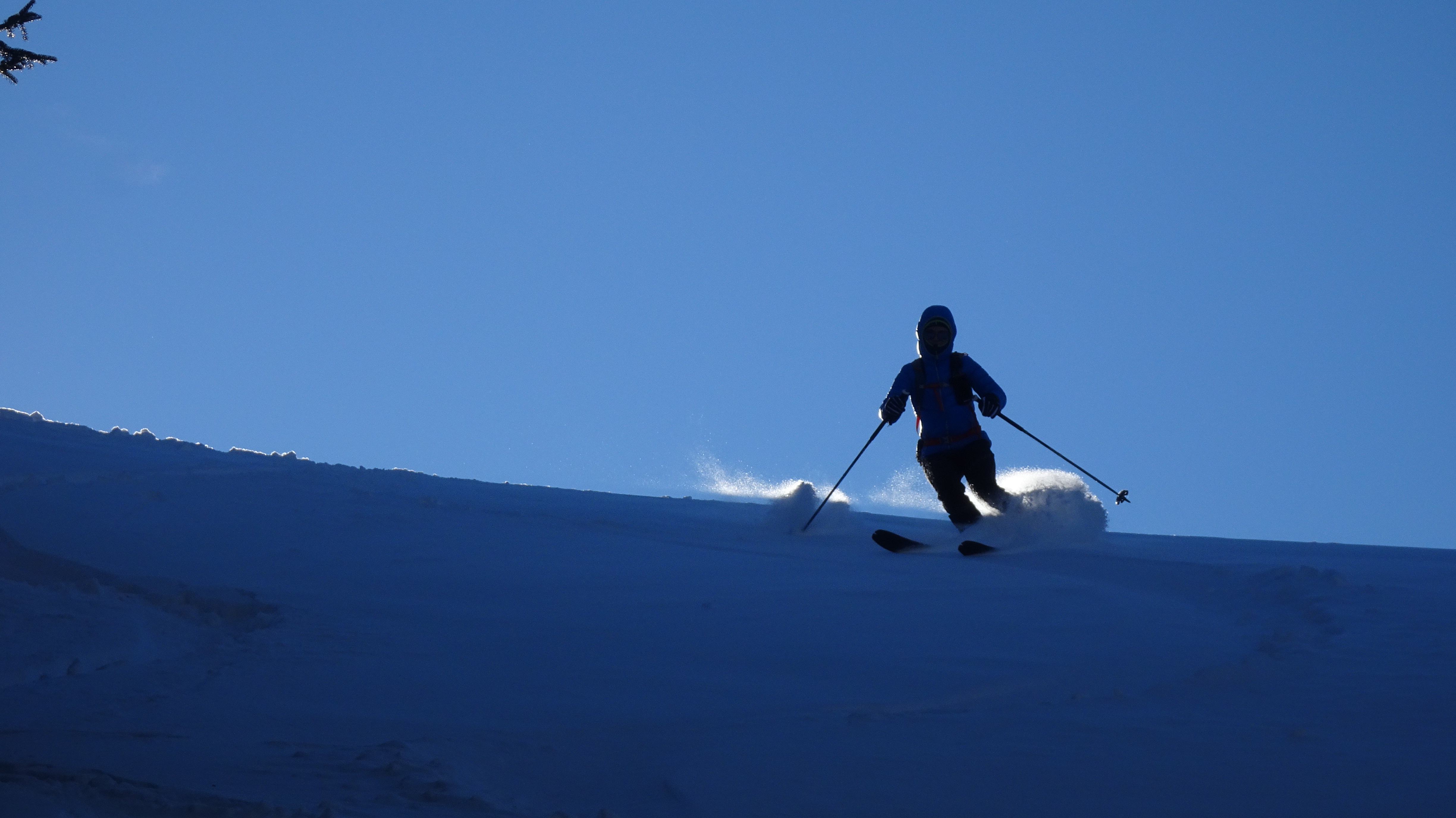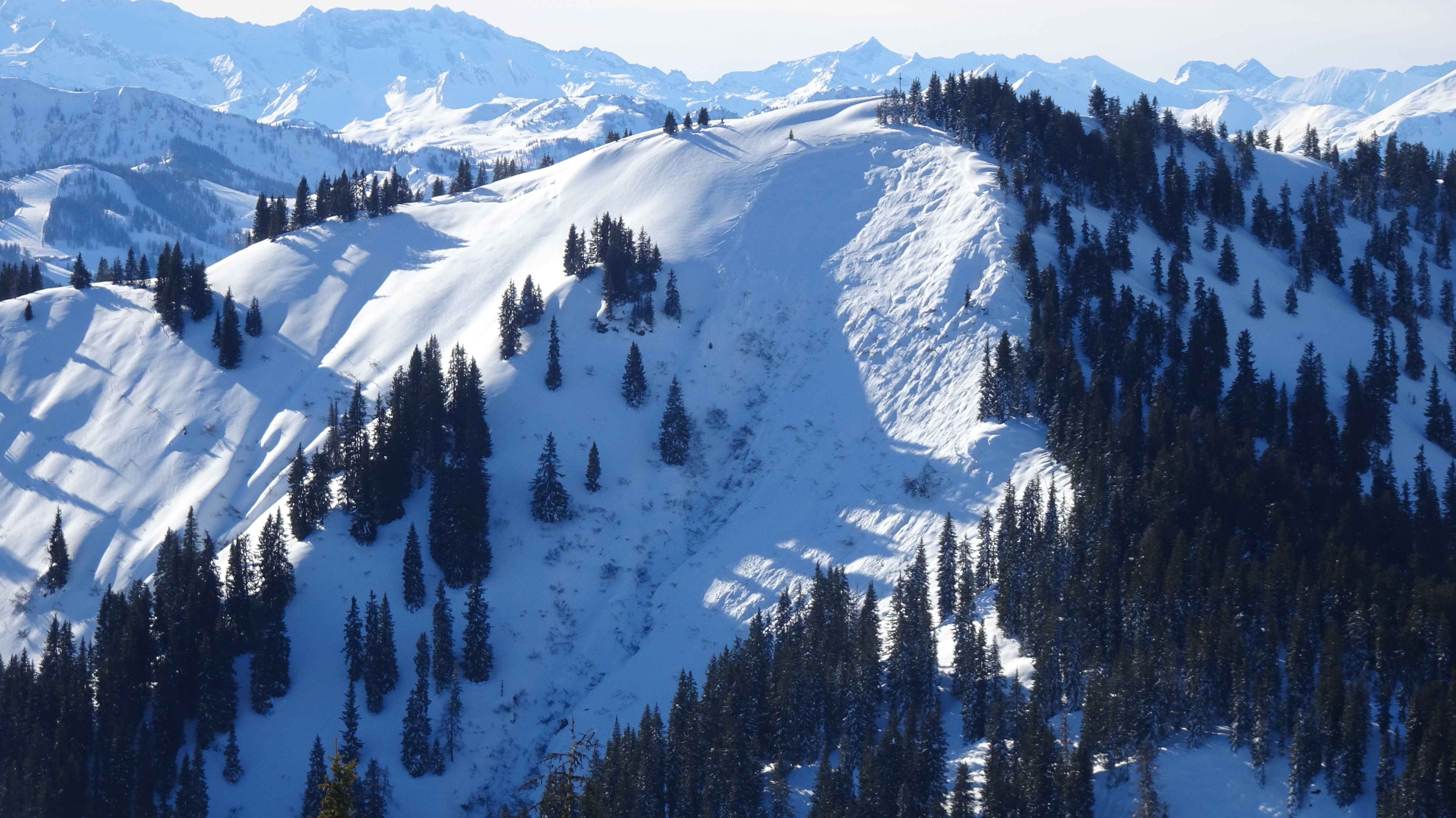 Feiner Pulverschnee von Oben bis Unten. Auf den Bildern sind die steilen Schattenhänge des Hochgründecks mit Gleitschneemäuler und einer abgegangenen Lawine zu sehen.