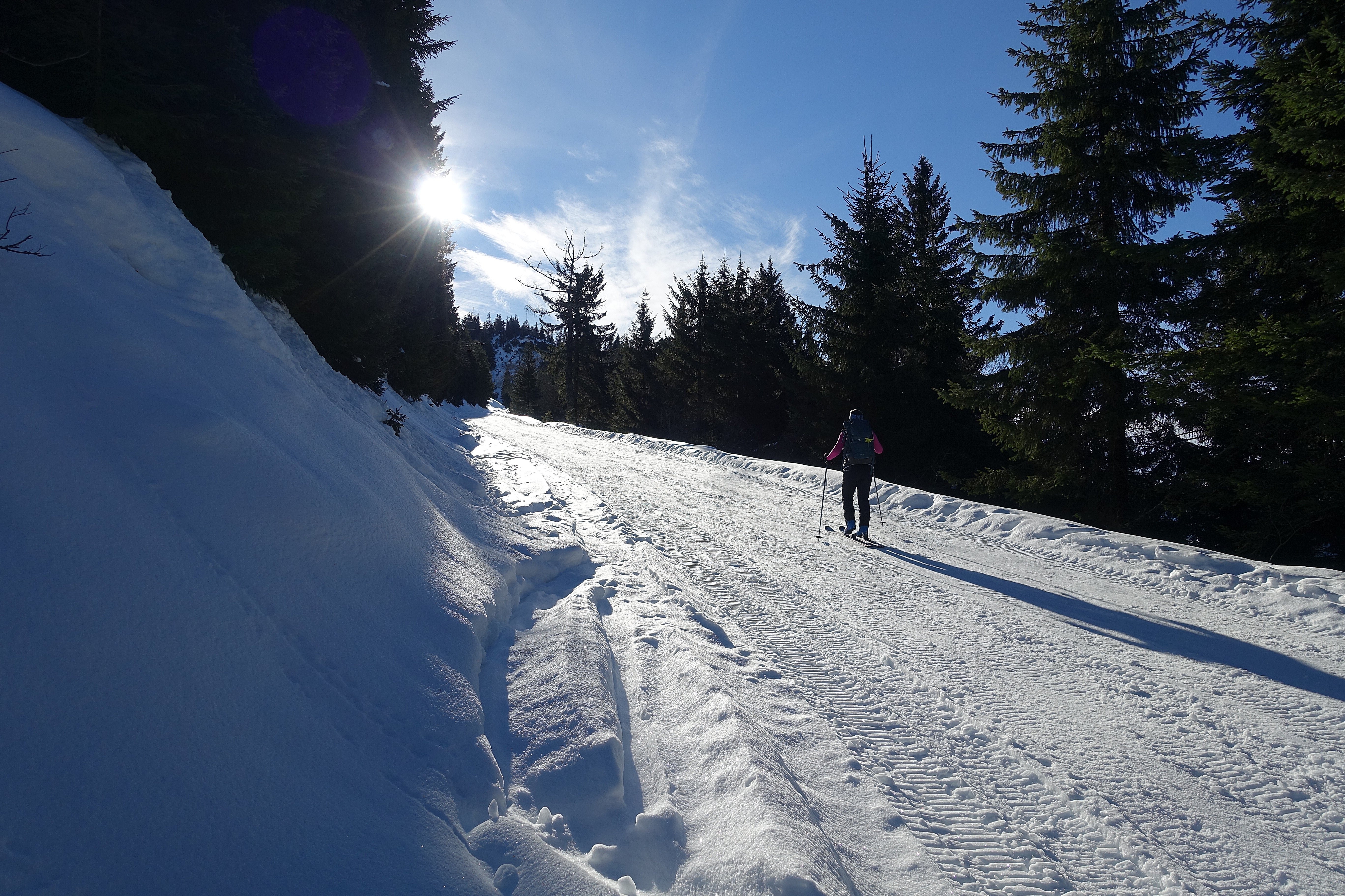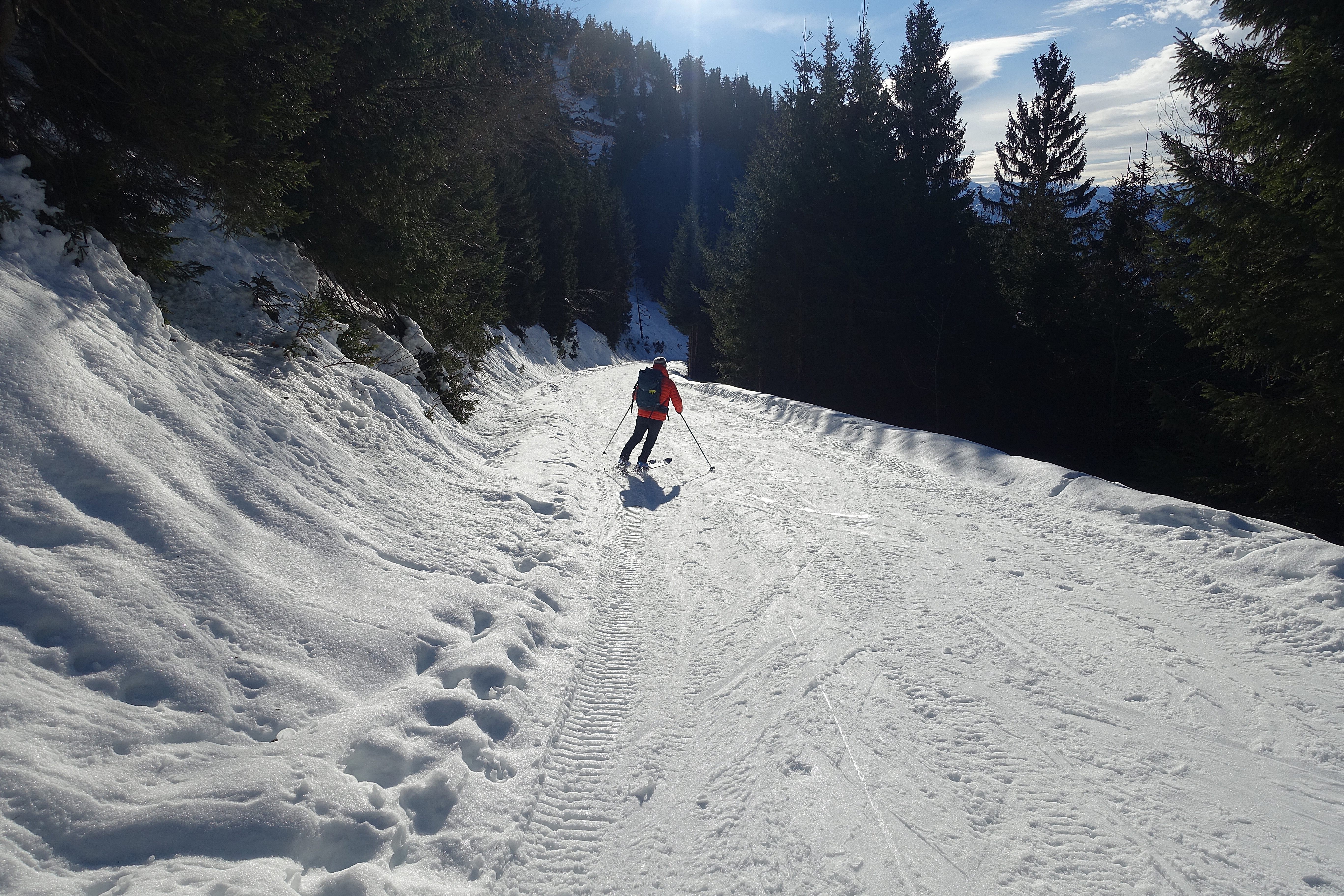 Einiges los heute am Parkplatz (seit heuer am WE € 8,00 Parkgebühr). Wetter - Sonne pur und leichter Wind, Schnee - die Forststraße in sehr gutem Zustand, im schattigen Teil allerdings sehr hart, sonst griffig und teilw. schon firnig. Geht auch gut zum rodeln. Ab der Enzianhütte sehr sehr weich und tief, wir sind im oberen flachen Teil umgekehrt und haben die Sonne genossen. Die Abfahrt bis zur Hütte nicht wirklich ein Genuss, aber hauptsächlich dem Nebel entflohen.