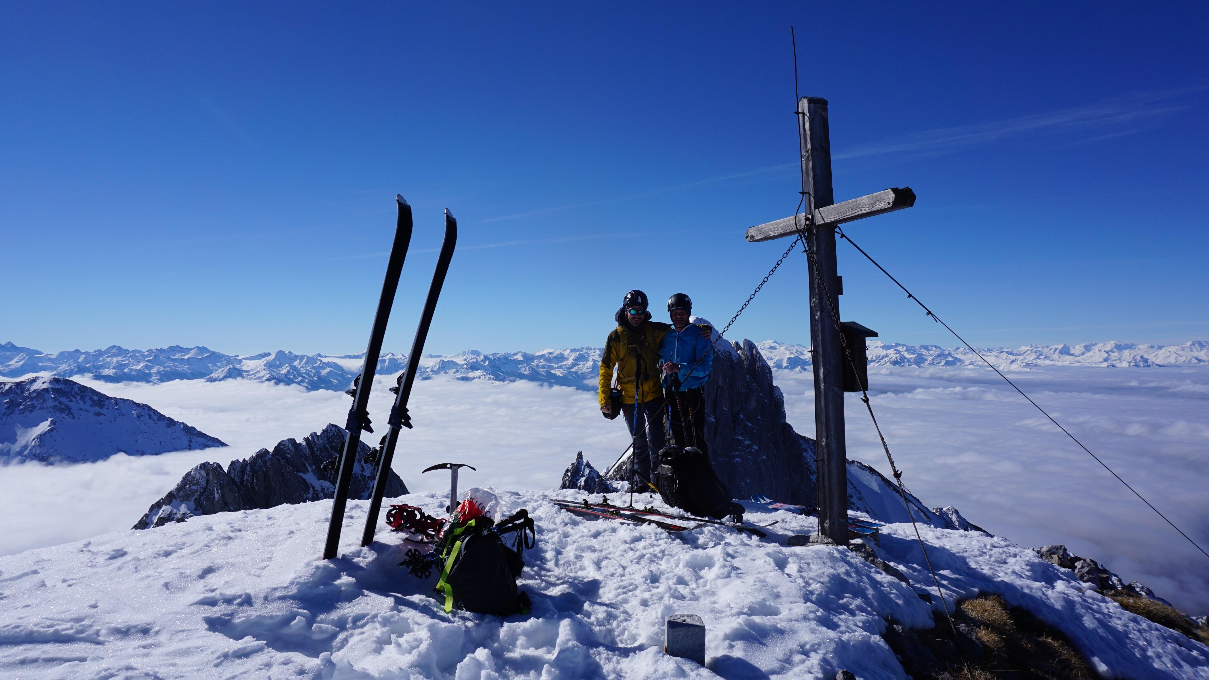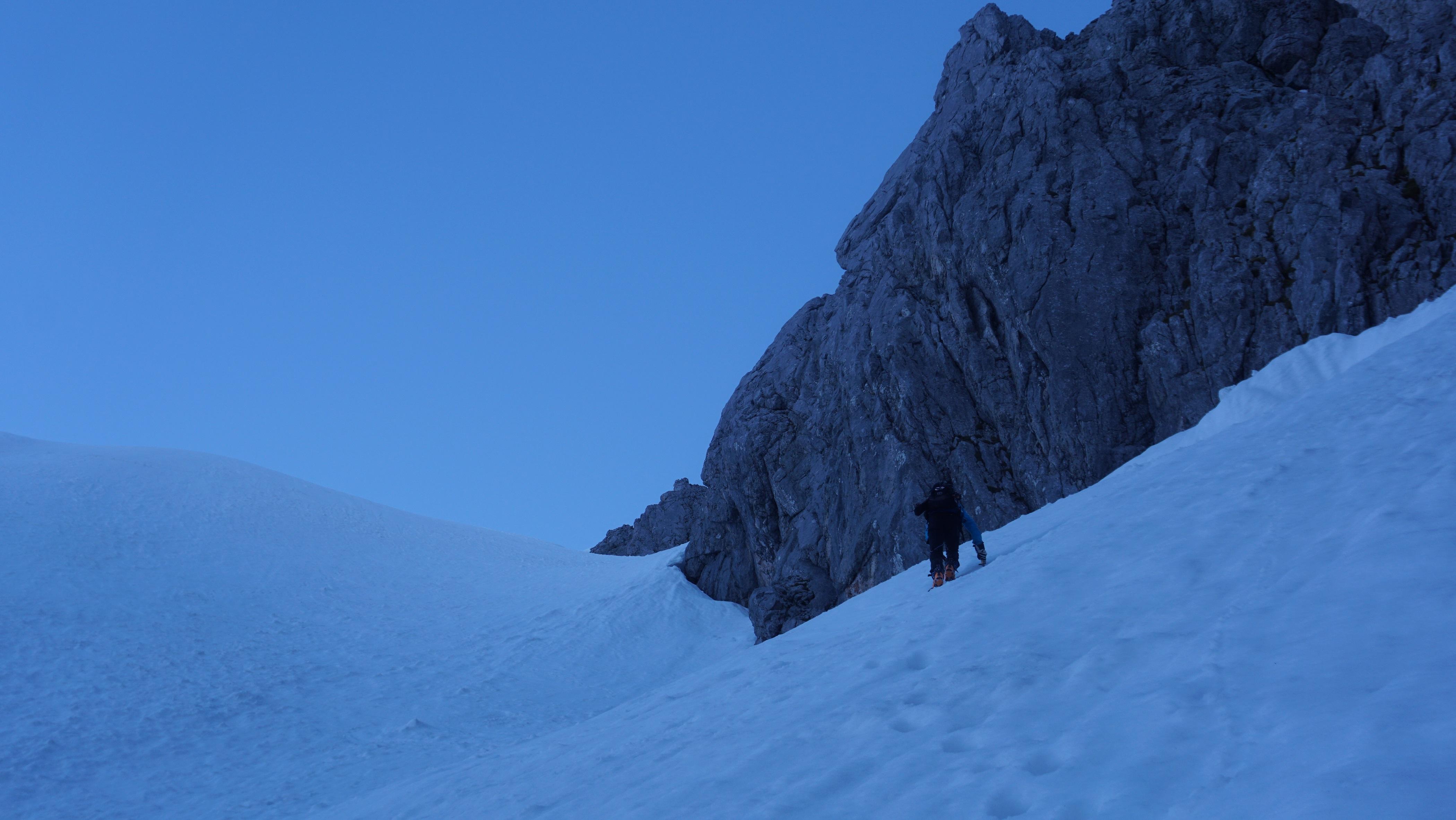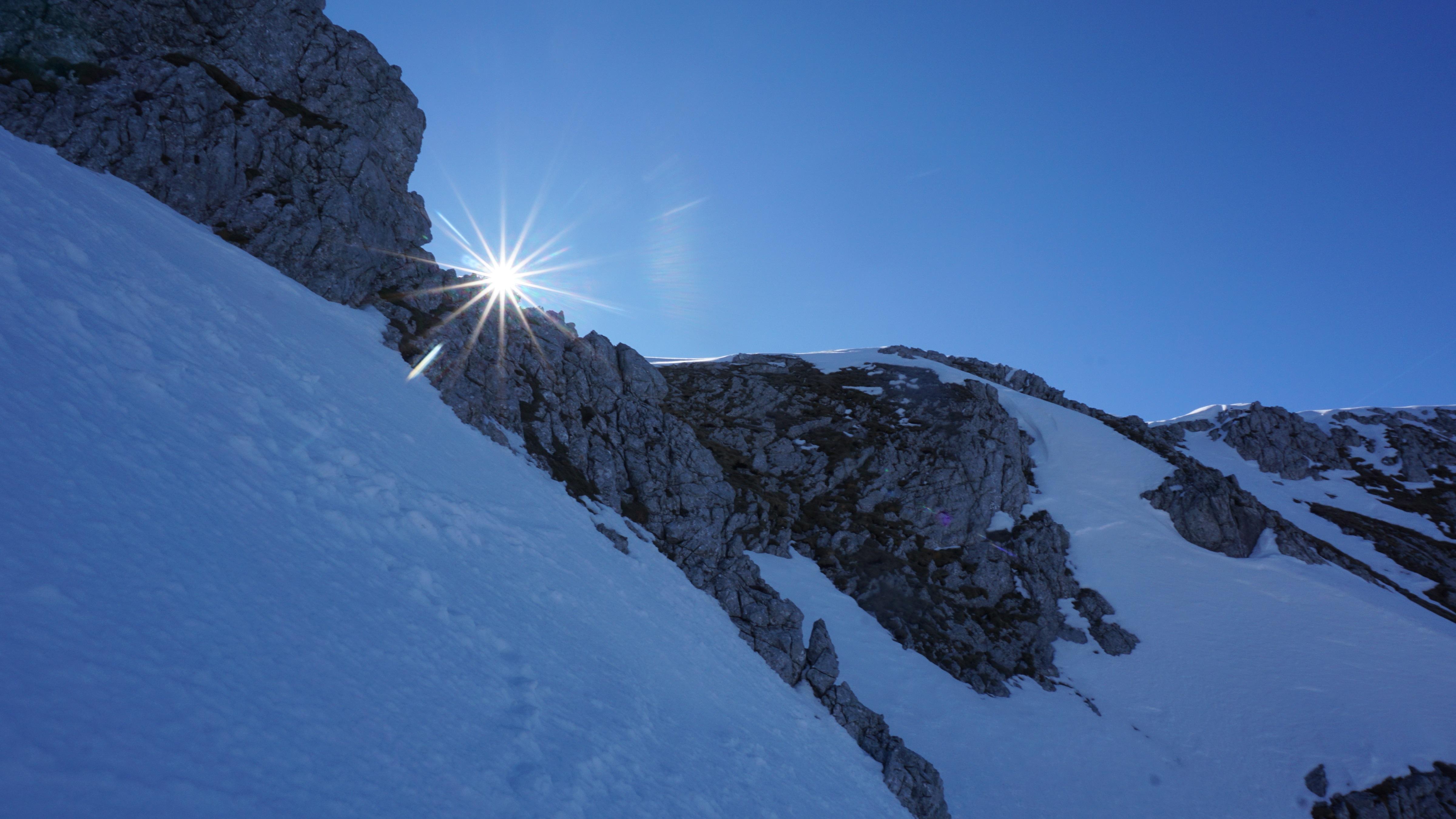 Die ersten 10 Meter morscher Schnee unterm Deckel mit Einsinktiefen bis an die 40 Zentimeter. Keine gute Voraussetzung, aber in dem Bereich für uns keine Lawinengefahr. Kurze Beratung: ok, schaun wir noch ein paar Schritte weiter, ob sich was ändert. Sonst muss ein Plan B her. Nach 10 Metern bis zum Gipfel durchgehend tragender Deckel mit keinem einzigen Durchbruch, wir können teilweise die angelegte Stapfspur nutzen, kraxeln nach der Rampe über Schrofen ins Gipfelkar und um kurz vor 10.00 Uhr sind wir am Gipfel.