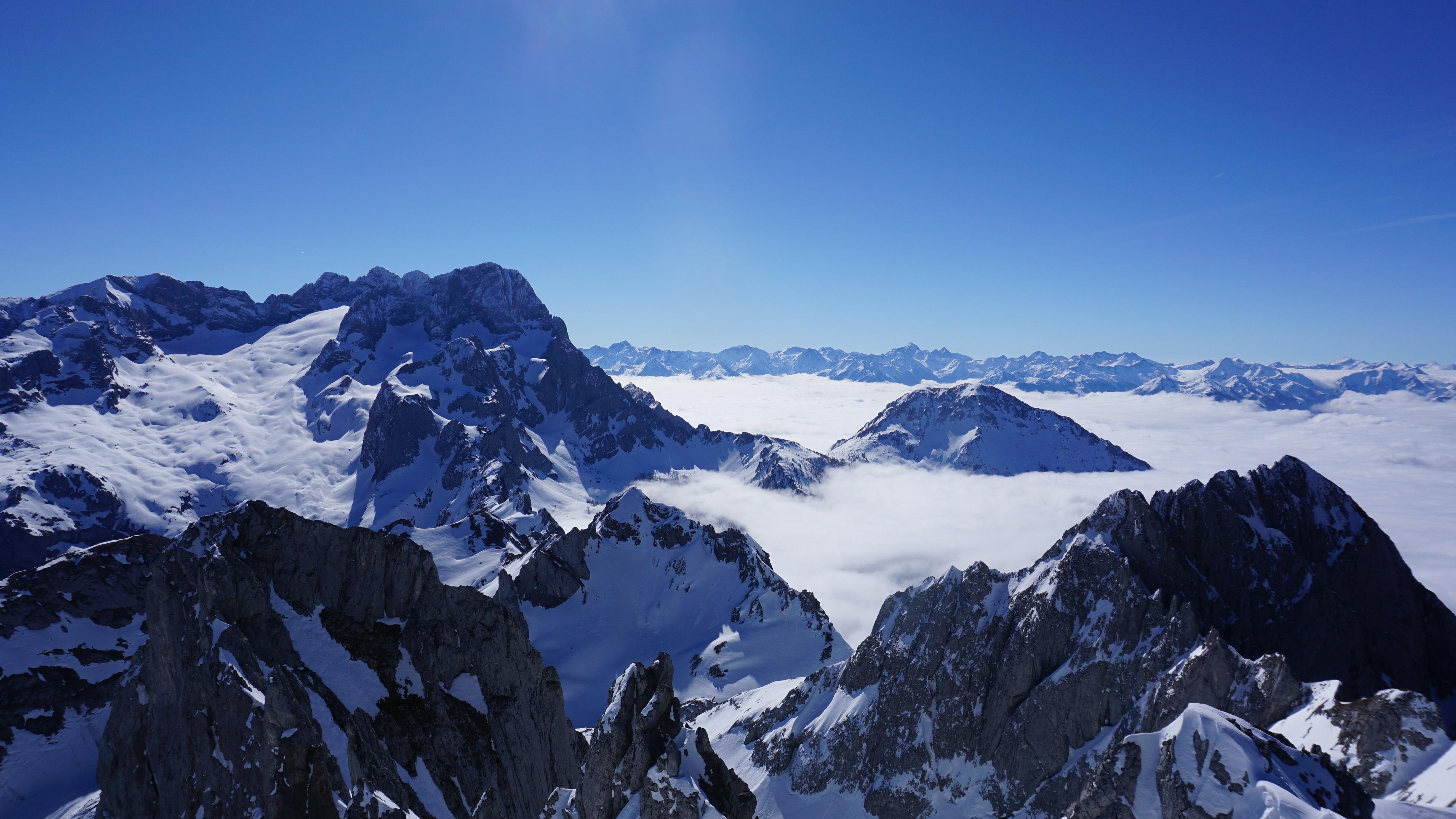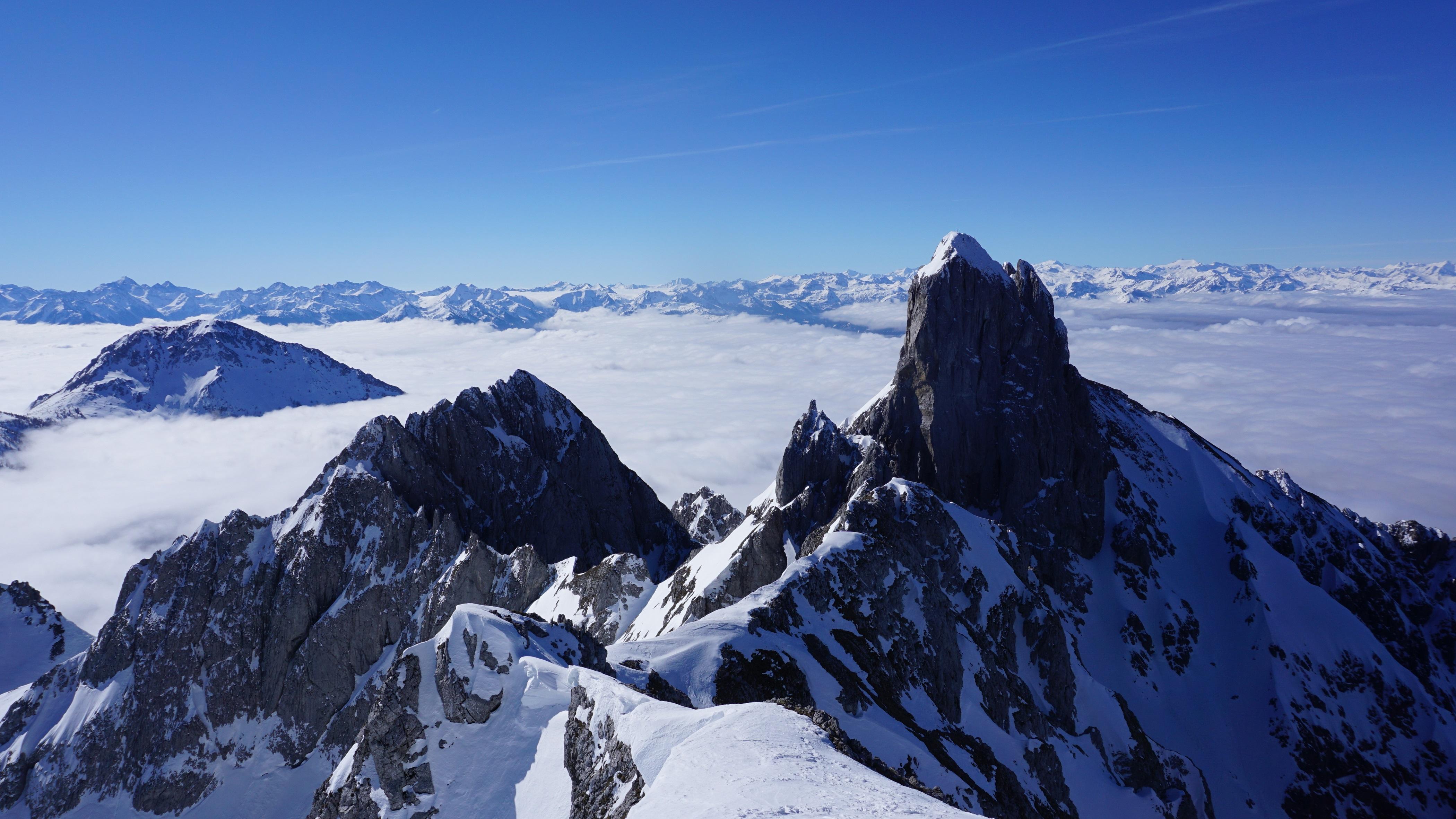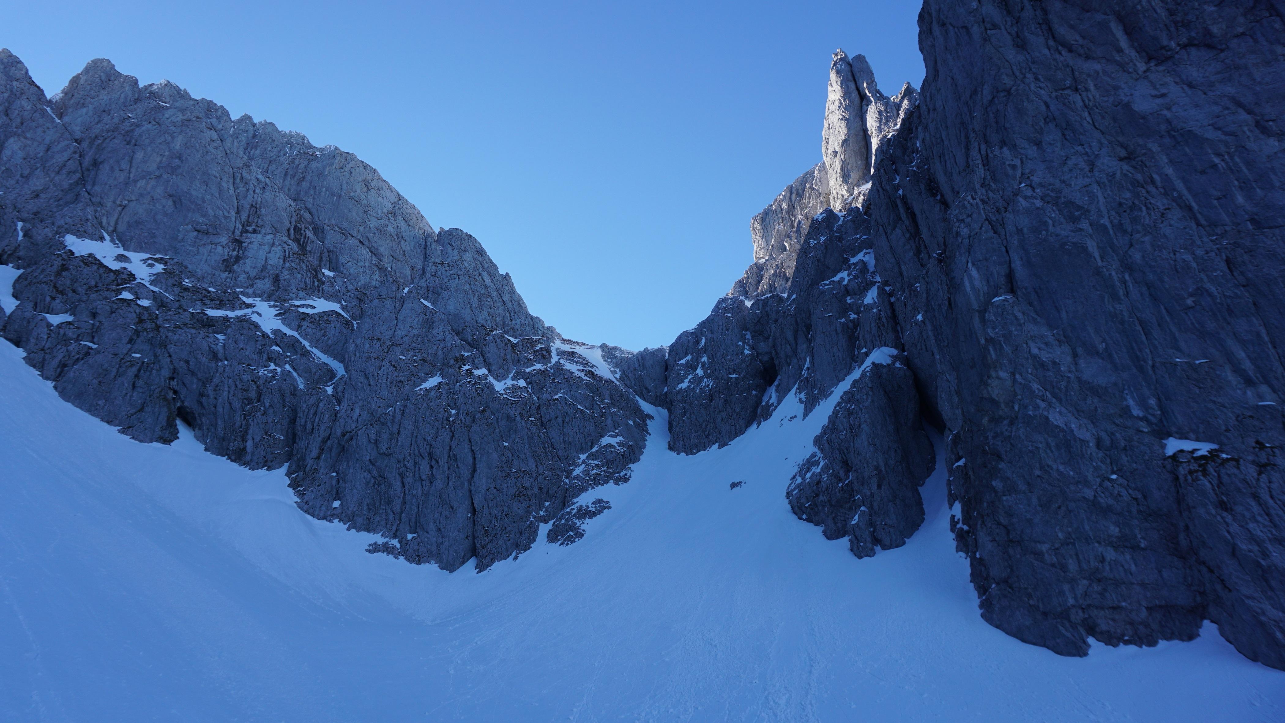 Die ersten 10 Meter morscher Schnee unterm Deckel mit Einsinktiefen bis an die 40 Zentimeter. Keine gute Voraussetzung, aber in dem Bereich für uns keine Lawinengefahr. Kurze Beratung: ok, schaun wir noch ein paar Schritte weiter, ob sich was ändert. Sonst muss ein Plan B her. Nach 10 Metern bis zum Gipfel durchgehend tragender Deckel mit keinem einzigen Durchbruch, wir können teilweise die angelegte Stapfspur nutzen, kraxeln nach der Rampe über Schrofen ins Gipfelkar und um kurz vor 10.00 Uhr sind wir am Gipfel.