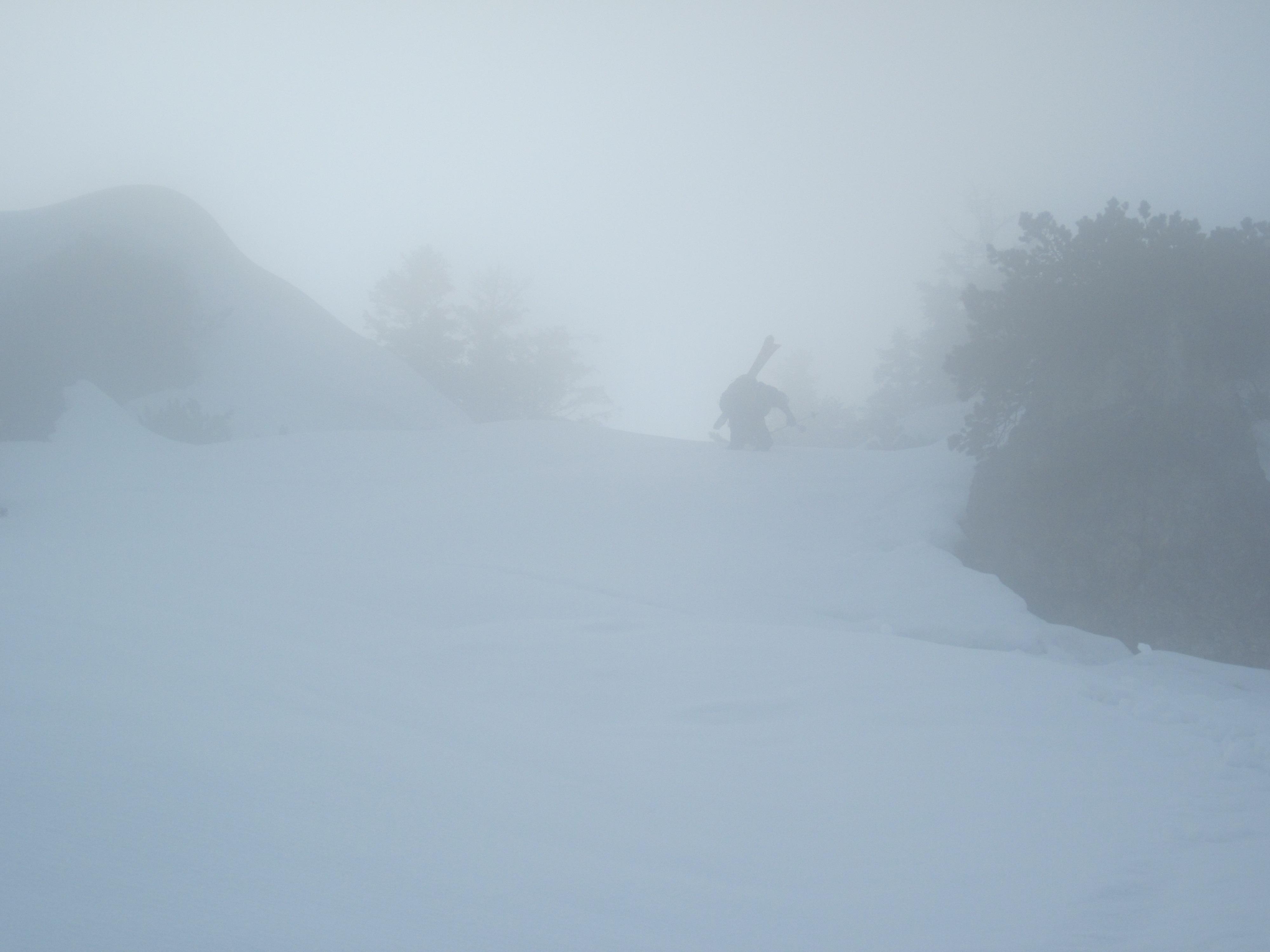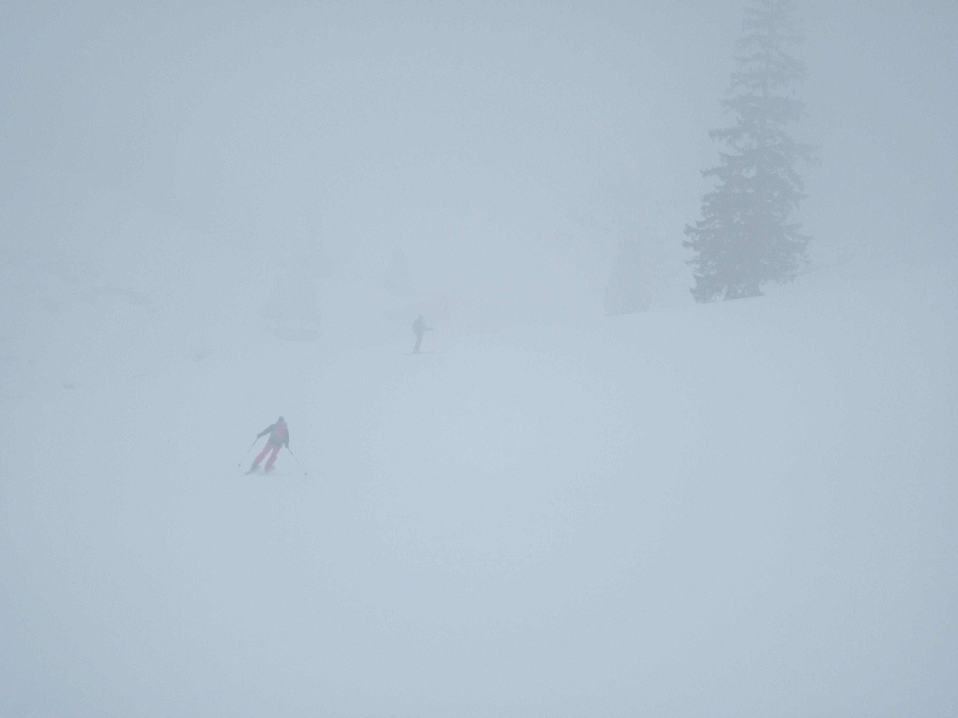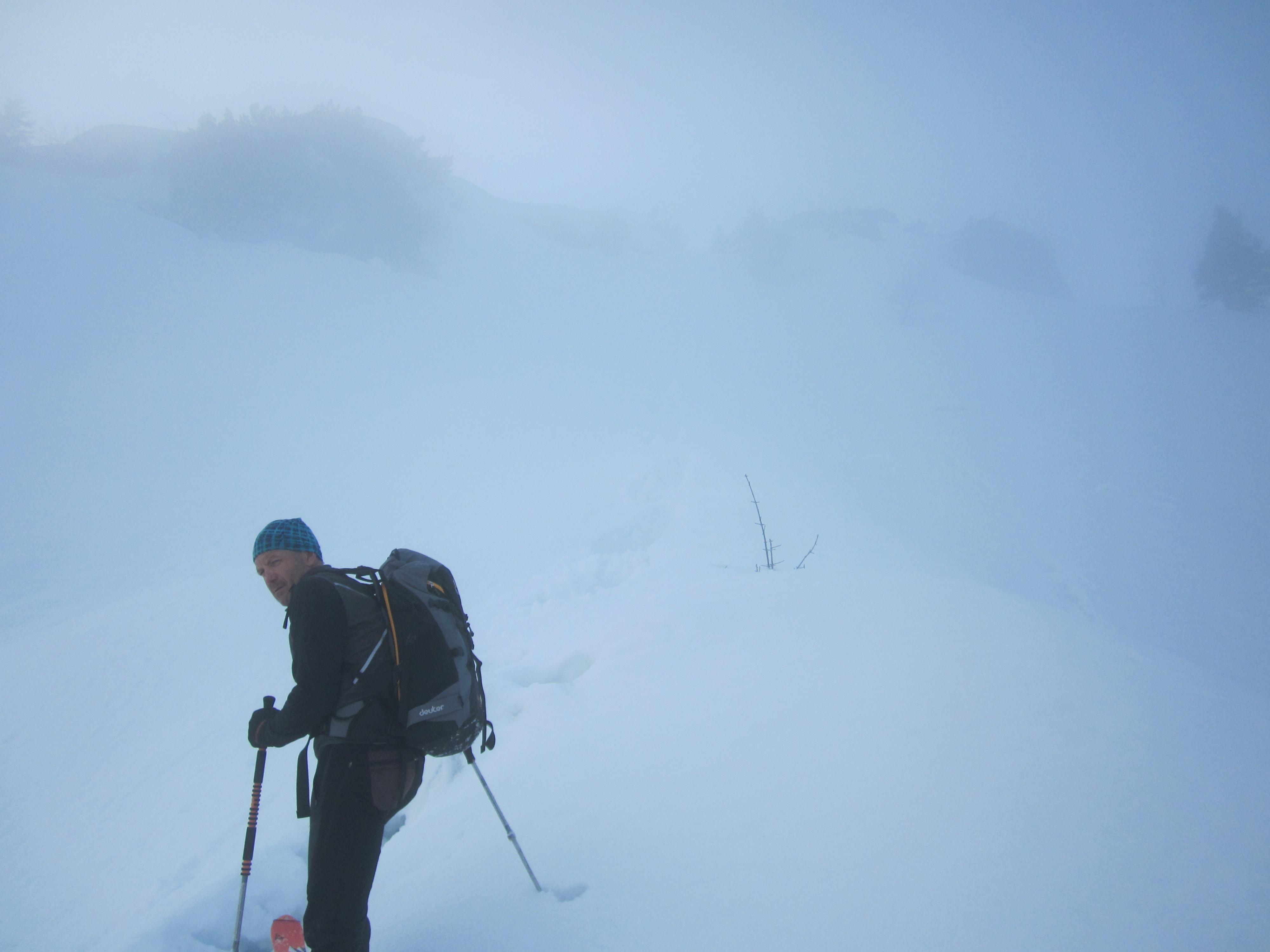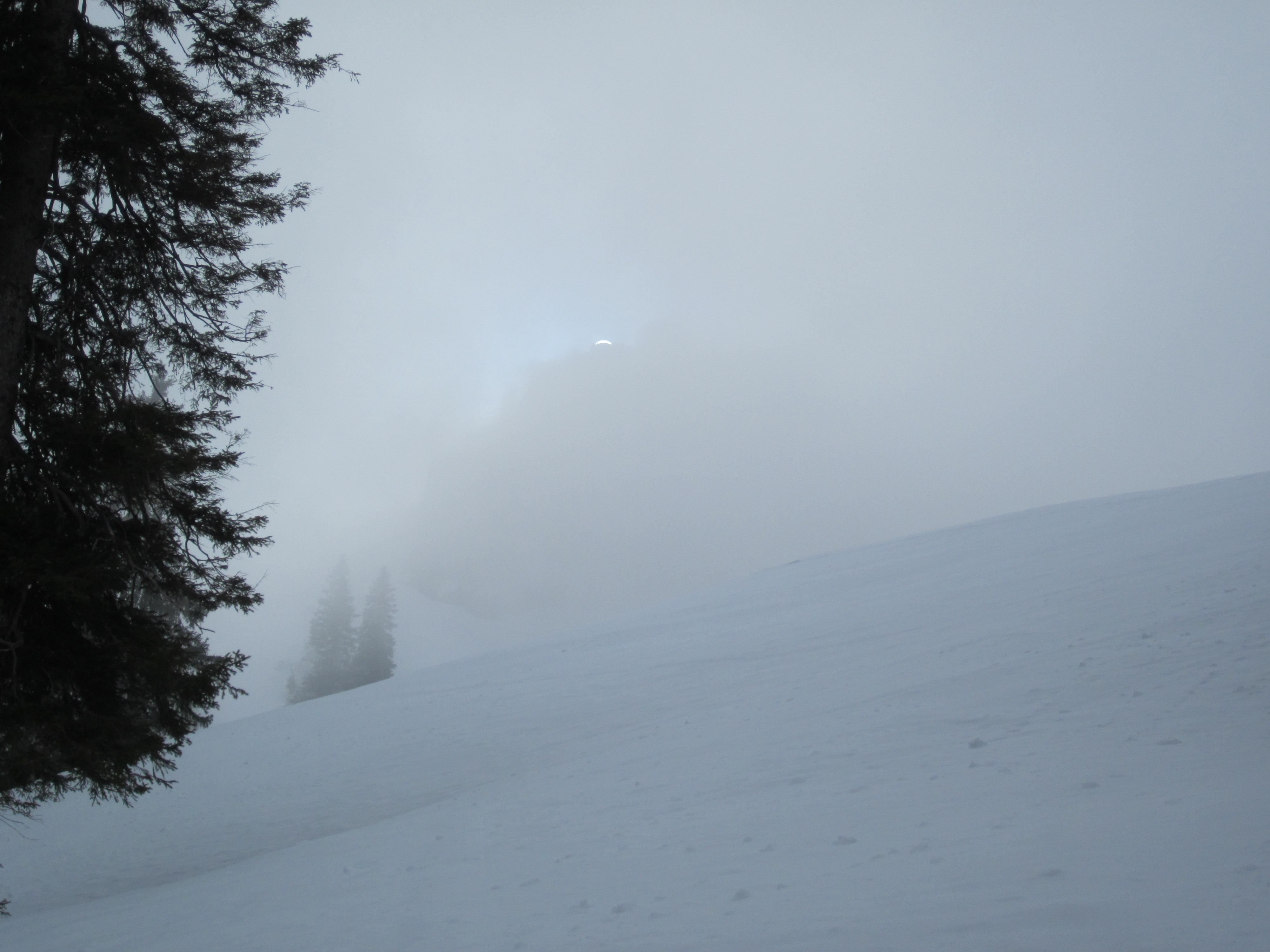 Dem Wetterbericht nach schön brav ab Mittag gestartet - bei Sonne. Zuerst auf die Thorauschneid. Damits drüben durch die erwartete Sonne no a bisserl mehr auffirnt. Auffirnen sollte ....Von der Thorauschneid runter noch schöne, weiche Schwünge bei Sicht, dann auf den Weißgrabenkopf direkt über seine Ostseite - wieder mal im Nebel. Im Aufstieg war der Schnee griffig und weich, pünktlich zur Abfahrt in Bruchharsch umgewandelt.