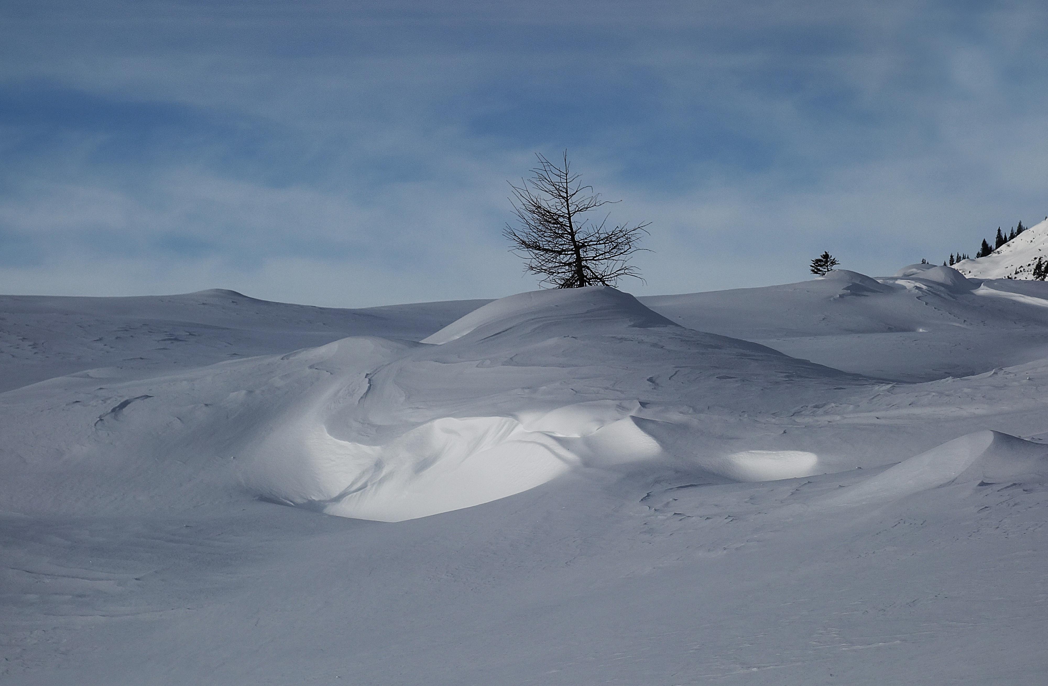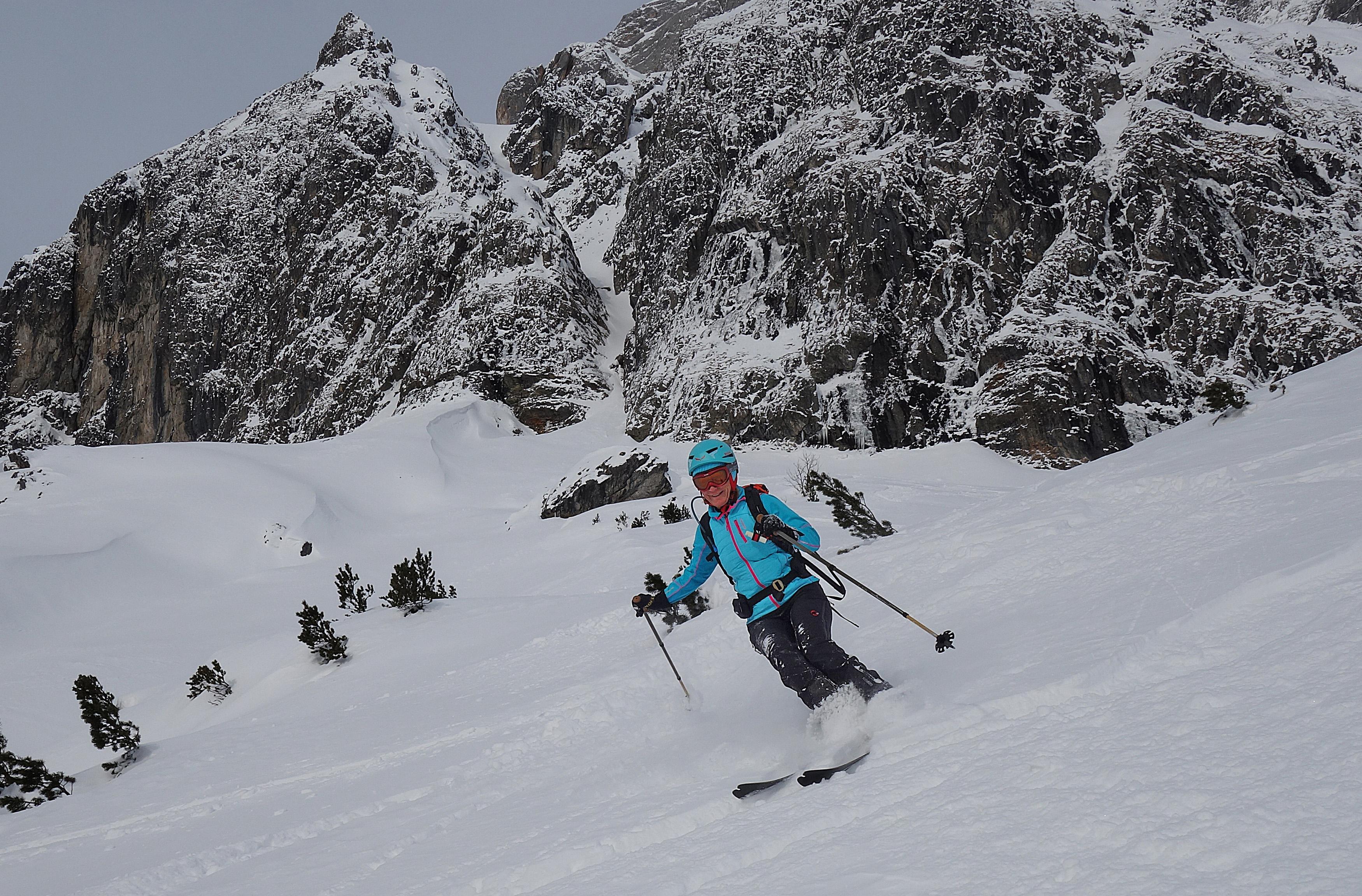 Über den Mitterriedl- noch bei herrlicher Sonne-zum Wandfuß Wetterriffl. Wind unser ständiger Beleiter, von einem Treibschneepack in das nächste aber schönes landschaftliches Landschaftsbild. Leider hat sich die Sonne schneller verzogen als erwartet sodass die Sicht Wünsche offen ließ und das Gleichgewichtsgefühl gefordert wurde. Am Alpenhauptkamm droht schon Föhnsturm, man kann sich den schlechten Zustand der Schneedecke in den nächsten Tagen ausrechnen.