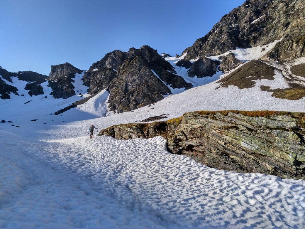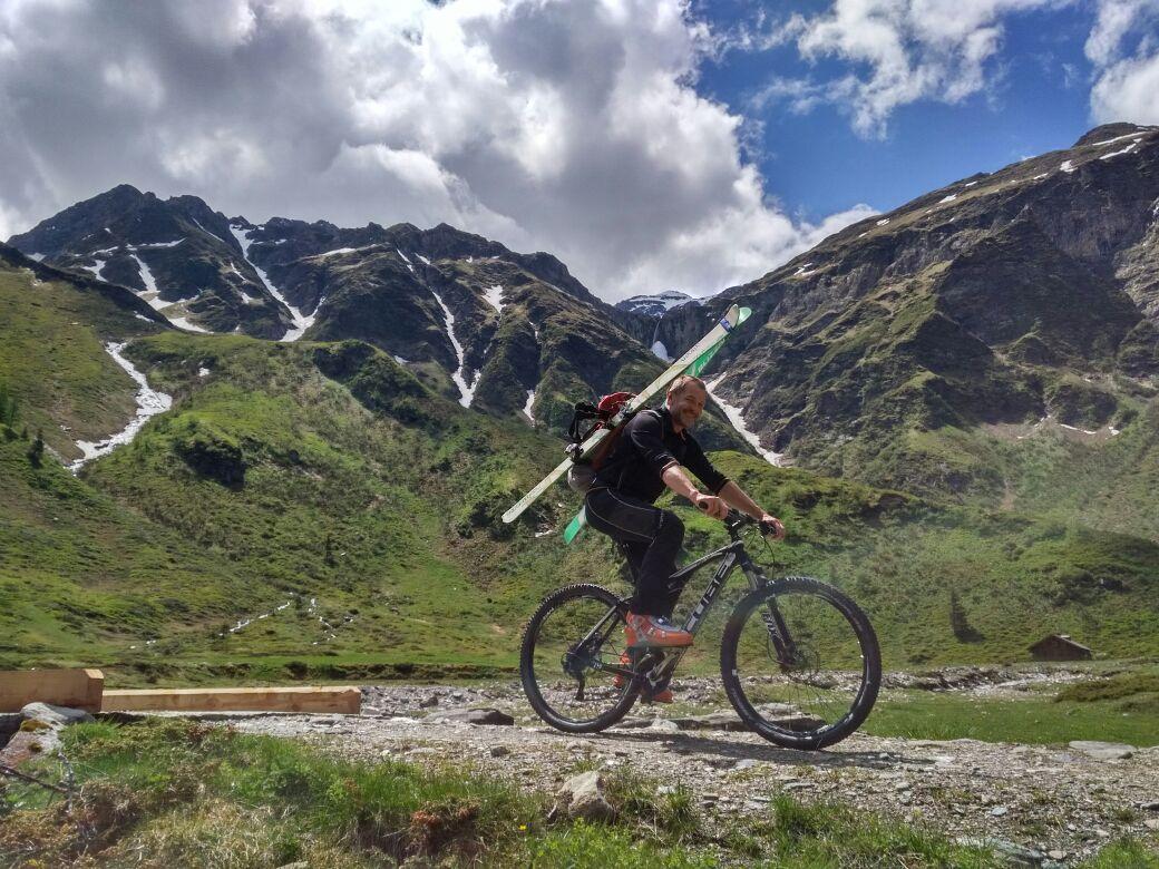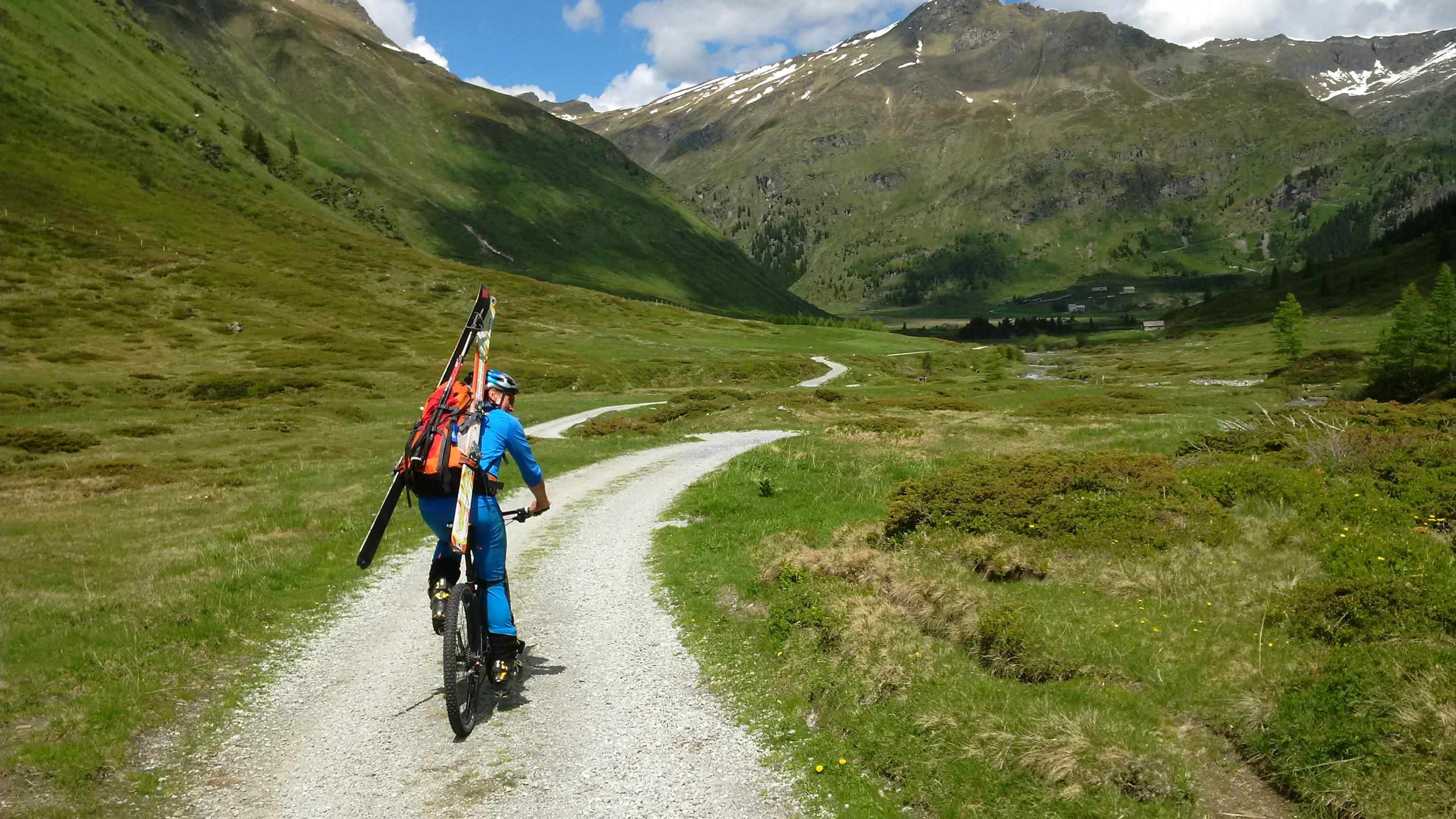 Vorderer Geißlkopf, Saisonabschluss? in der Goldberggruppe. Mit Radl zum Talschluß im Naßfeld, Tragestrecke 400 Hm ins Eselkar, mehrere Unterbrechungen am Südhang des Westerfrölkekogel. zwei Unterbrechungen auch im Nordhang am Übergang zur Wallnerrinne, Abfahrt über die Wallnerrinne und den unteren Graben des Eselkars, Tragestrecke ins Tal zur Veitbauernalm ca. 100Hm.