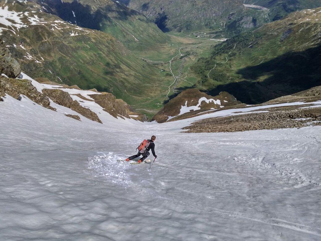 Schnee im Eselkar während des Aufstieges tragend, oberflächlich schon weich. Südseitig zum Teil schon sulzig, die Nordhänge zum Gipfel tragend, bei der Abfahrt weich, in der Wallnerrine Firn. Abfahrt um 10.00 Uhr. In Summe sehr gute Verhältnisse für eine "Sommerskitour".