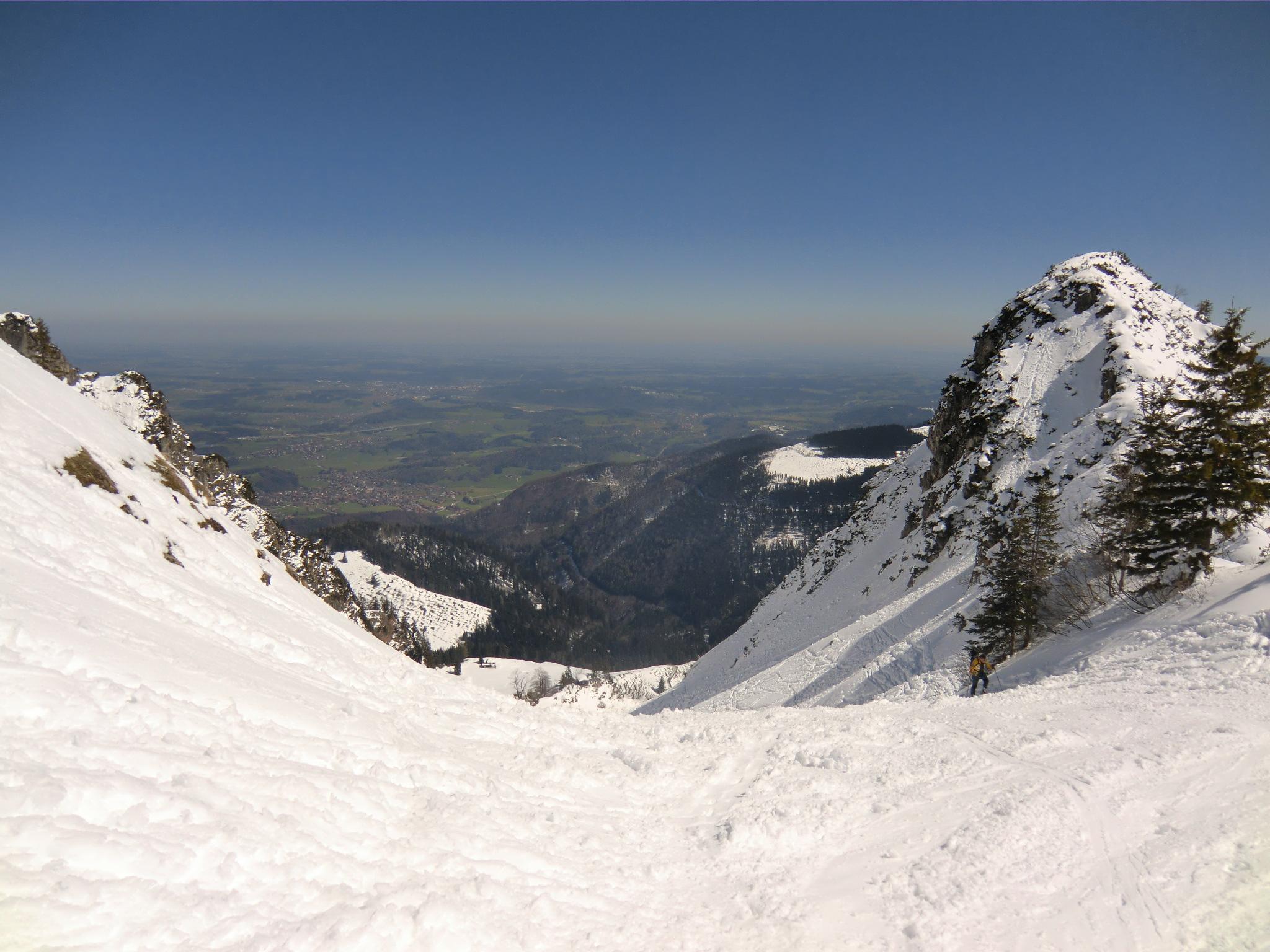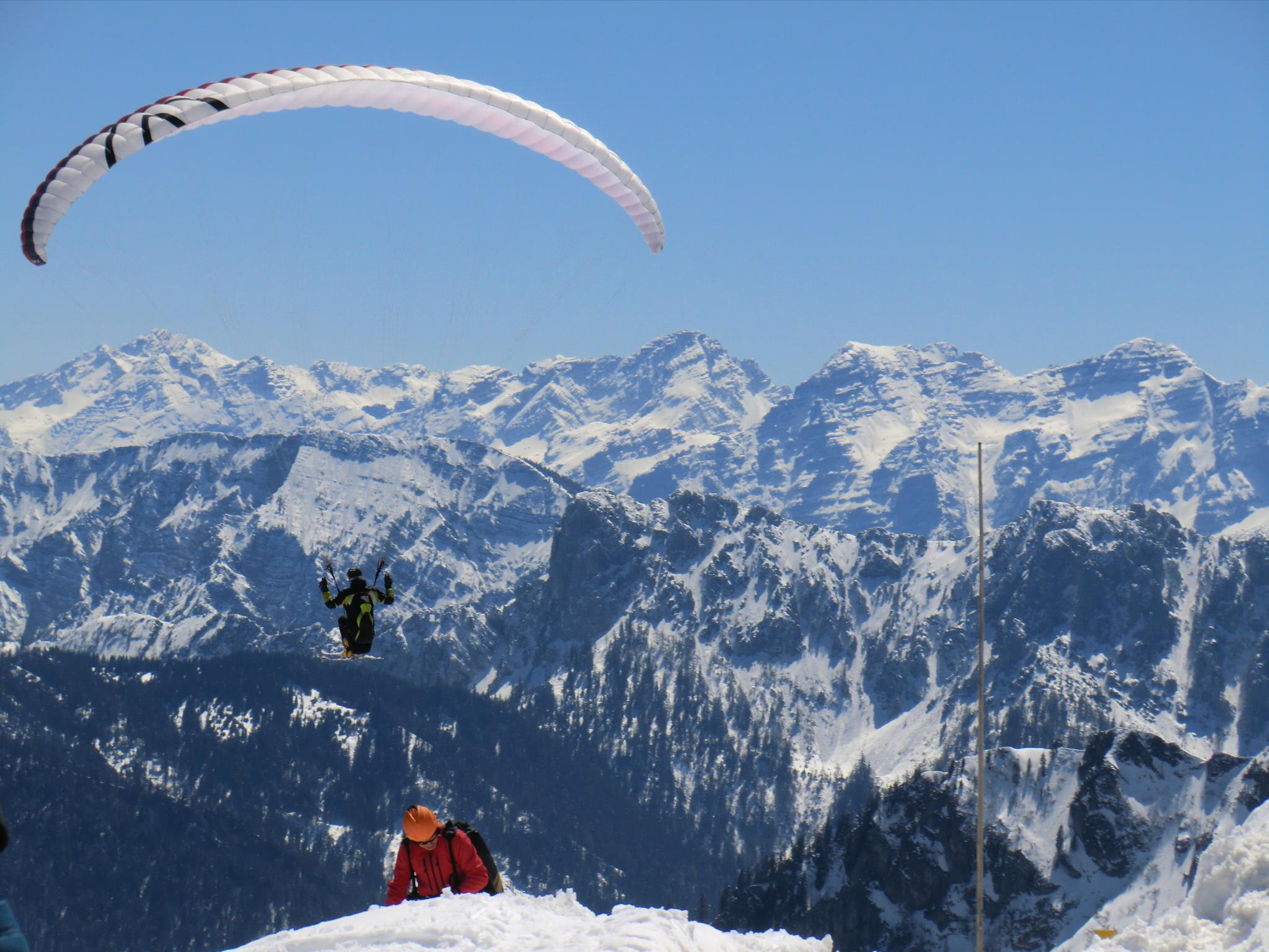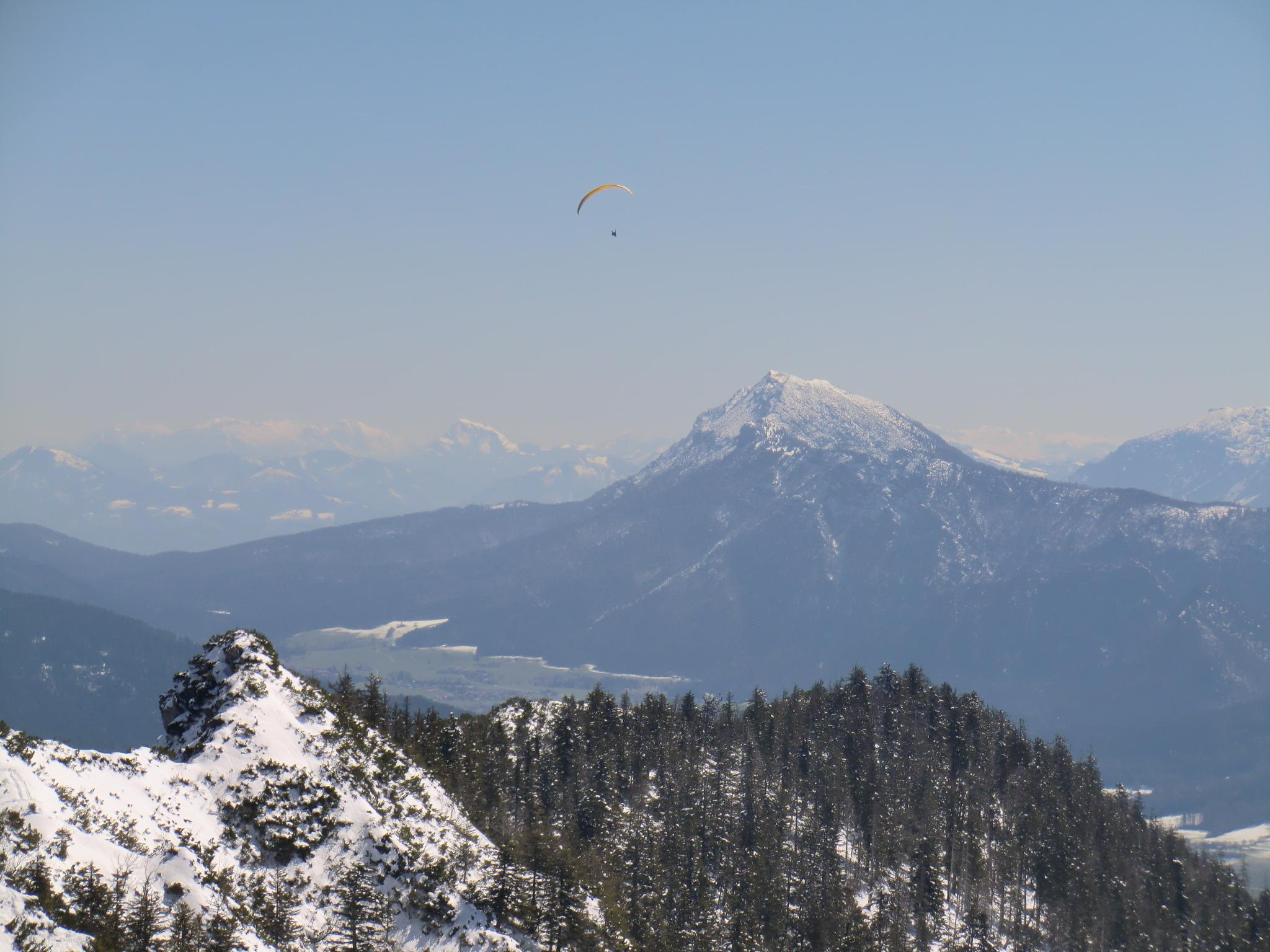 Dank dem Tip vom Seiler Hans gings heut von Kohlstatt (Bergen) hinauf. Tragen bis zum ersten ordentlichen Weiß ca. 20 Minuten. Bis zur Bründling im Schatten eine harschig-harte Schneedecke. Die Sonne hat sich angestrengt und das alles dann in butterweiche Piste verwandelt. Der Pulver von gestern ist natürlich passé - dafür jetzt Piste olé. Kein großer Andrang von Tourengehern, dafür sind die Paragleiter minütlich gestartet. Ein schöner Spielplatz für Luftikusse und Schneehasen... immer noch. Luxus !