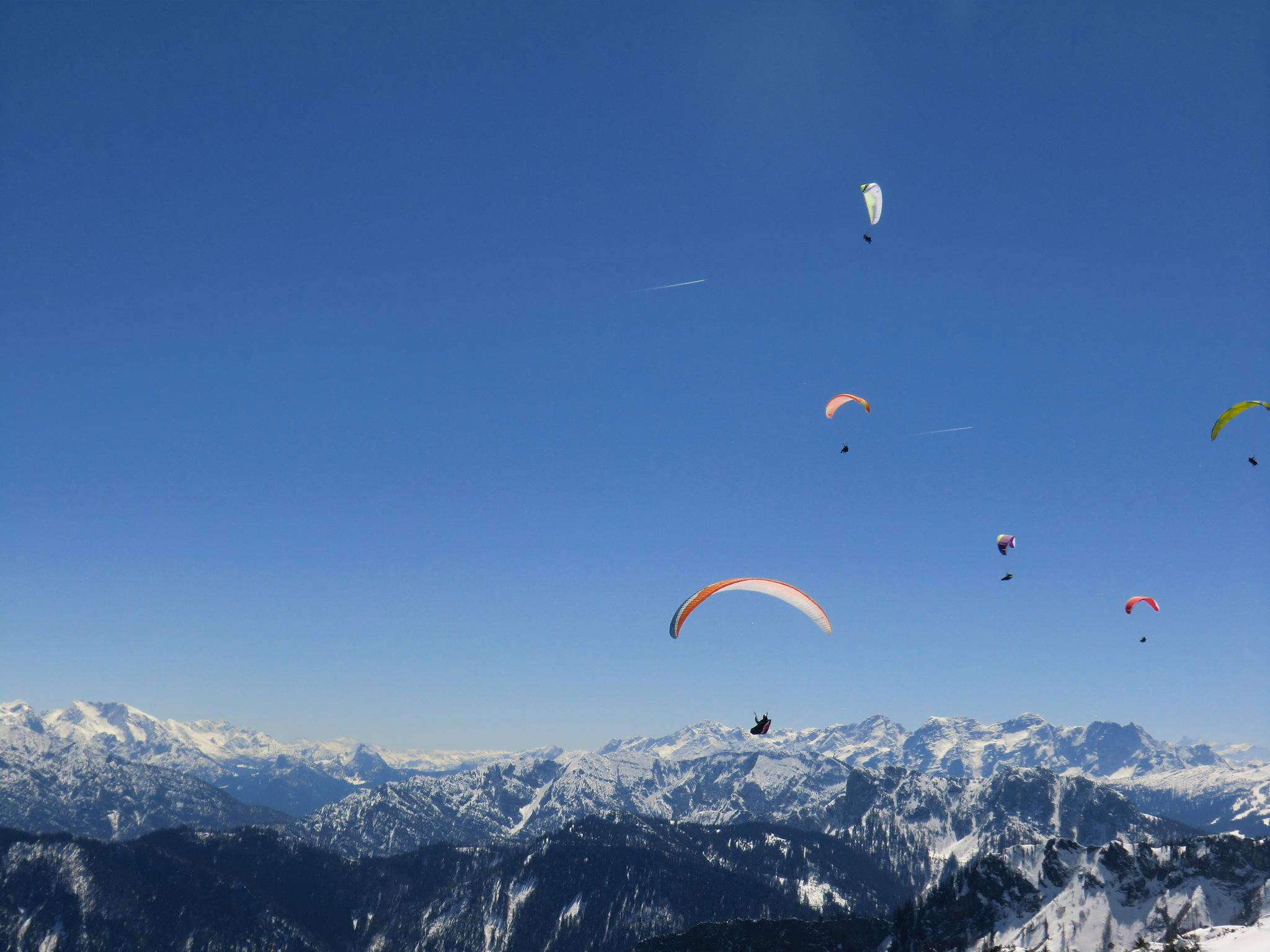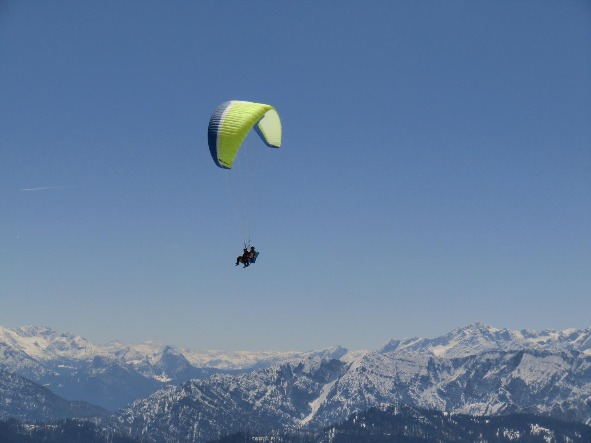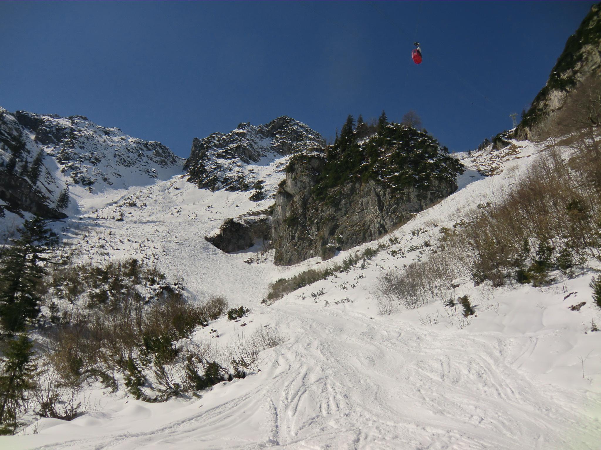 Dank dem Tip vom Seiler Hans gings heut von Kohlstatt (Bergen) hinauf. Tragen bis zum ersten ordentlichen Weiß ca. 20 Minuten. Bis zur Bründling im Schatten eine harschig-harte Schneedecke. Die Sonne hat sich angestrengt und das alles dann in butterweiche Piste verwandelt. Der Pulver von gestern ist natürlich passé - dafür jetzt Piste olé. Kein großer Andrang von Tourengehern, dafür sind die Paragleiter minütlich gestartet. Ein schöner Spielplatz für Luftikusse und Schneehasen... immer noch. Luxus !