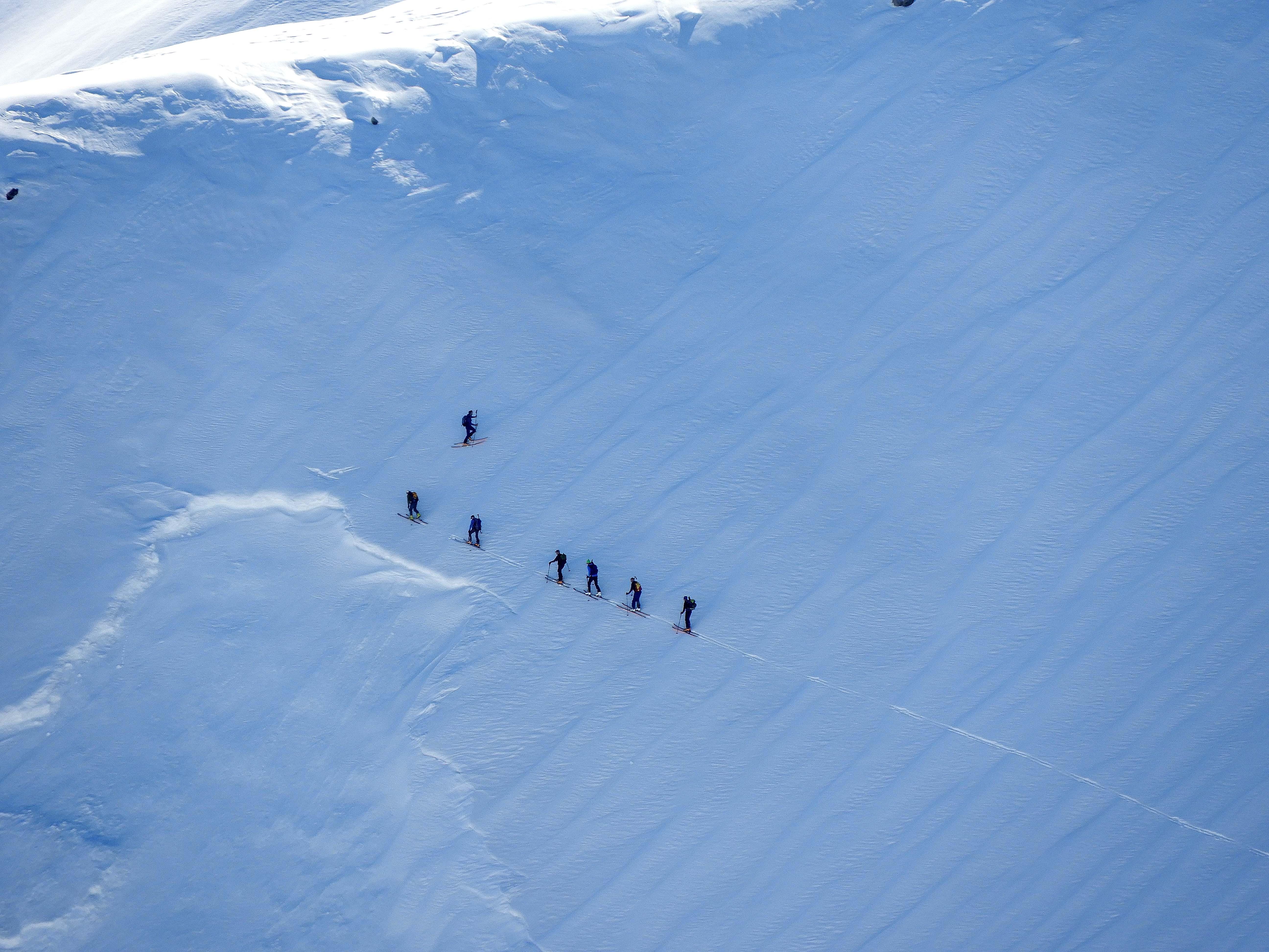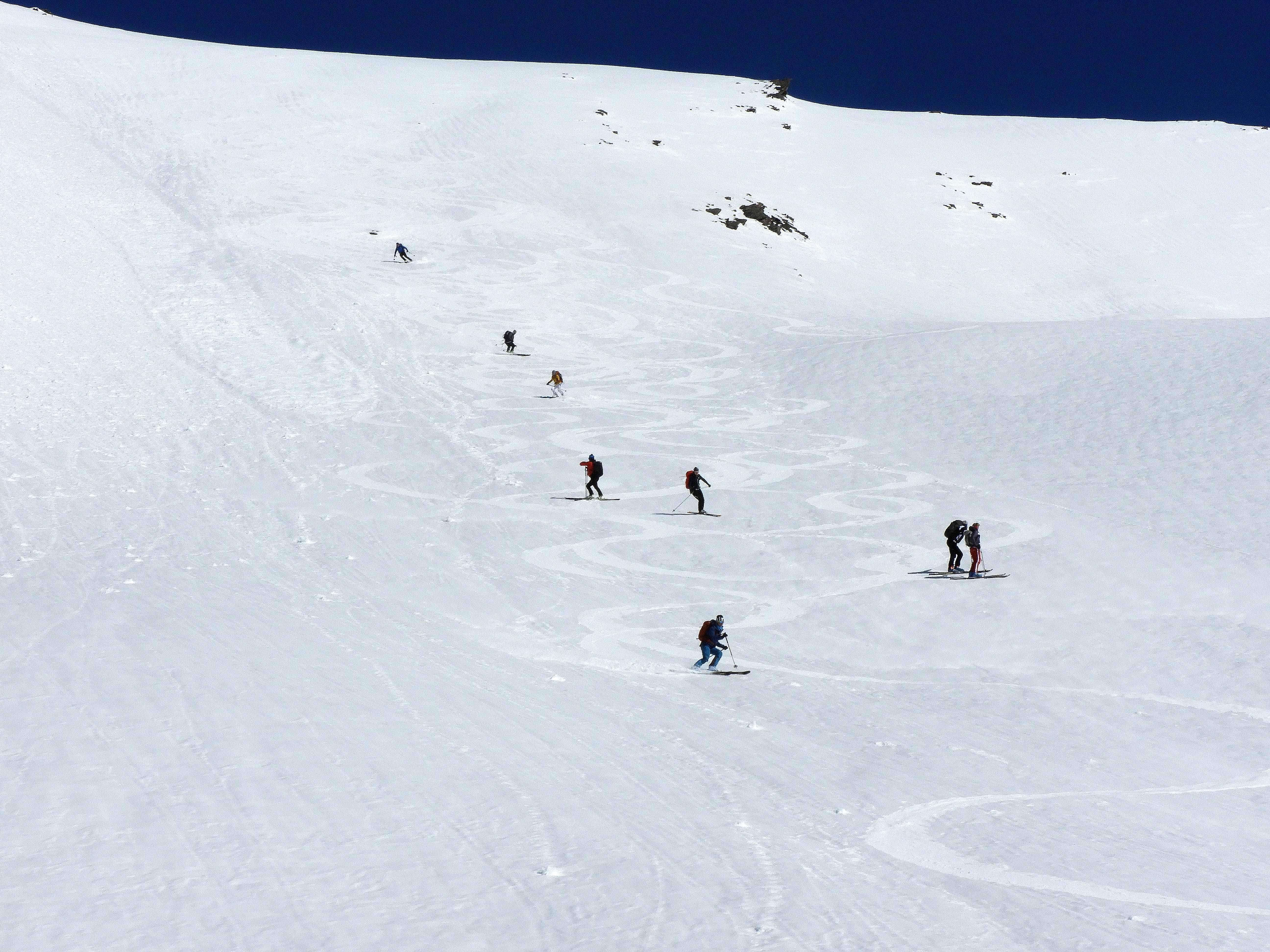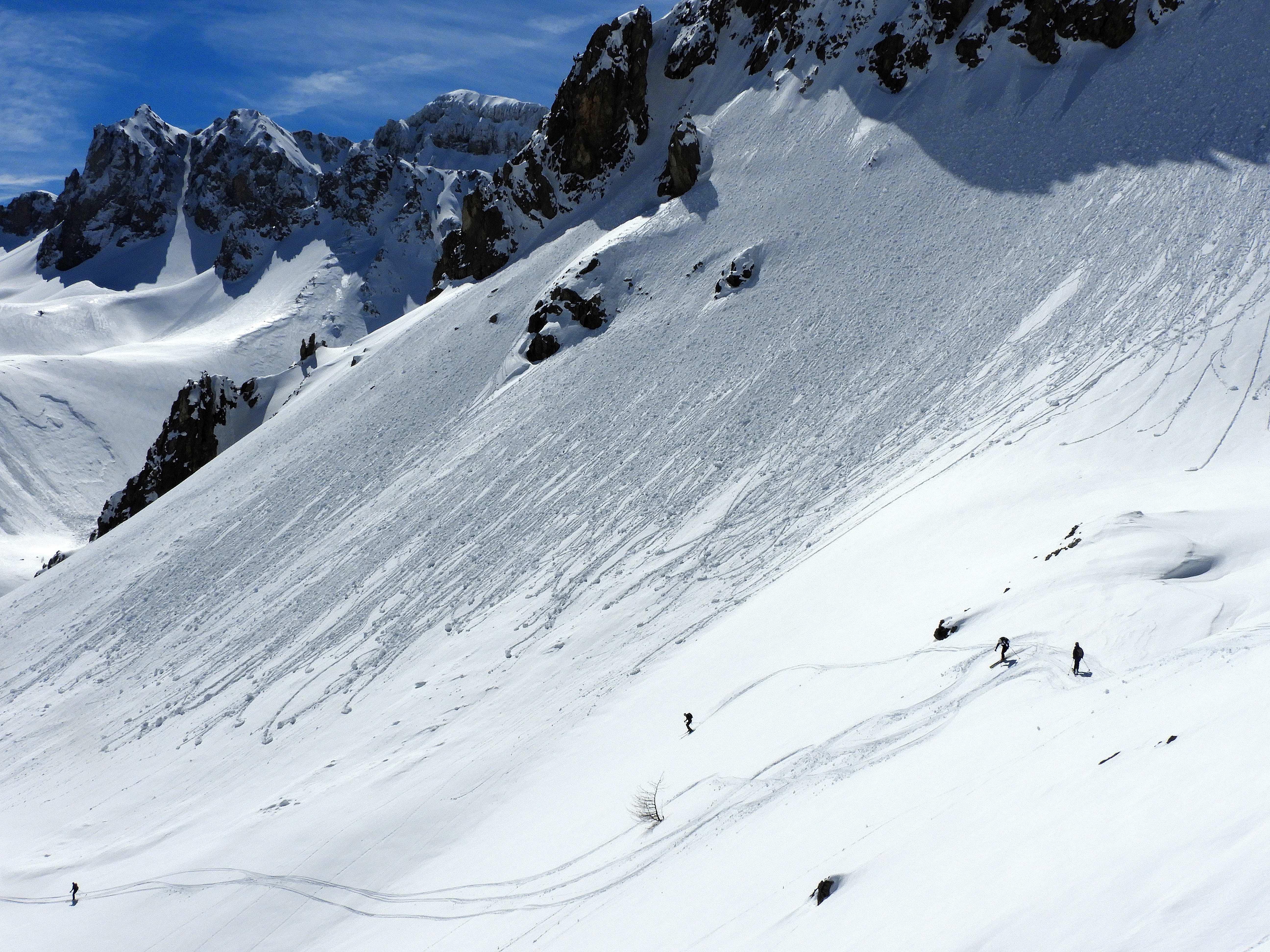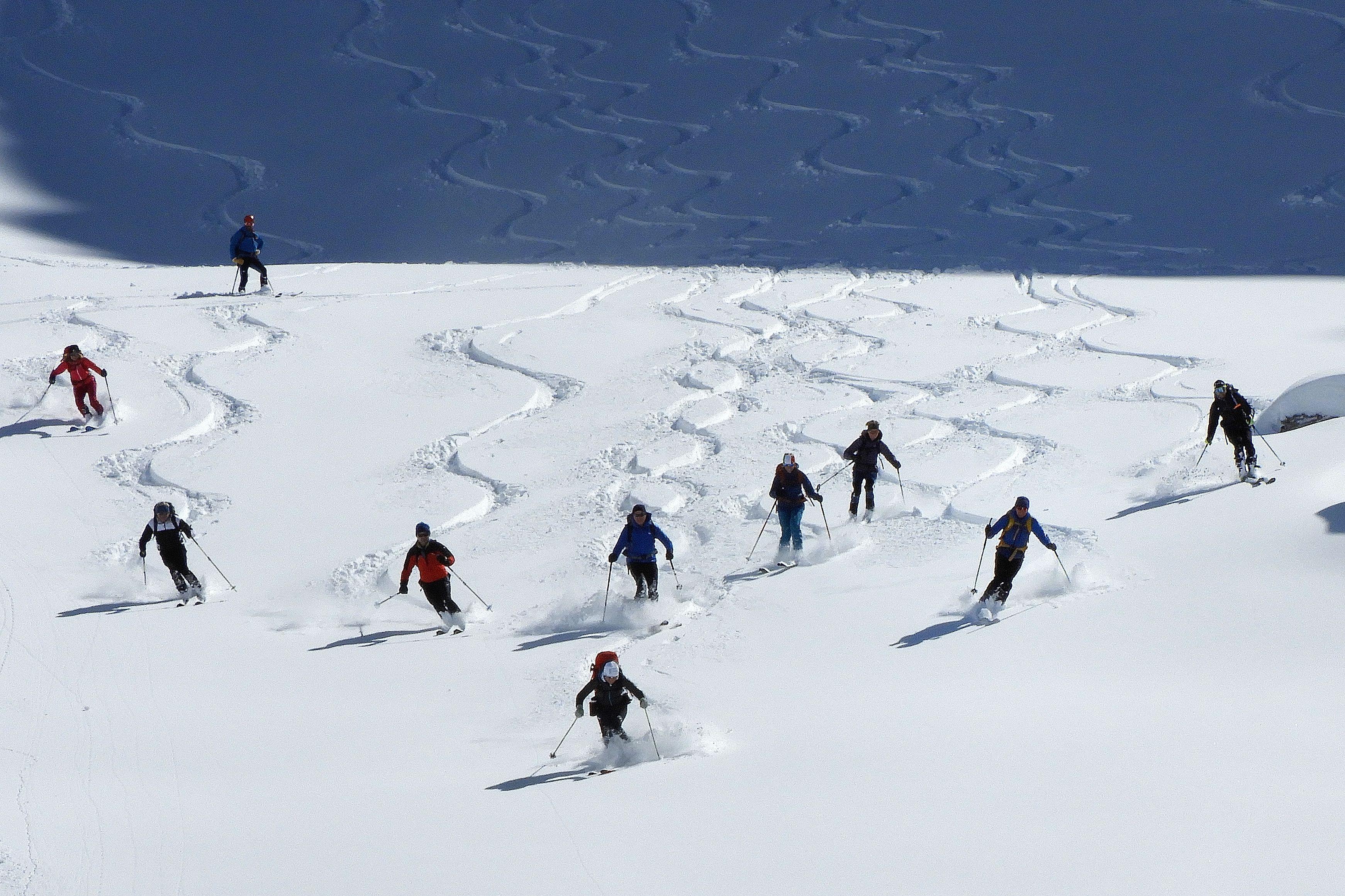 Von 25.3.- 1.4.2017 fuhren wir in das Piemont und zwar ins Valle Maira, um in dieser traumhaften und noch sehr ruhigen Gegend einige Touren zu machen. Die Woche zuvor hatte es 90 cm geschneit und am Tag vor unserer Ankunft bis auf 2600m geregnet. In der Nacht schneite es dann bis ins Tal herab. Dadurch setzte sich der Neuschnee sehr gut und am ersten Morgen lagen bei herrlichem Wetter auf guter Unterlage cm 30cm Pulver. An den nächsten Tagen nahm die Erwärmung bis in große Höhen immer mehr zu und es gab aus den Ost und Südhängen große Nassschneelawinen. Nur an den nordseitigen Hängen lag die ersten 3 Tage noch Pulver. Da durch die rasche Erwärmung der Schnee auf Ost Süd schon am frühen Vormittag für tiefen Firn sorgte, fuhren wir auf den westseitigen Hängen zur Mittagszeit ab. Alleine daraus sieht man schon die unendlichen Möglichkeiten für Touren in diesem Gebiet. Pulver -Pulver Firn - Firn , wir hatten an diesen 6 Tagen alles was das Herz begehrte. Diese Verhältnisse zwangen uns aber zu einer genauen Routenwahl und Vorsicht. Die Abfahrt von ca. 3000m bis ins Tal ca.1400 m war möglich. Dieser Bericht soll zeigen, dass man in einer Woche die Schneeverhältnisse des ganzen Winters erleben kann und das bei wolkenlosem Wetter.