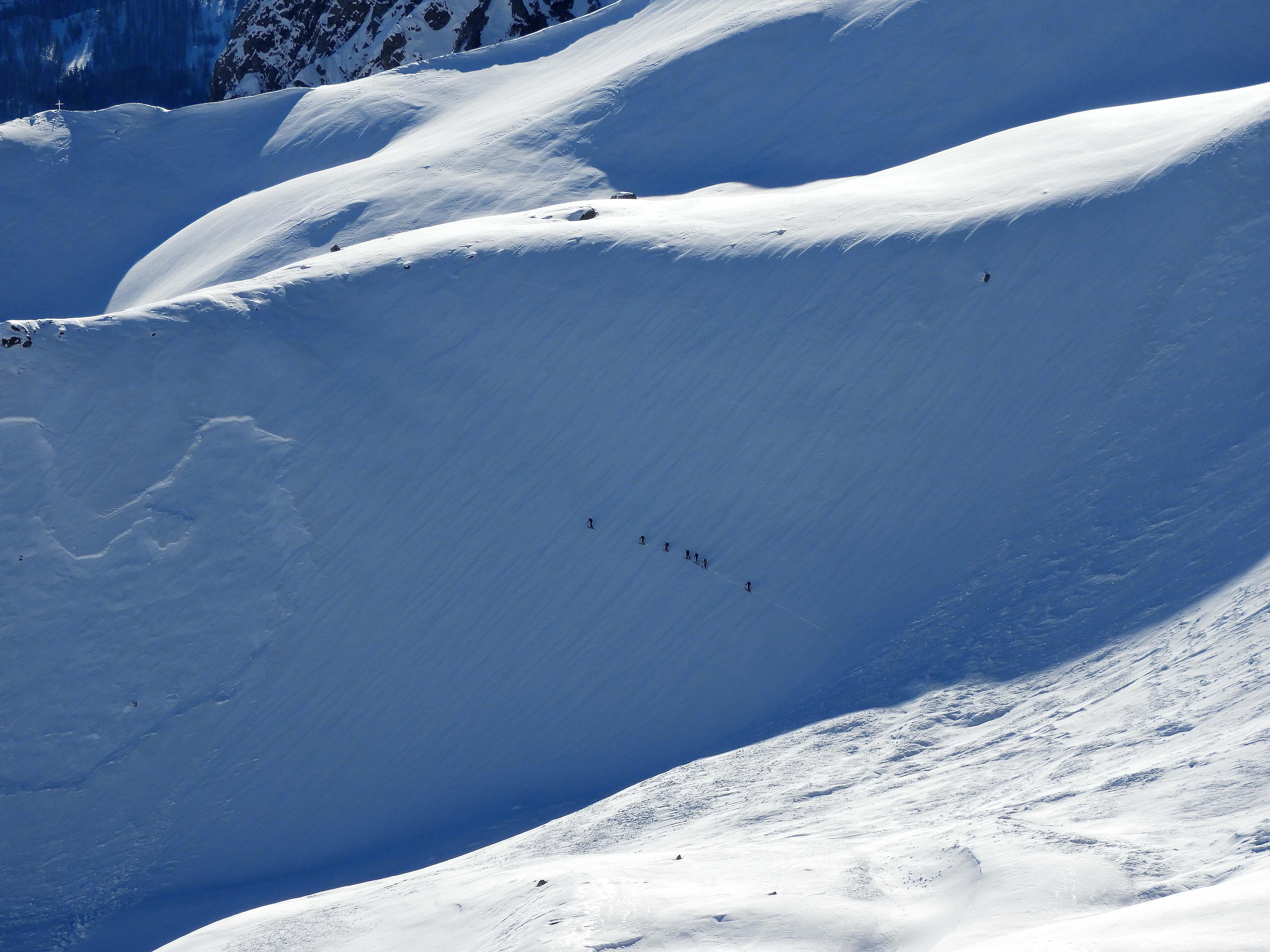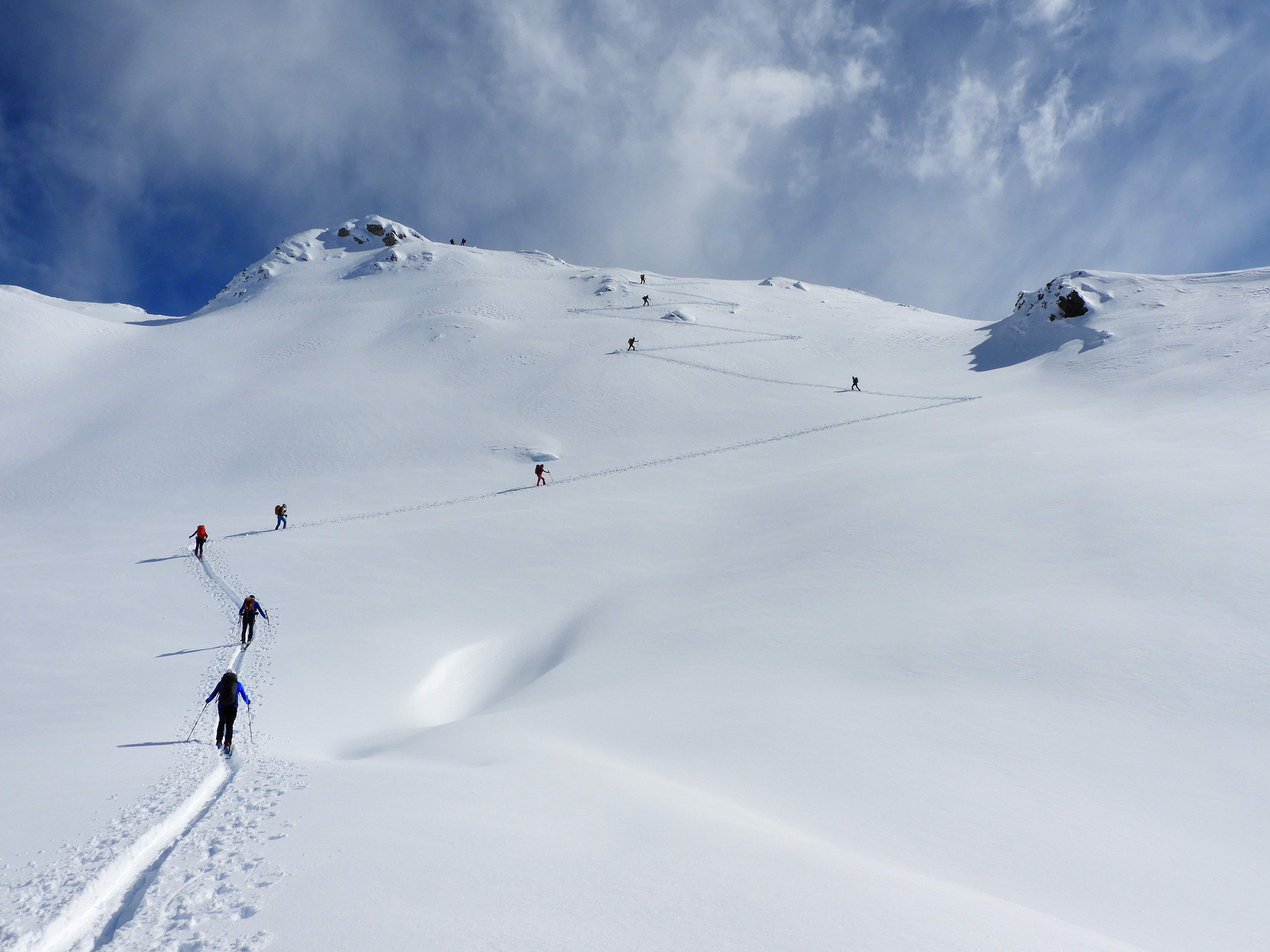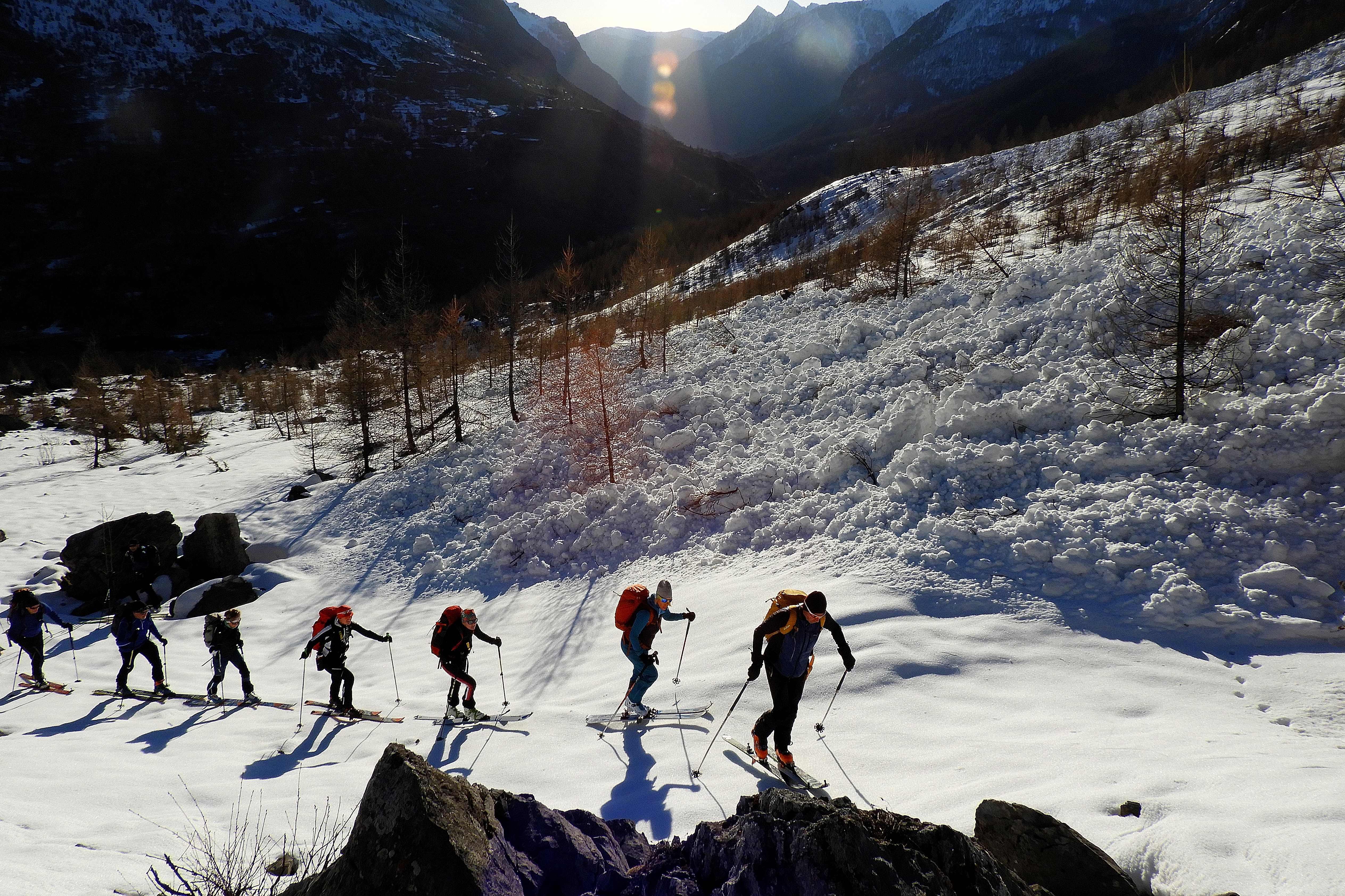 Von 25.3.- 1.4.2017 fuhren wir in das Piemont und zwar ins Valle Maira, um in dieser traumhaften und noch sehr ruhigen Gegend einige Touren zu machen. Die Woche zuvor hatte es 90 cm geschneit und am Tag vor unserer Ankunft bis auf 2600m geregnet. In der Nacht schneite es dann bis ins Tal herab. Dadurch setzte sich der Neuschnee sehr gut und am ersten Morgen lagen bei herrlichem Wetter auf guter Unterlage cm 30cm Pulver. An den nächsten Tagen nahm die Erwärmung bis in große Höhen immer mehr zu und es gab aus den Ost und Südhängen große Nassschneelawinen. Nur an den nordseitigen Hängen lag die ersten 3 Tage noch Pulver. Da durch die rasche Erwärmung der Schnee auf Ost Süd schon am frühen Vormittag für tiefen Firn sorgte, fuhren wir auf den westseitigen Hängen zur Mittagszeit ab. Alleine daraus sieht man schon die unendlichen Möglichkeiten für Touren in diesem Gebiet. Pulver -Pulver Firn - Firn , wir hatten an diesen 6 Tagen alles was das Herz begehrte. Diese Verhältnisse zwangen uns aber zu einer genauen Routenwahl und Vorsicht. Die Abfahrt von ca. 3000m bis ins Tal ca.1400 m war möglich. Dieser Bericht soll zeigen, dass man in einer Woche die Schneeverhältnisse des ganzen Winters erleben kann und das bei wolkenlosem Wetter.