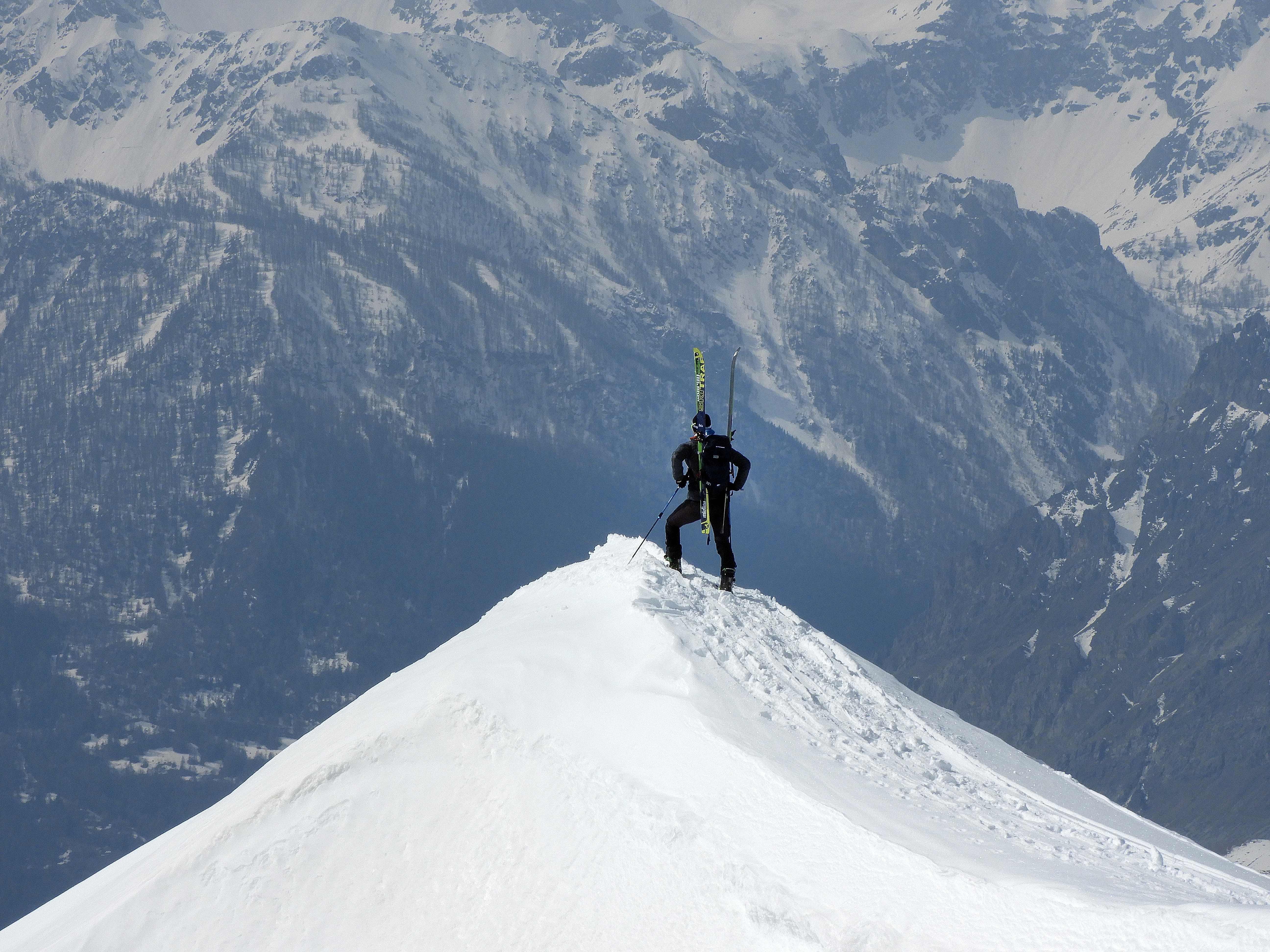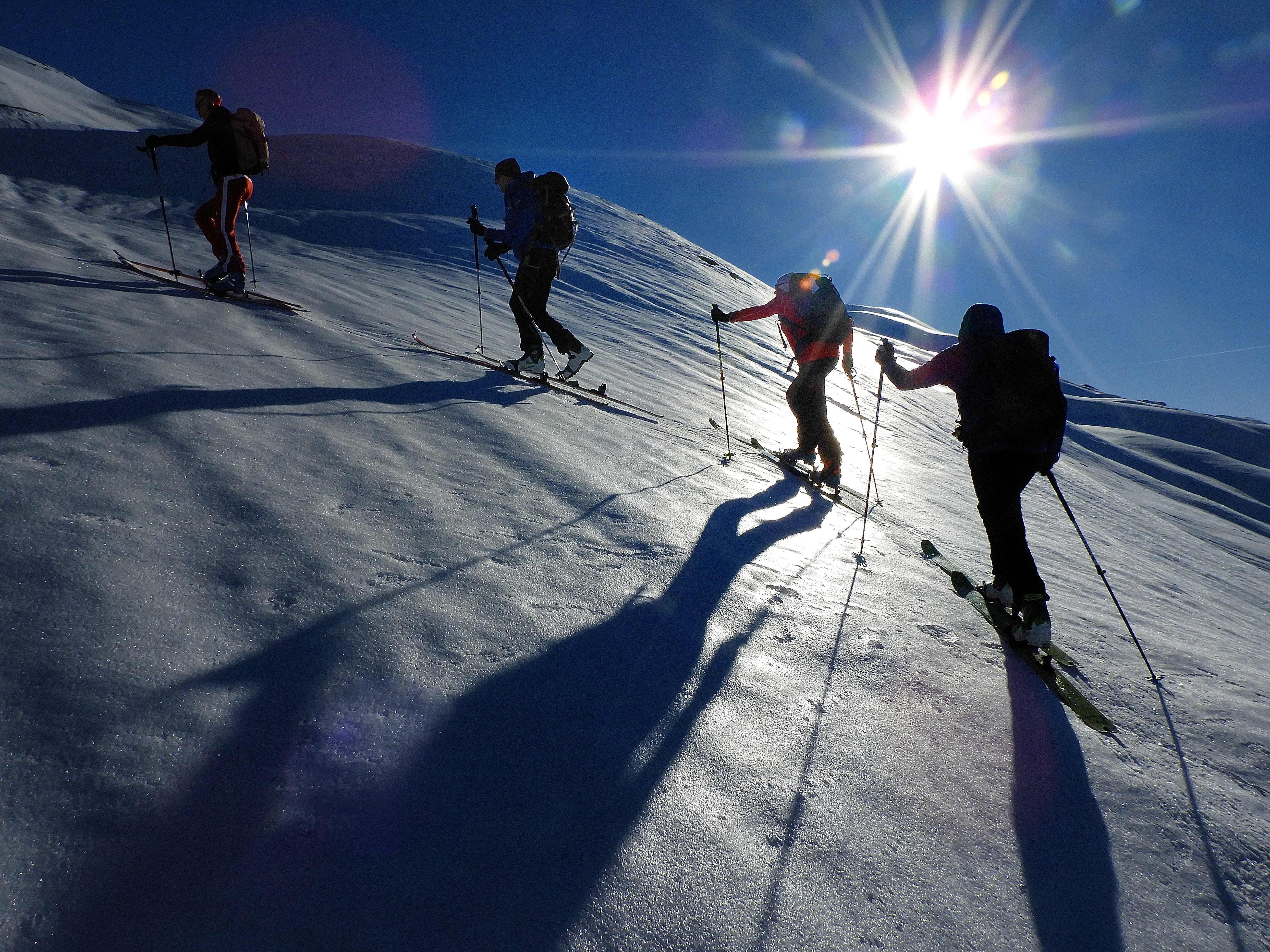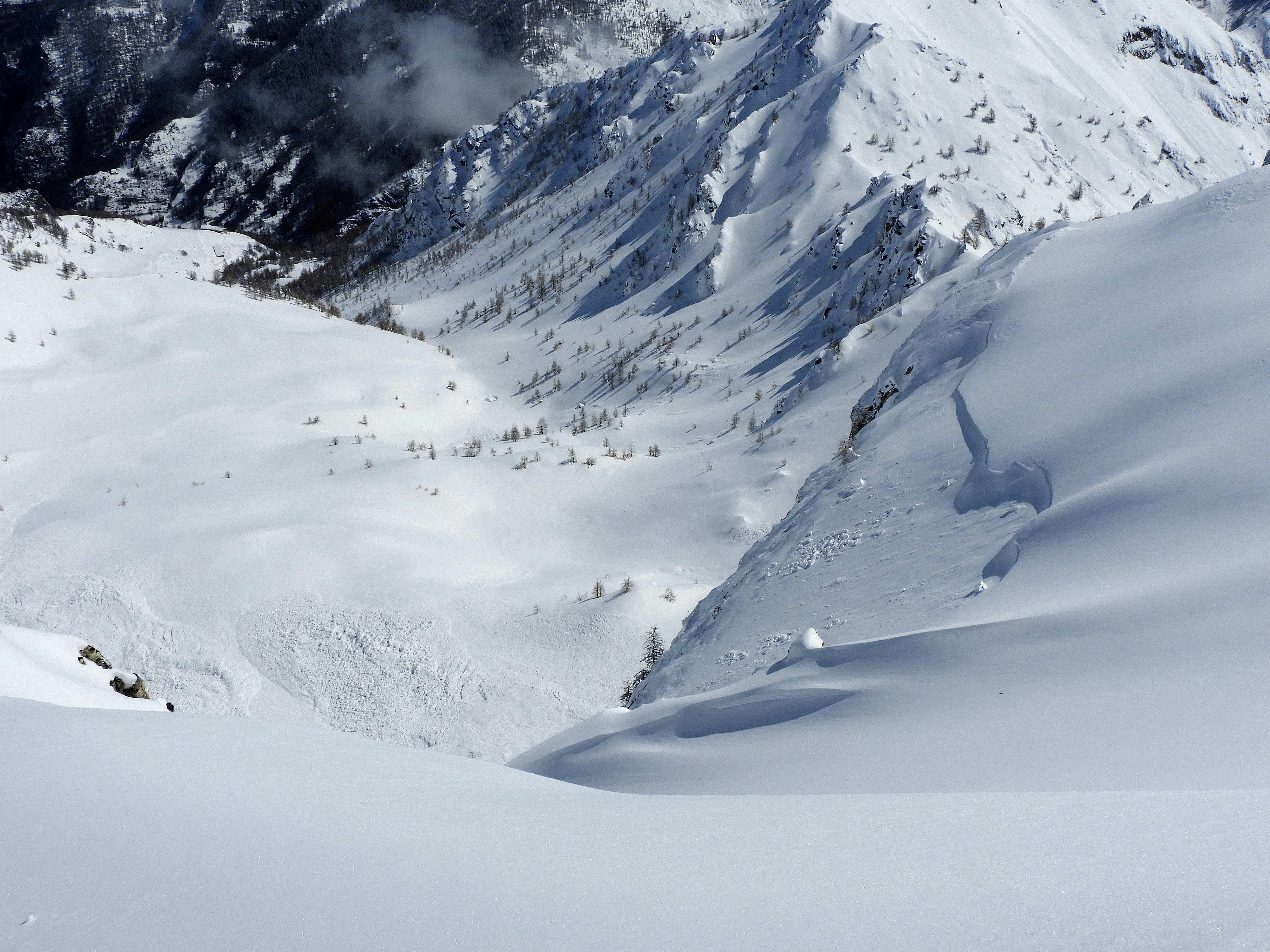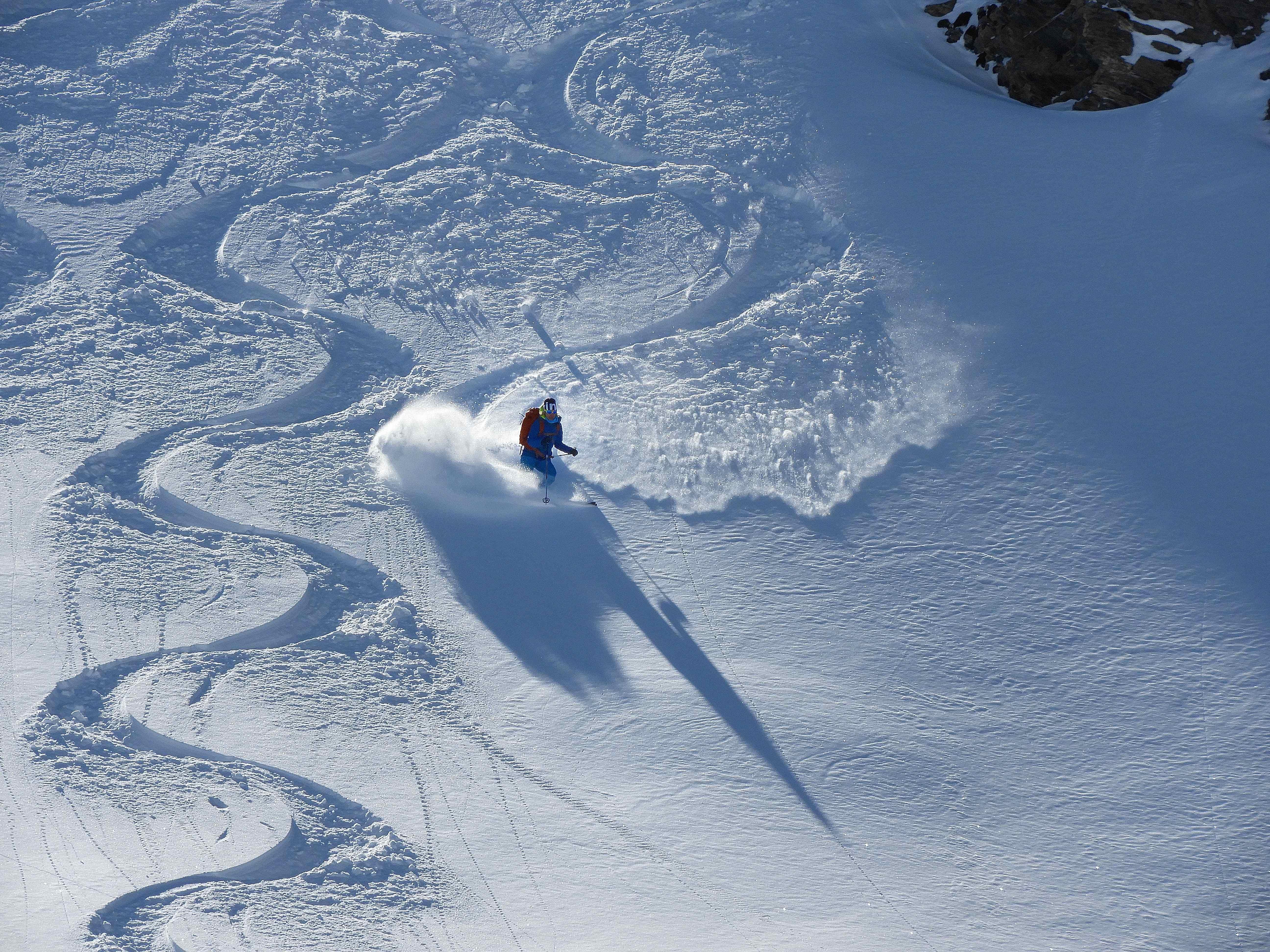 Von 25.3.- 1.4.2017 fuhren wir in das Piemont und zwar ins Valle Maira, um in dieser traumhaften und noch sehr ruhigen Gegend einige Touren zu machen. Die Woche zuvor hatte es 90 cm geschneit und am Tag vor unserer Ankunft bis auf 2600m geregnet. In der Nacht schneite es dann bis ins Tal herab. Dadurch setzte sich der Neuschnee sehr gut und am ersten Morgen lagen bei herrlichem Wetter auf guter Unterlage cm 30cm Pulver. An den nächsten Tagen nahm die Erwärmung bis in große Höhen immer mehr zu und es gab aus den Ost und Südhängen große Nassschneelawinen. Nur an den nordseitigen Hängen lag die ersten 3 Tage noch Pulver. Da durch die rasche Erwärmung der Schnee auf Ost Süd schon am frühen Vormittag für tiefen Firn sorgte, fuhren wir auf den westseitigen Hängen zur Mittagszeit ab. Alleine daraus sieht man schon die unendlichen Möglichkeiten für Touren in diesem Gebiet. Pulver -Pulver Firn - Firn , wir hatten an diesen 6 Tagen alles was das Herz begehrte. Diese Verhältnisse zwangen uns aber zu einer genauen Routenwahl und Vorsicht. Die Abfahrt von ca. 3000m bis ins Tal ca.1400 m war möglich. Dieser Bericht soll zeigen, dass man in einer Woche die Schneeverhältnisse des ganzen Winters erleben kann und das bei wolkenlosem Wetter.