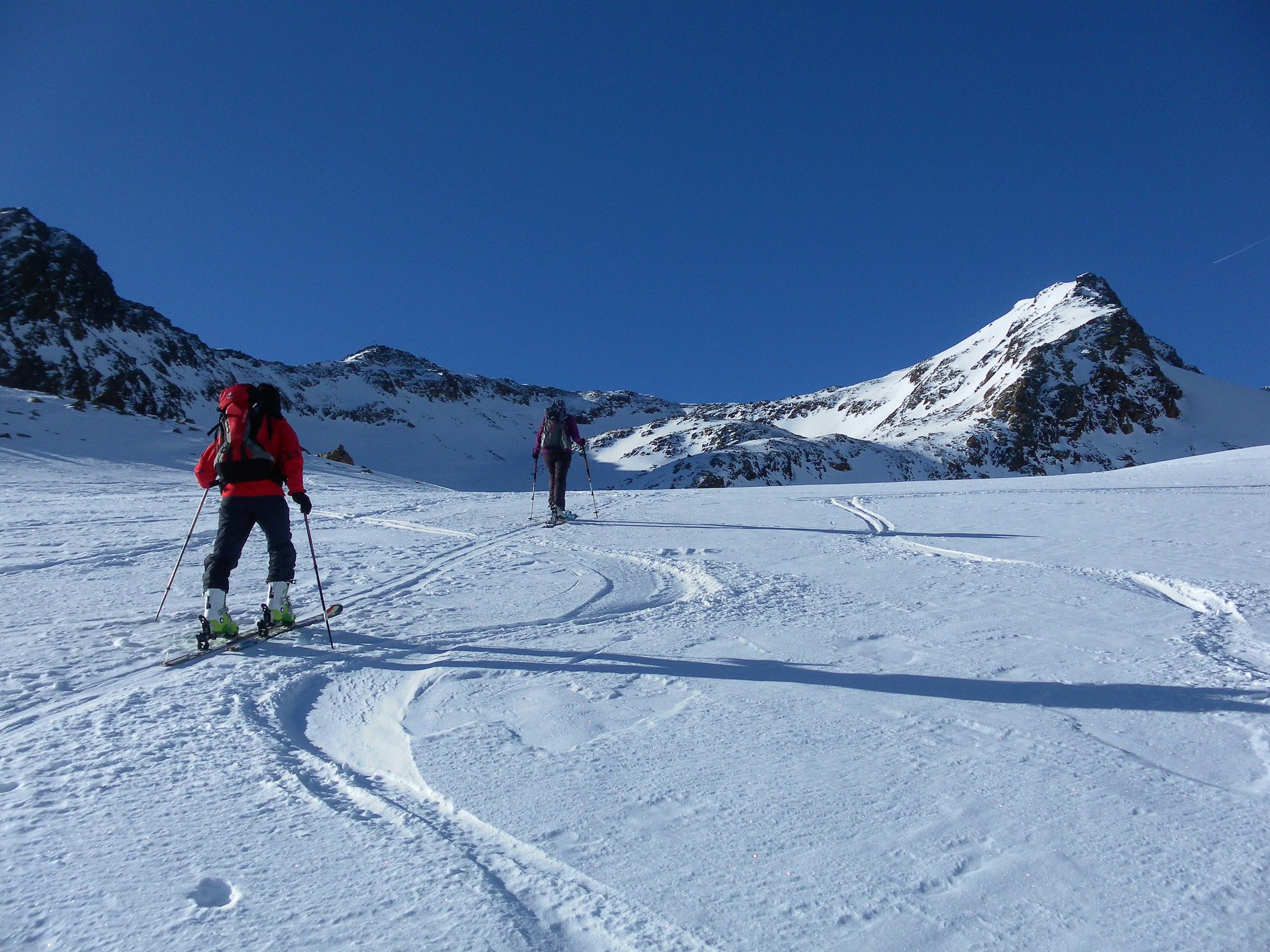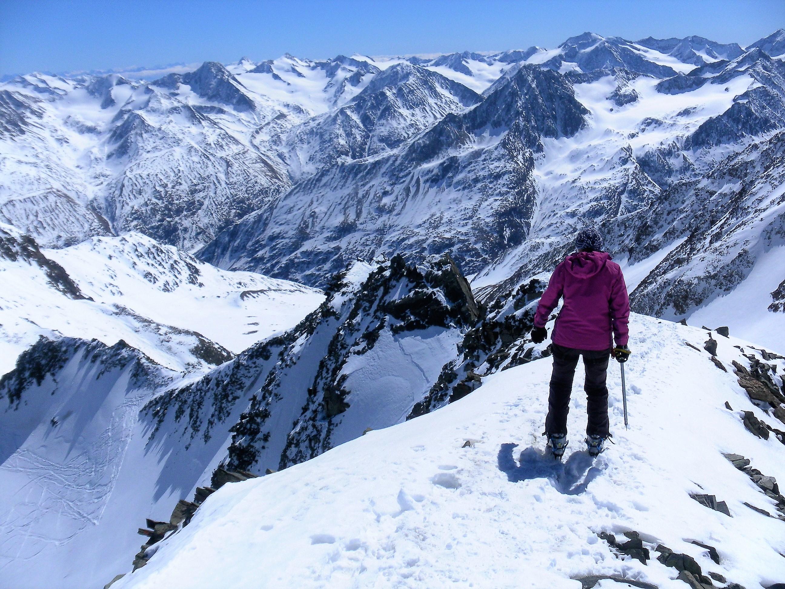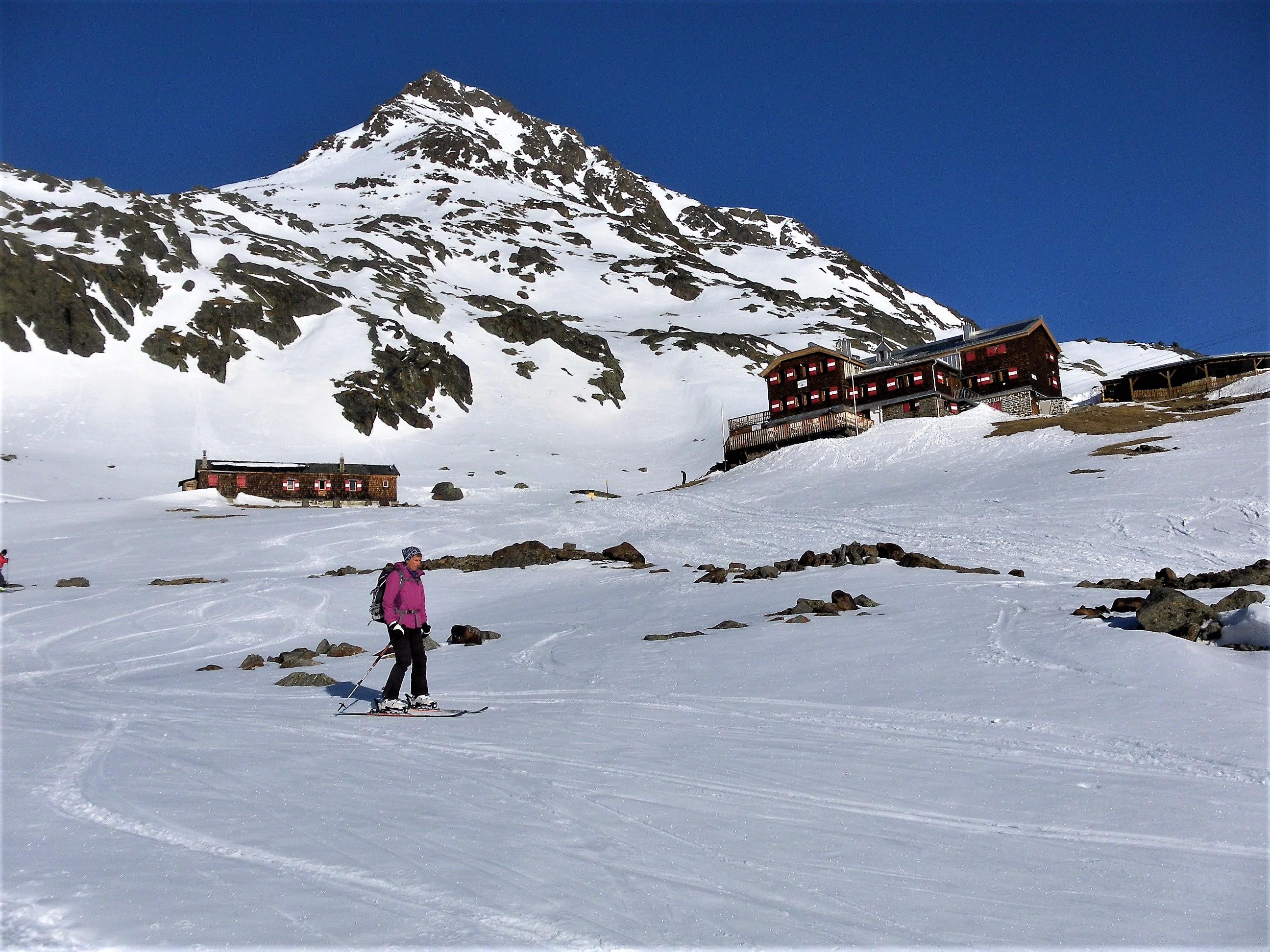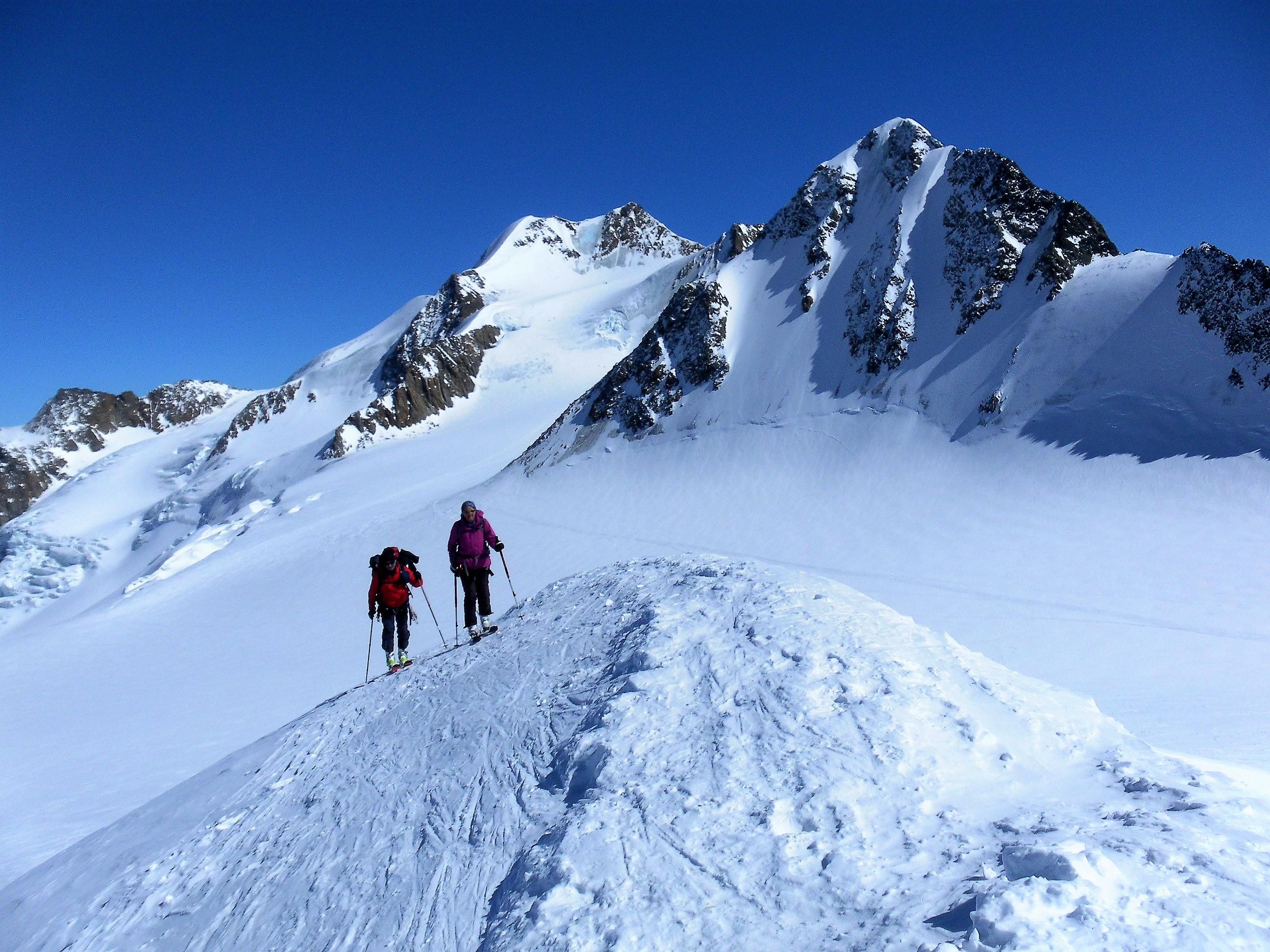 Der glänzend geführte Hochtourenstützpunkt Vernagthütte beschert uns vier traumhafte Skihochtourentage. Statt der vielbesuchten Wildspitze erreichen wir via Pitzexpress einsam den Hinteren Brochkogel (3628m) und die Petersenspitze (3462m) als Anreise zur Hütte. Von der Mittleren Guslarspitze (3128m) firnen wir zur Kaffeepause zum Hochjochhospiz hinab und von der Hinteren Guslarspitze ( 3147m) schwingen wir im Pulver zurück zur Vernagthütte. Am Fluchtkogel (3497m) entschließen wir uns für eine lange flache Gletscherwanderung (22km gesamt) zur Weißseespitze (3518m). Die Hochvernagtspitze (3535m) ist unser letztes Gipfelziel vor einer traumhaften Abfahrt vom Taschachjoch über den Sexegertenferner zurück nach Mittelberg.